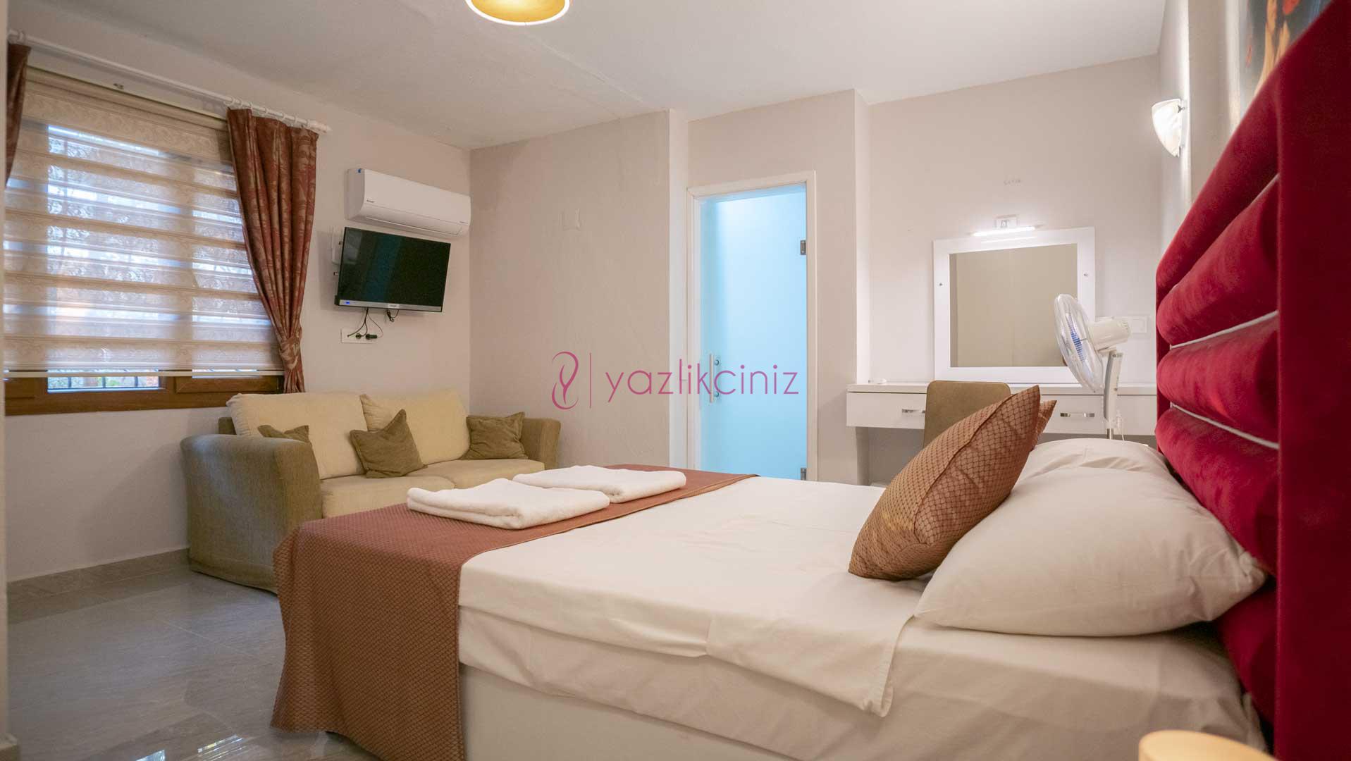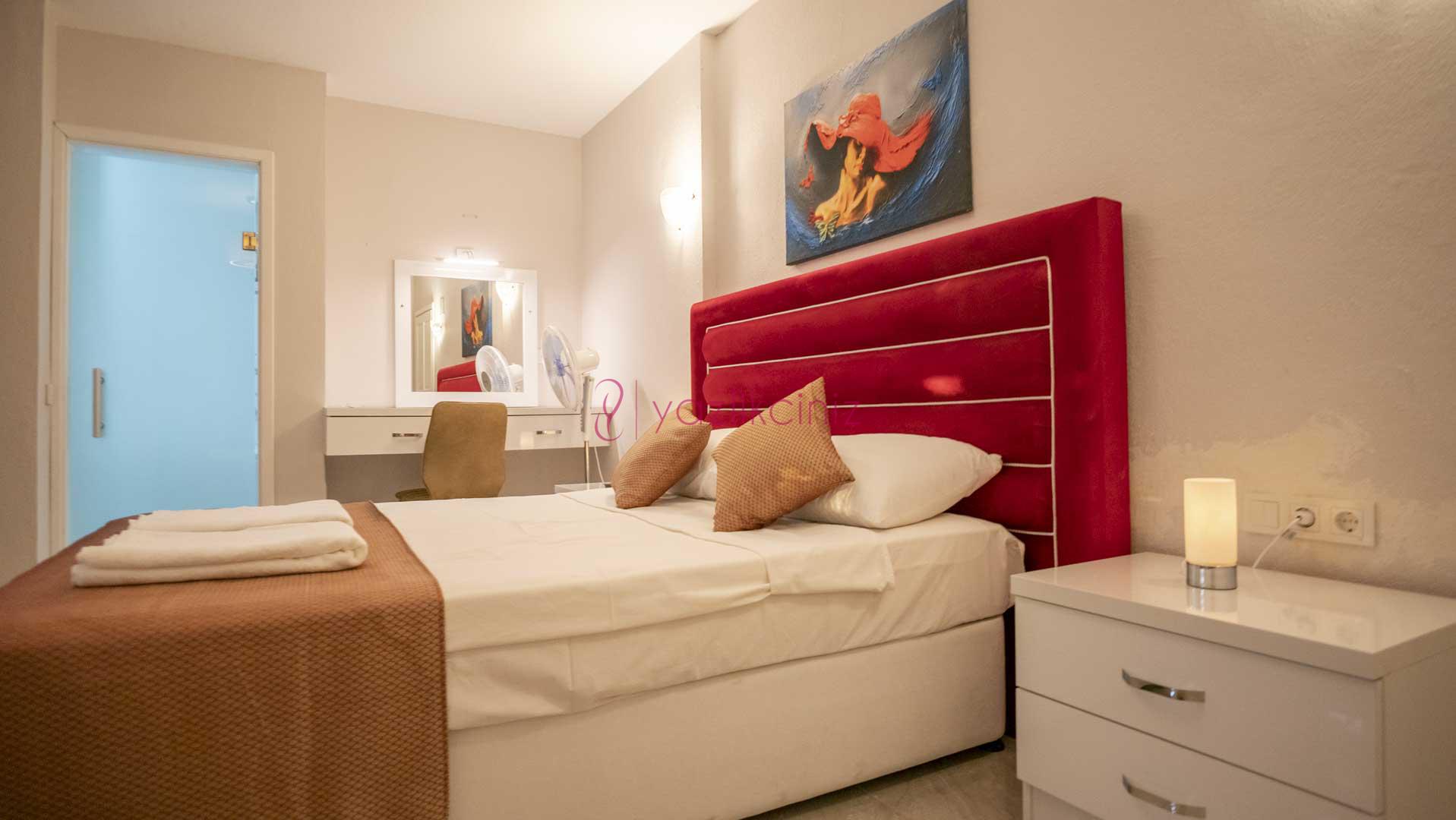 2. Yatak Odası: 2 adet tek kişilik yatak, komodin, elbise dolabı, makyaj masası, puf, klima, banyo ve wc bulunmaktadır.