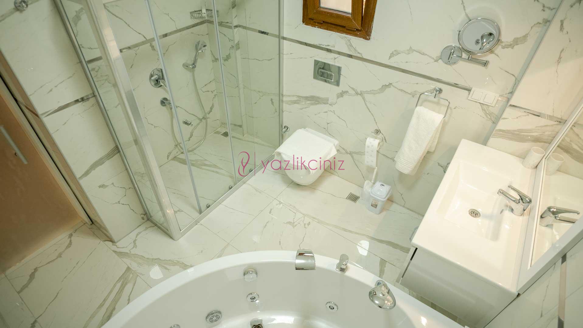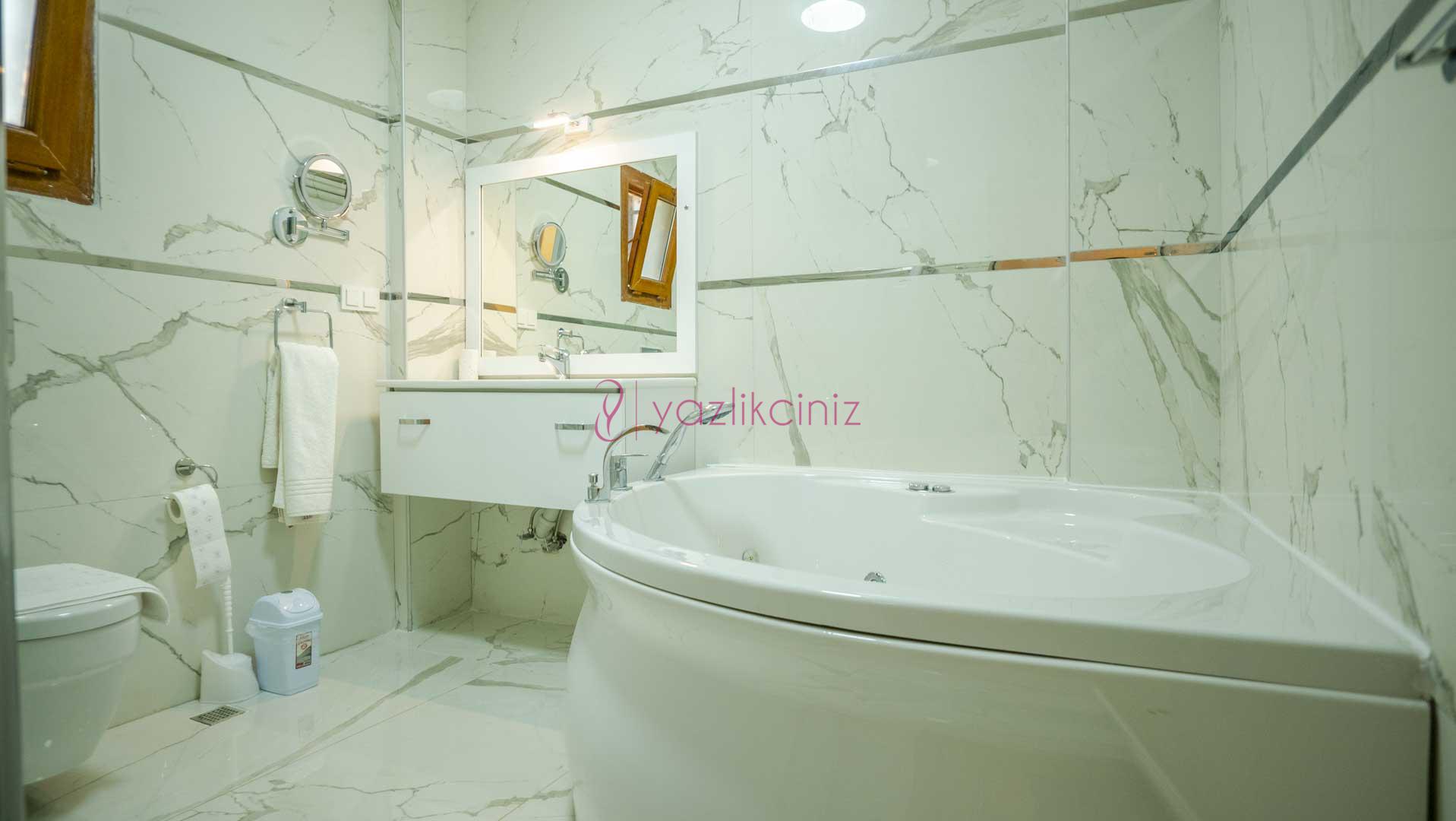 1. Yatak Odası: Çift kişilik yatak, komodin, elbise dolabı, makyaj masası, puf, TV, klima, jakuzi, banyo ve wc bulunmaktadır.