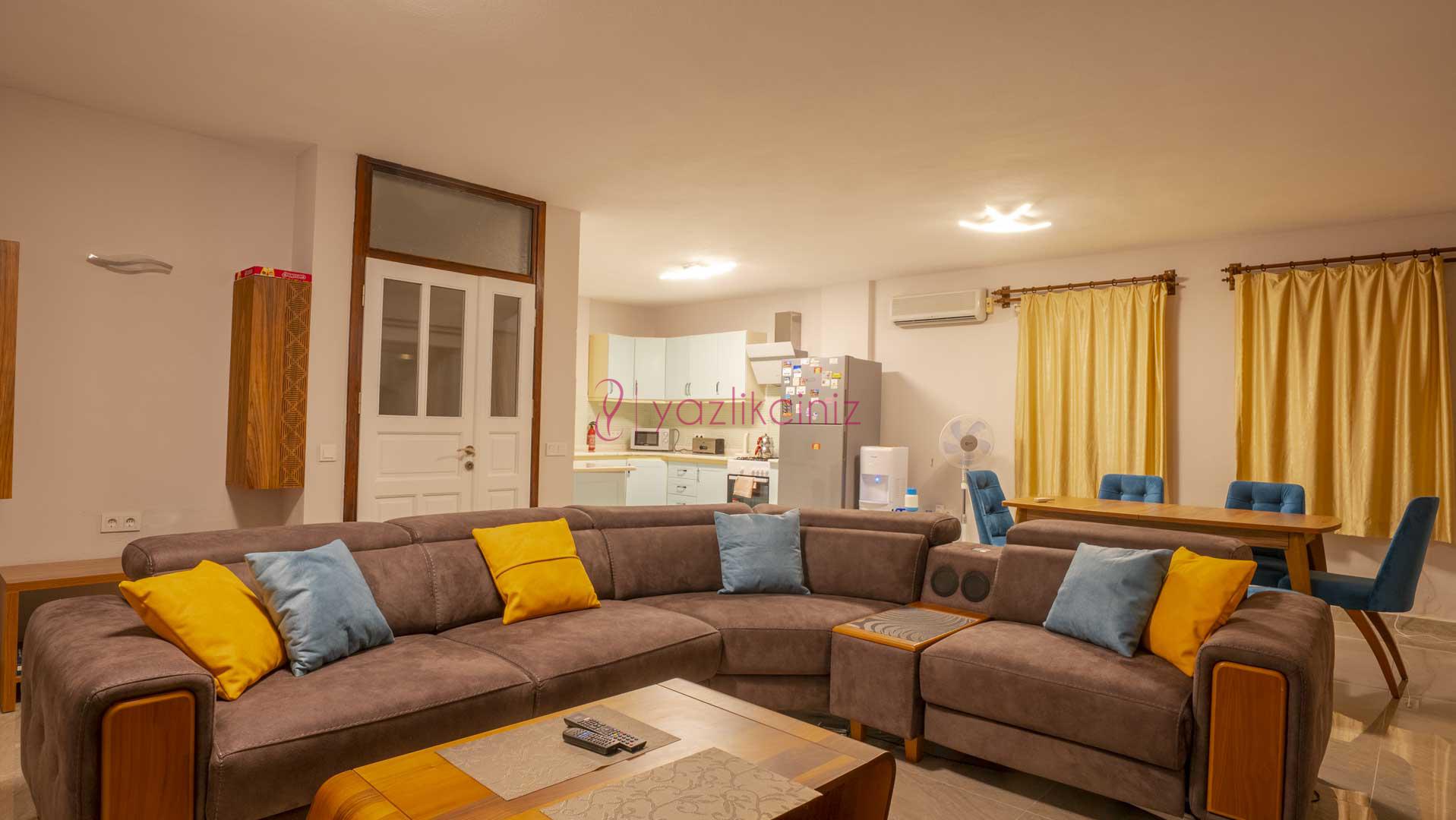 Deniz manzaralı ferah salonunda oturma grubu, plazma TV, uydu alıcısı, ütü ve ütü masası, yemek masası, klima ve havuz terasına çıkış bulunmaktadır.