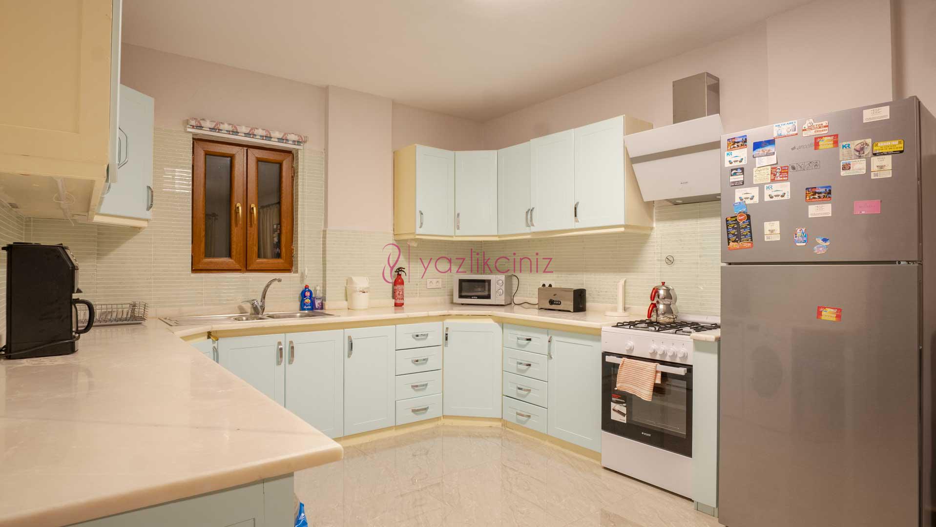 Amerikan mutfağında buzdolabı, çamaşır makinesi, bulaşık makinesi, ankastre fırın, mikrodalga fırın, 4lü ocak, ekmek kızartma makinesi, yemek takımı, mutfak araç gereçleri ve havuz terasına çıkısı bulunmaktadır.