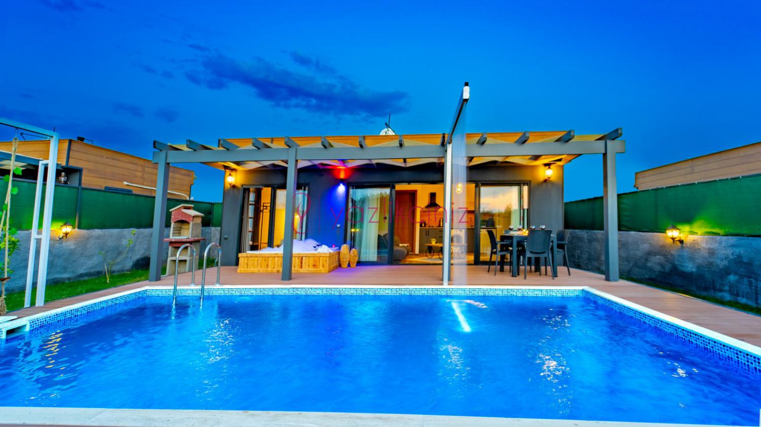 Havuz terası içerisinde jakuzi, havuz şelalesi, şezlong, barbekü, salıncak, yemek masası, loca bulunmaktadır.