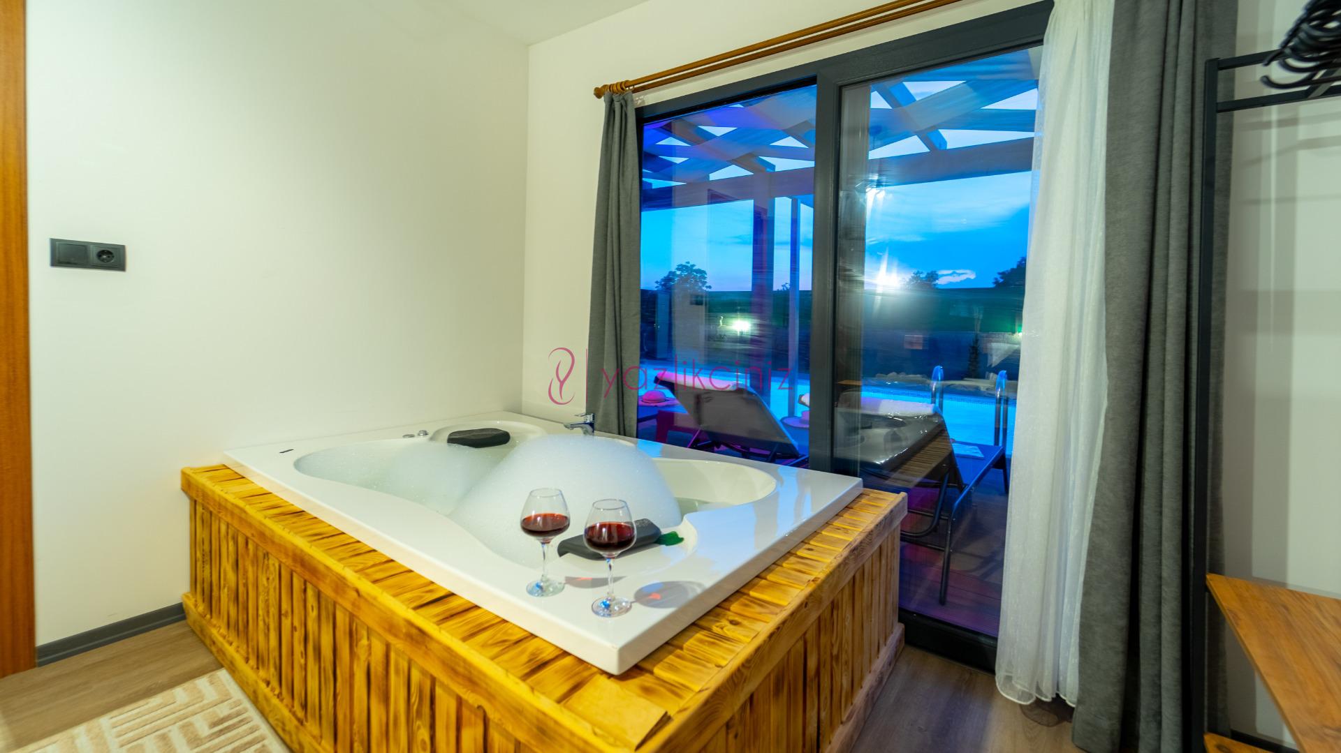 1.Yatak Odası: 1 adet çift kişilik yatak, klima, elbise askılığı, komodin, makyaj aynası, jakuzi ve havuz terasına çıkış bulunmaktadır. Tuvalet ve banyo oda dışarısındadır.