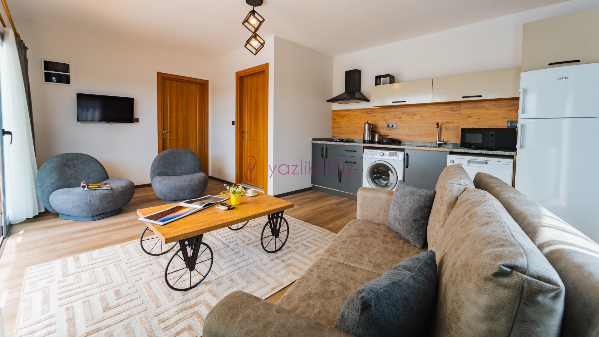 Salonda modern oturma grubu, orta sehpa, televizyon, kablosuz internet, klima, havuz terasına çıkış bulunmaktadır.