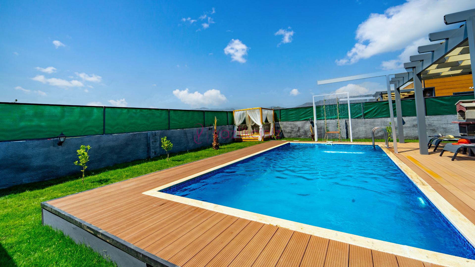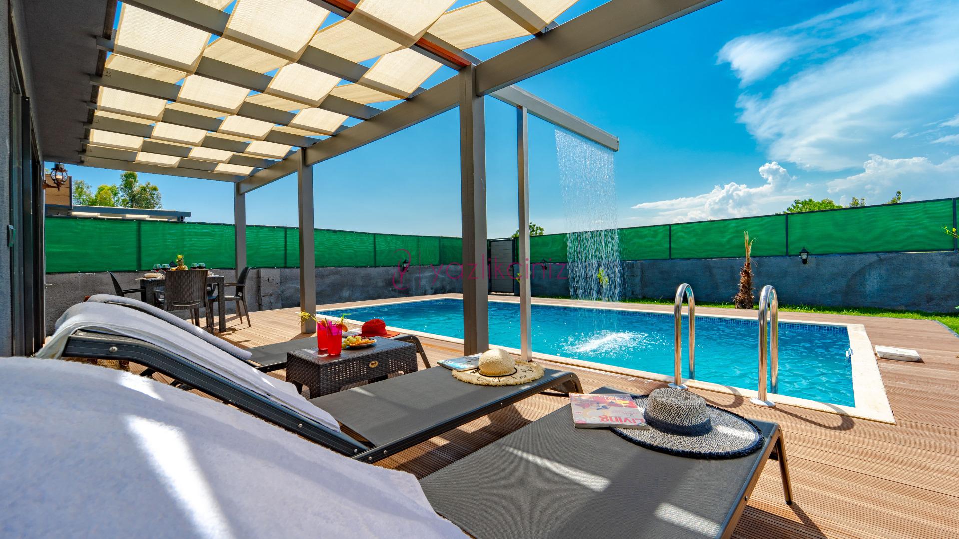Havuz terası içerisinde, havuz şelalesi, şezlong, barbekü, salıncak, yemek masası, loca bulunmaktadır.