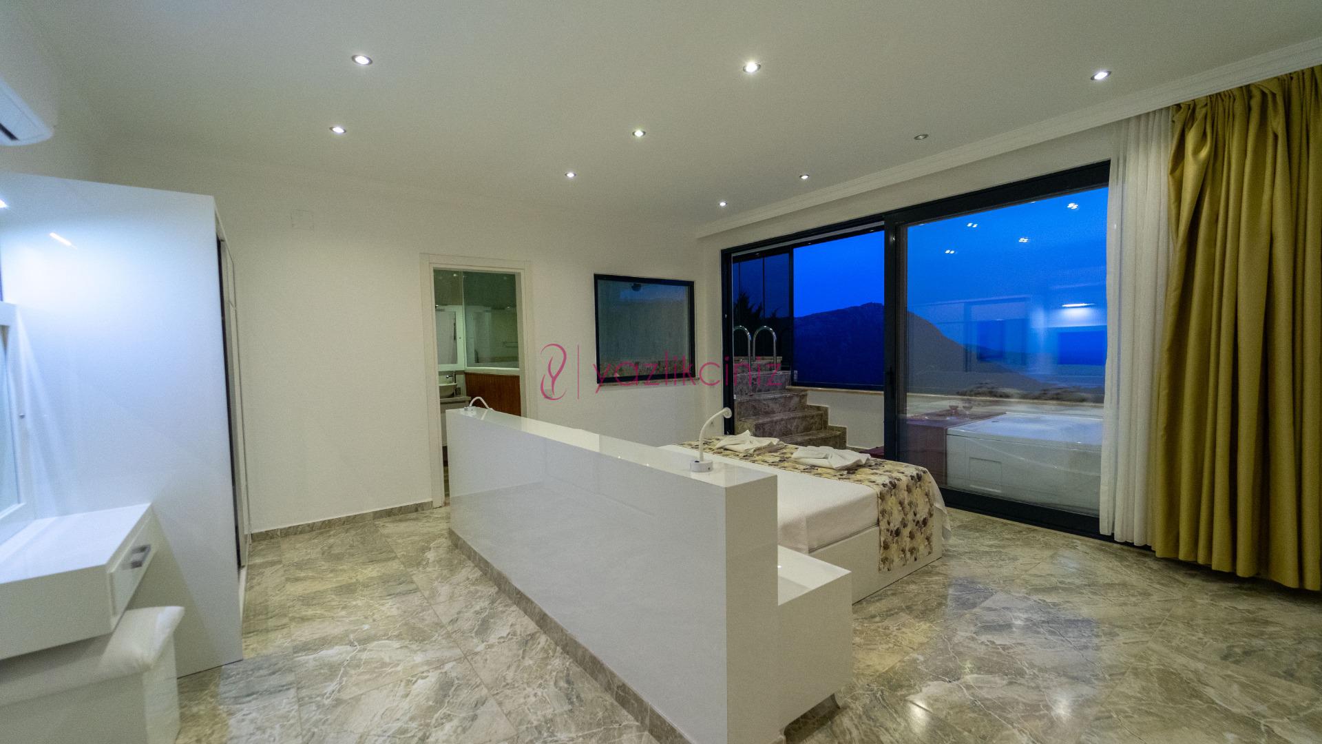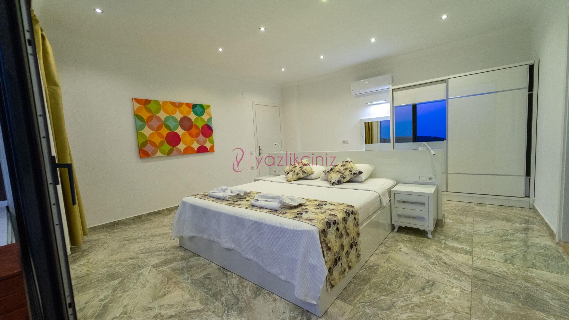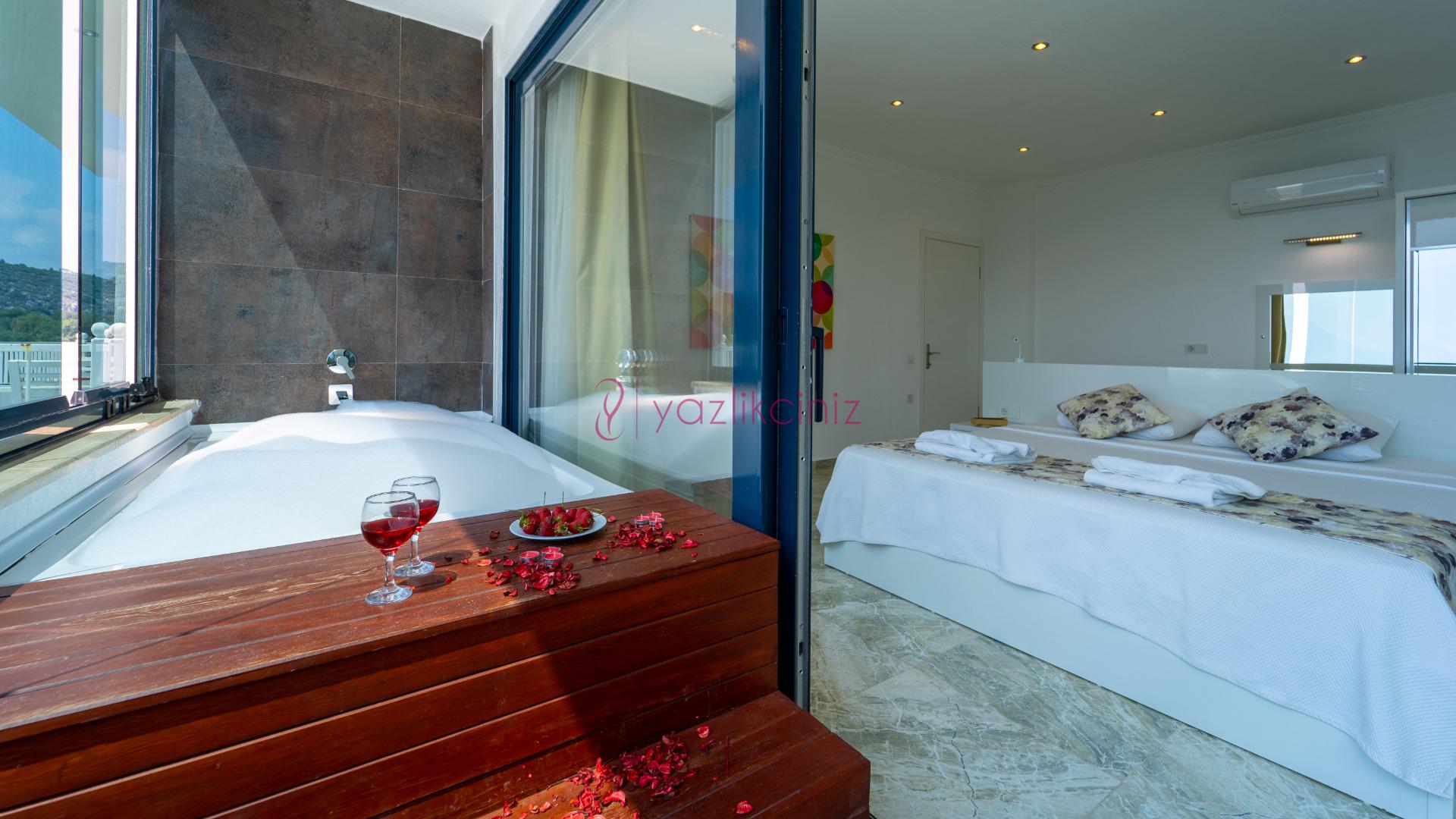 1. Yatak Odası: Çift kişilik suit yatak odası, klima, elbise dolabı, komodin, makyaj masası, jakuzi, ısıtmalı havuz, banyo ve tuvalet bulunmaktadır.
