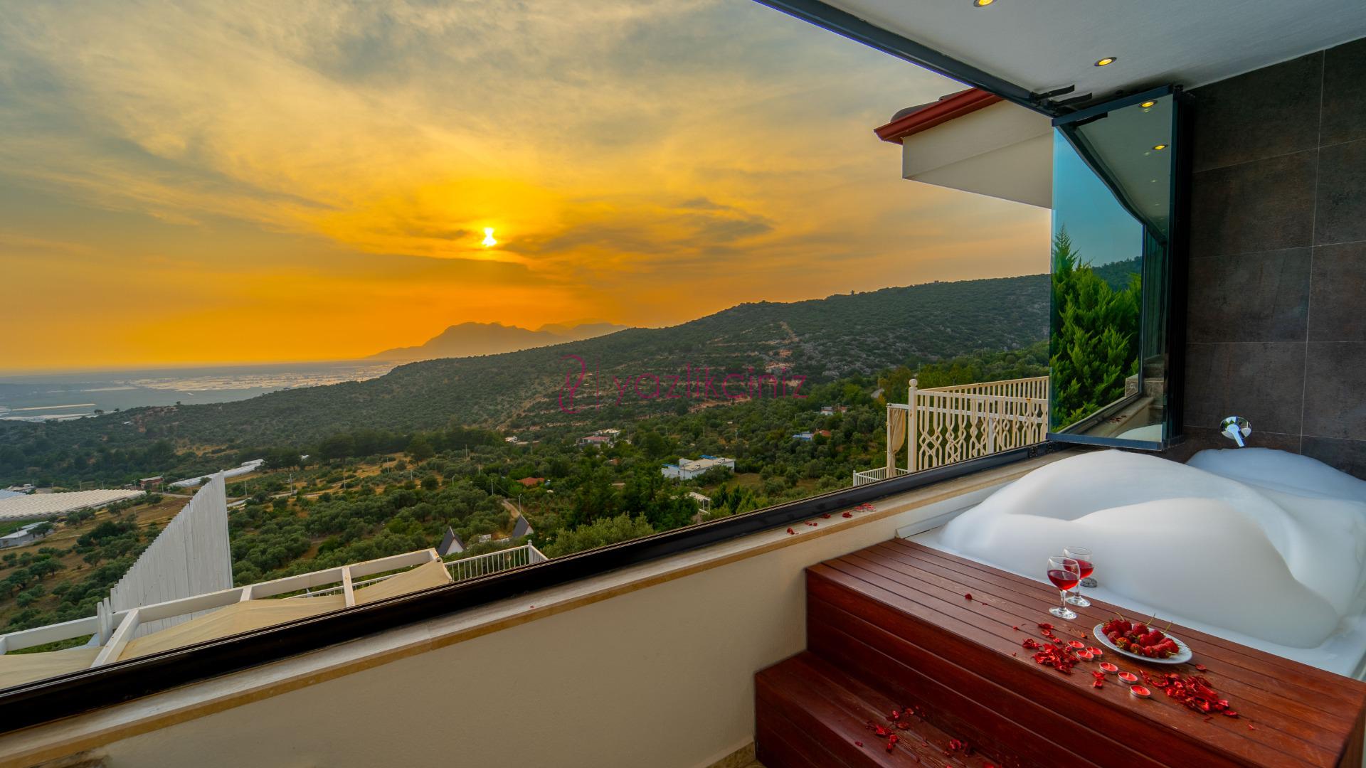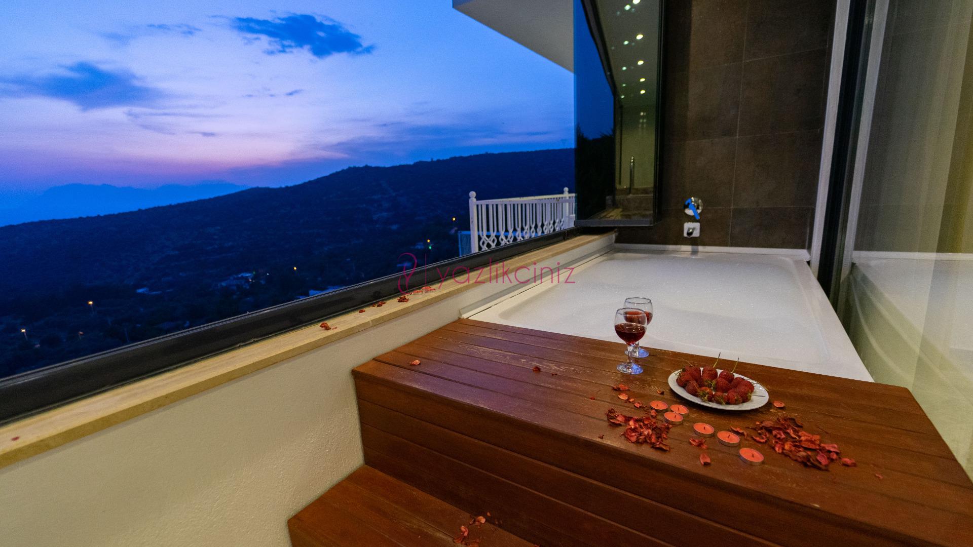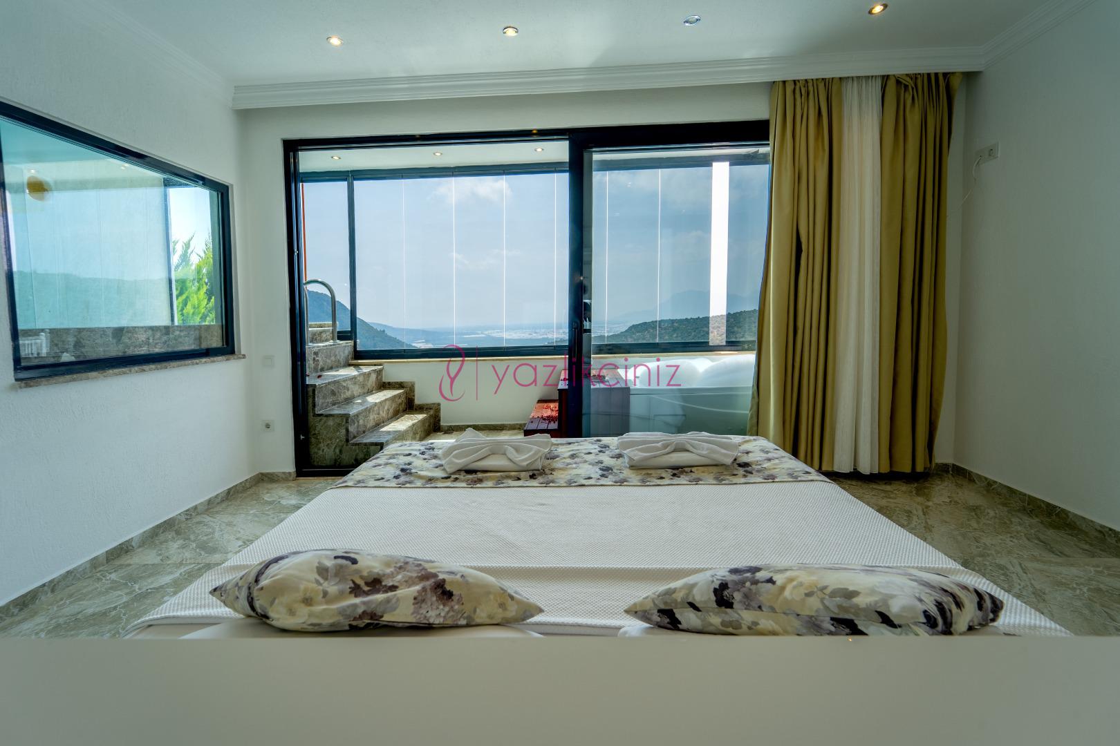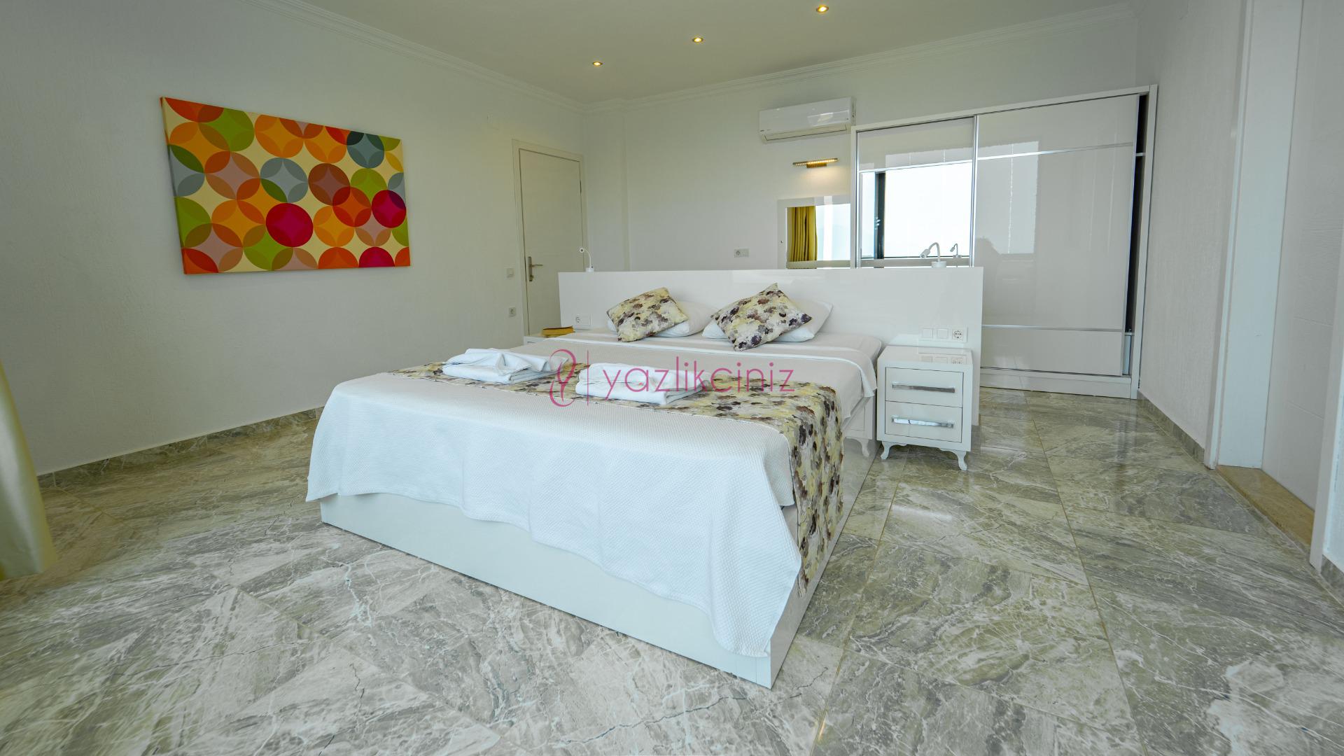 1. Yatak Odası: Çift kişilik suit yatak odası, klima, elbise dolabı, komodin, makyaj masası, jakuzi, ısıtmalı havuz, banyo ve tuvalet bulunmaktadır.