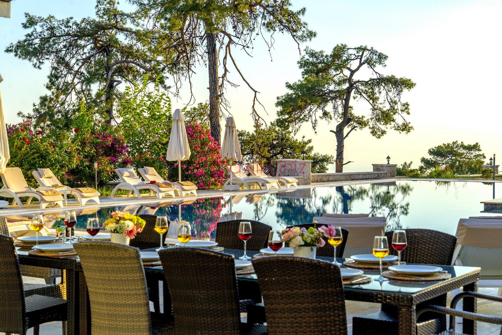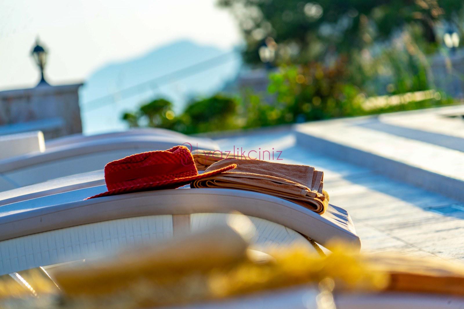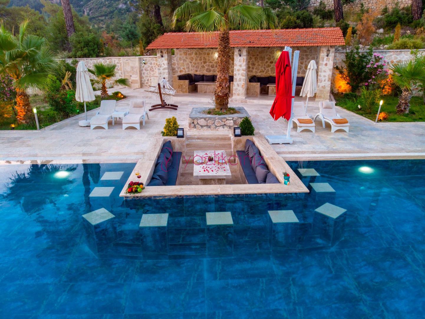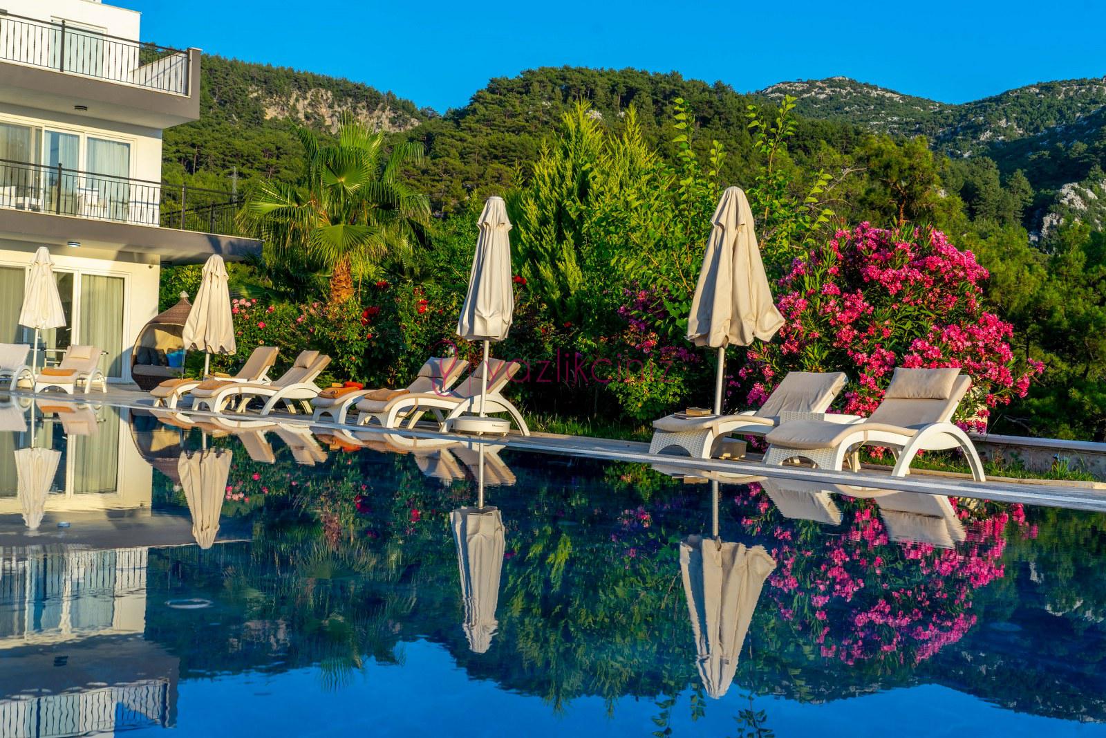 Havuz başında şezlong, şemsiye, mangal, masa ve sandalyeler bulunmaktadır.