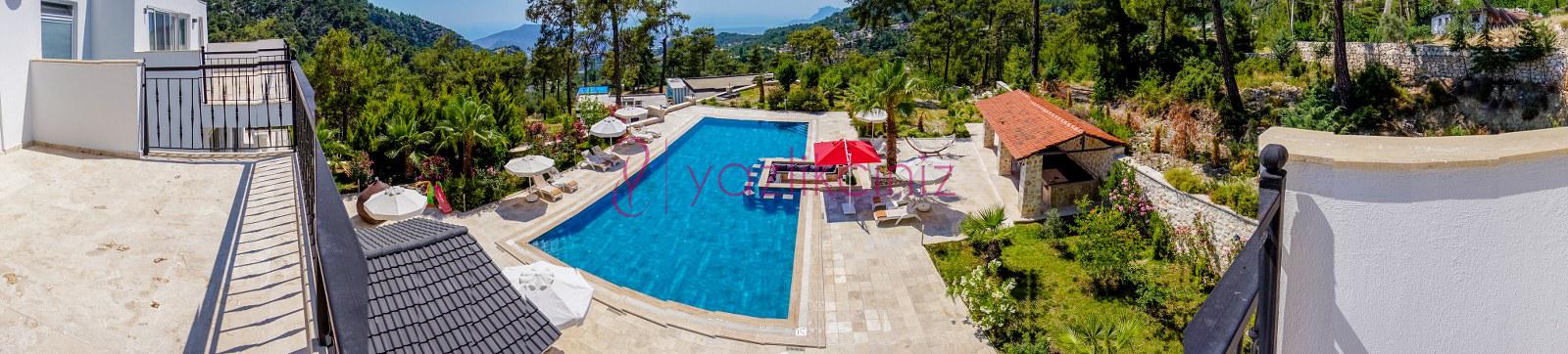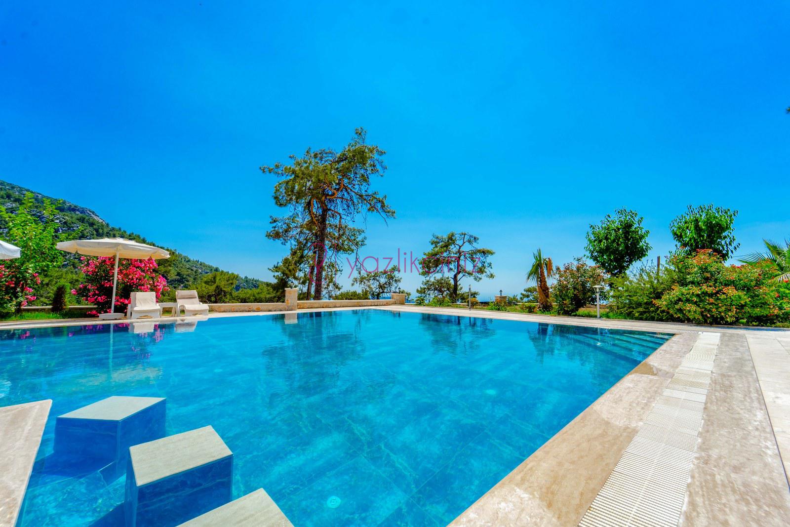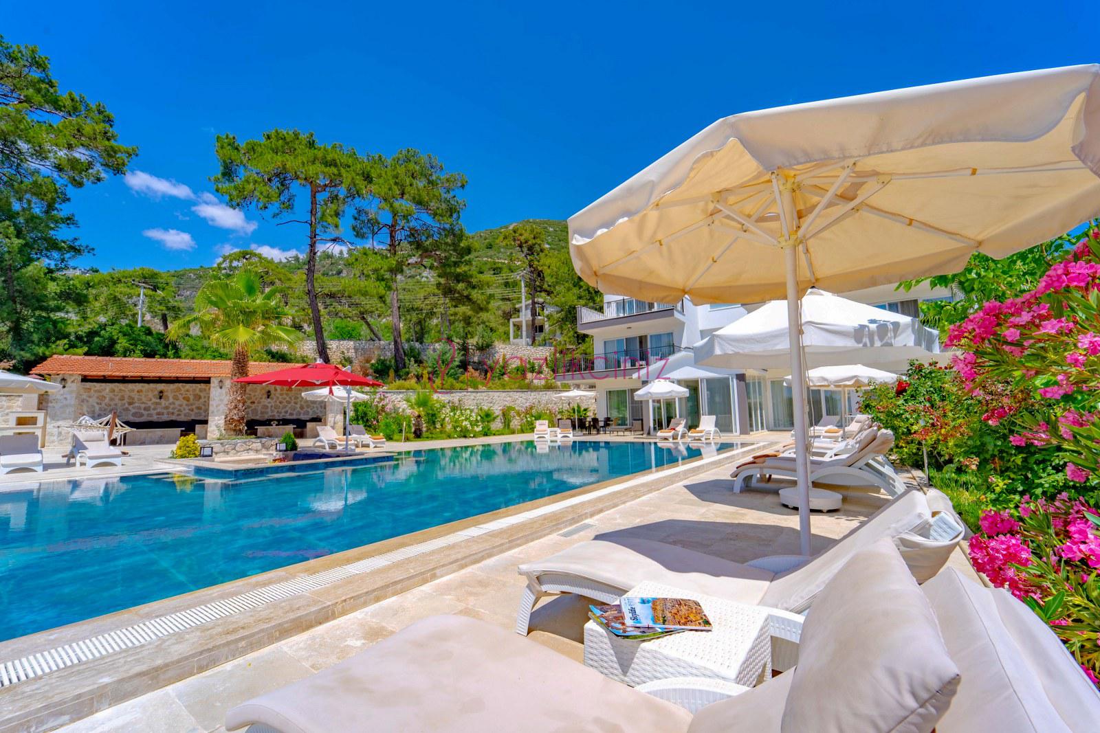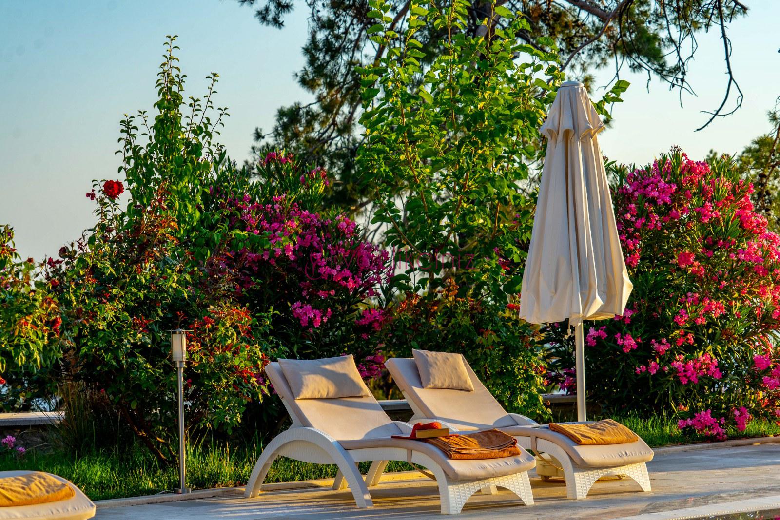 Havuz başında şezlong, şemsiye, mangal, masa ve sandalyeler bulunmaktadır.