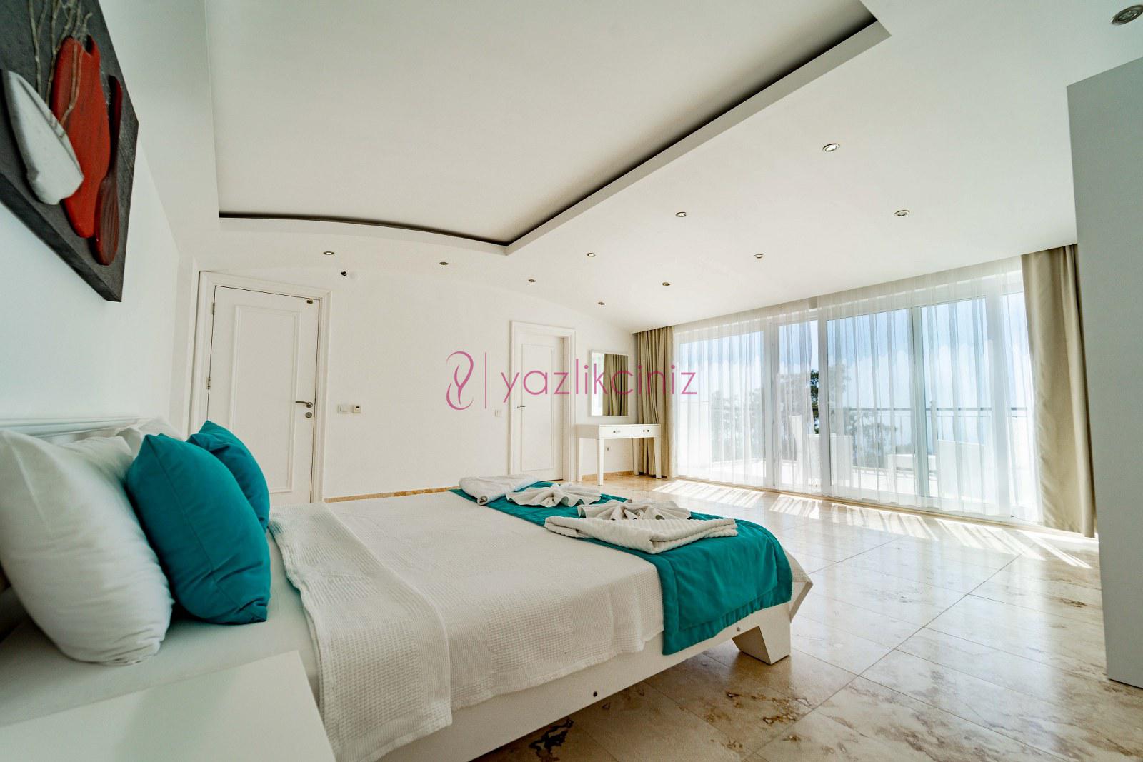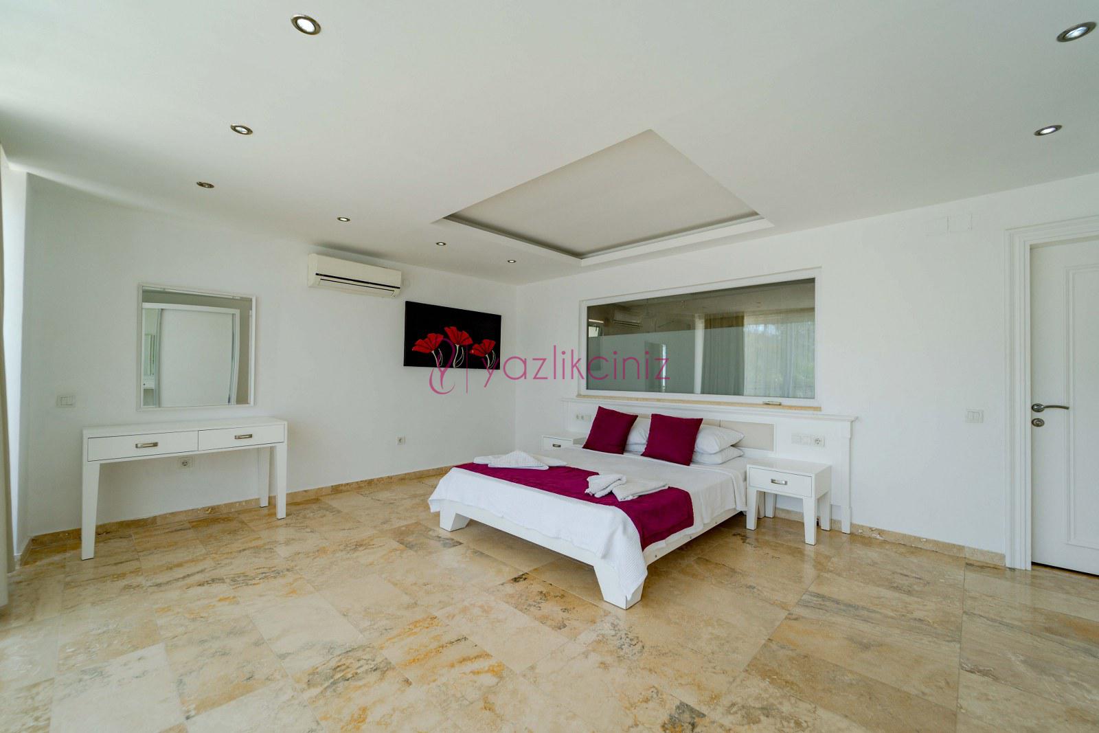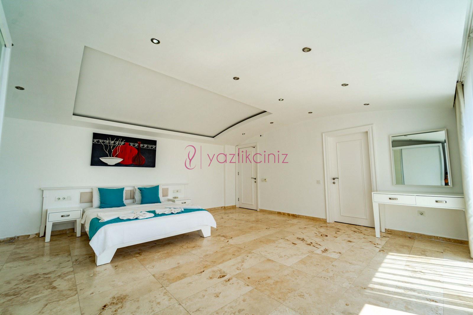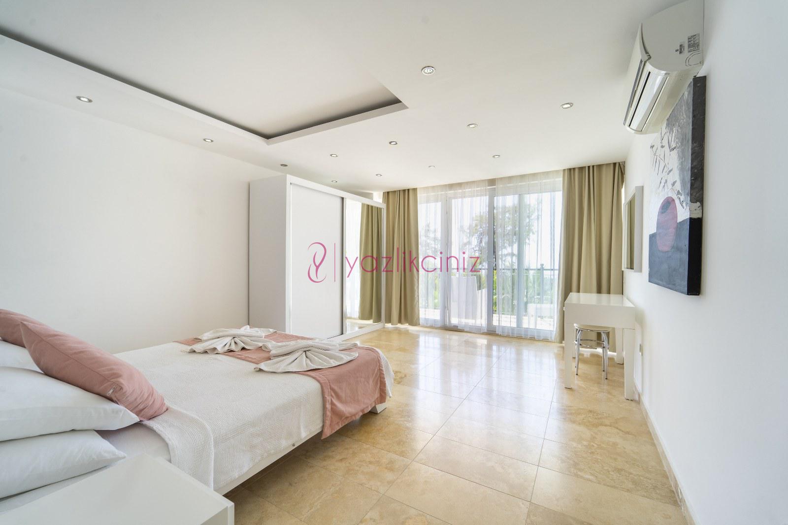 Yatak Odası 5: Suit doğa manzaralı odada çift kişilik yatak, komodin, klima, makyaj masası, elbise dolabı, ebeveyn banyosu bulunmaktadır.