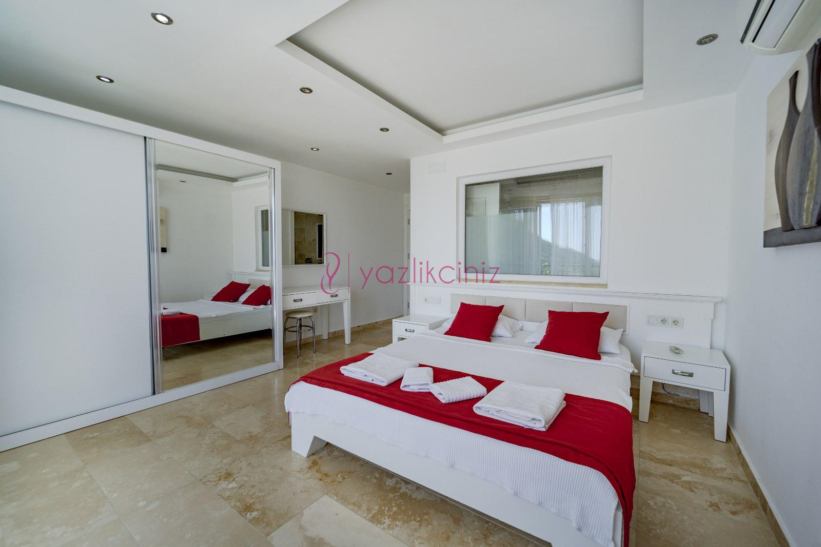 Yatak Odası 1: Suit doğa manzaralı odada çift kişilik yatak, komodin, klima, makyaj masası, elbise dolabı, ebeveyn banyosu bulunmaktadır.