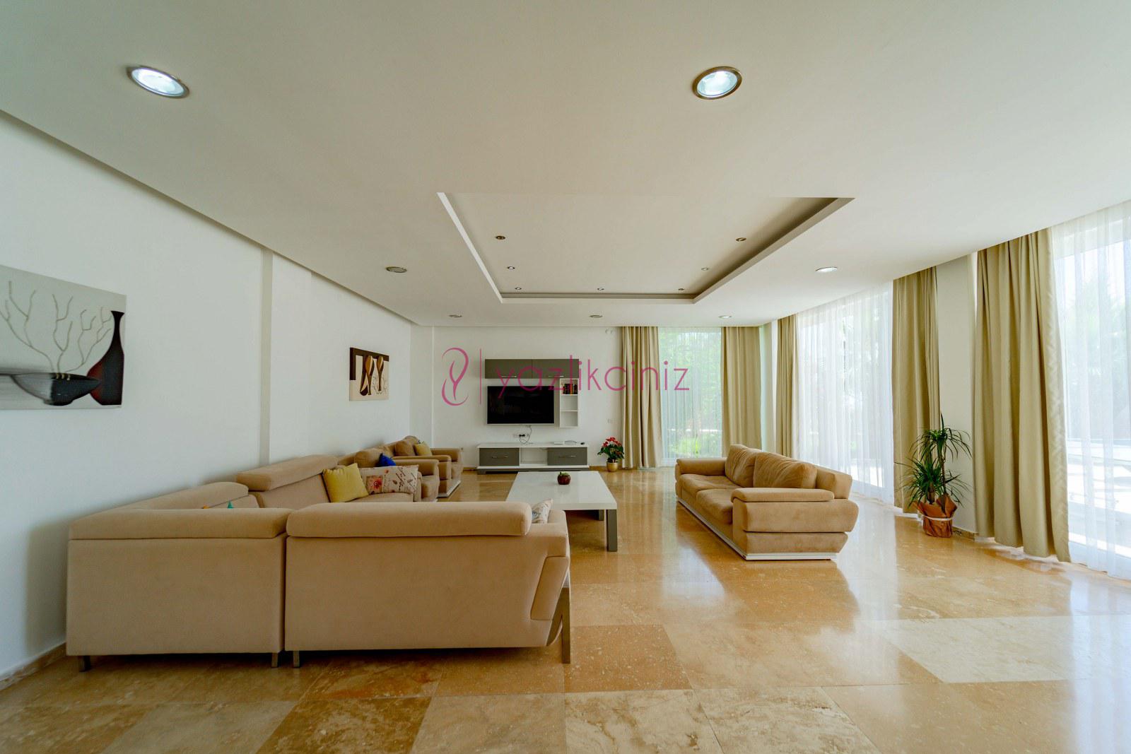 Doğa manzaralı salonunda oturma grubu, plazma TV, uydu alıcısı, klima, ütü ve ütü masası, sehpa, yemek masası ve havuz başına çıkış bulunmaktadır.