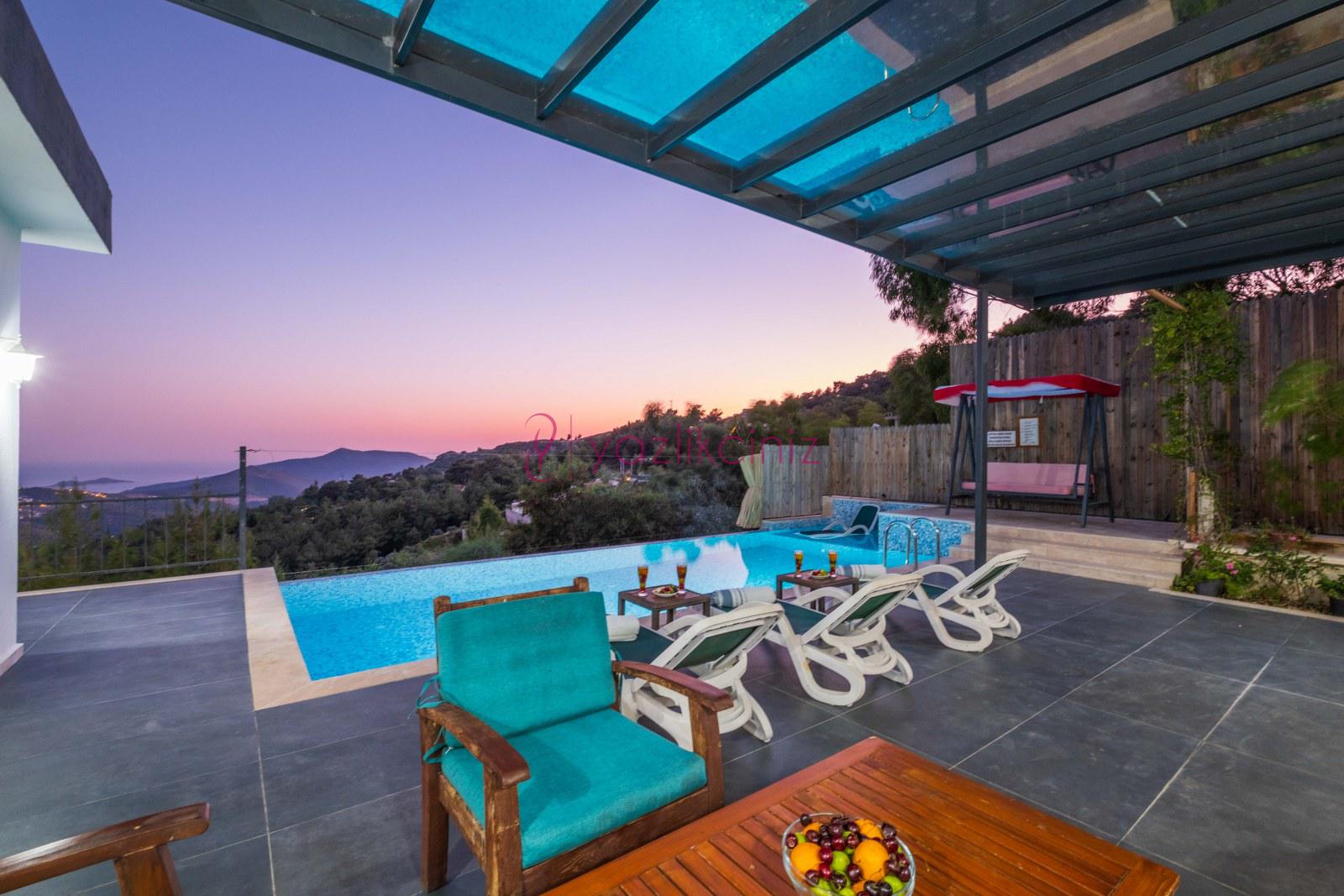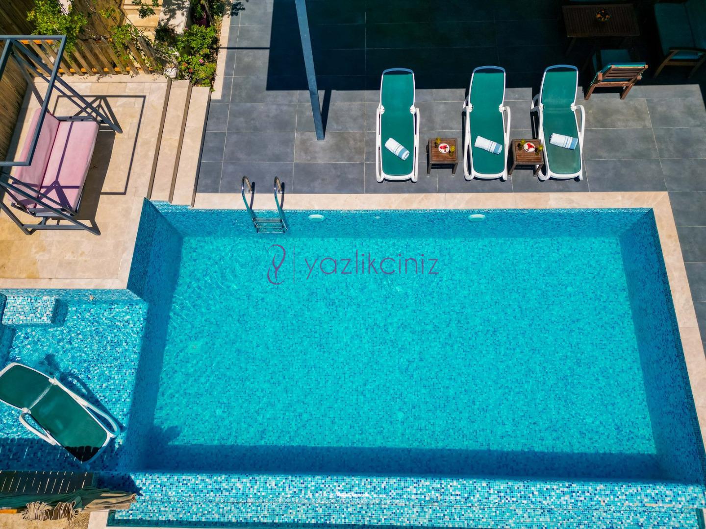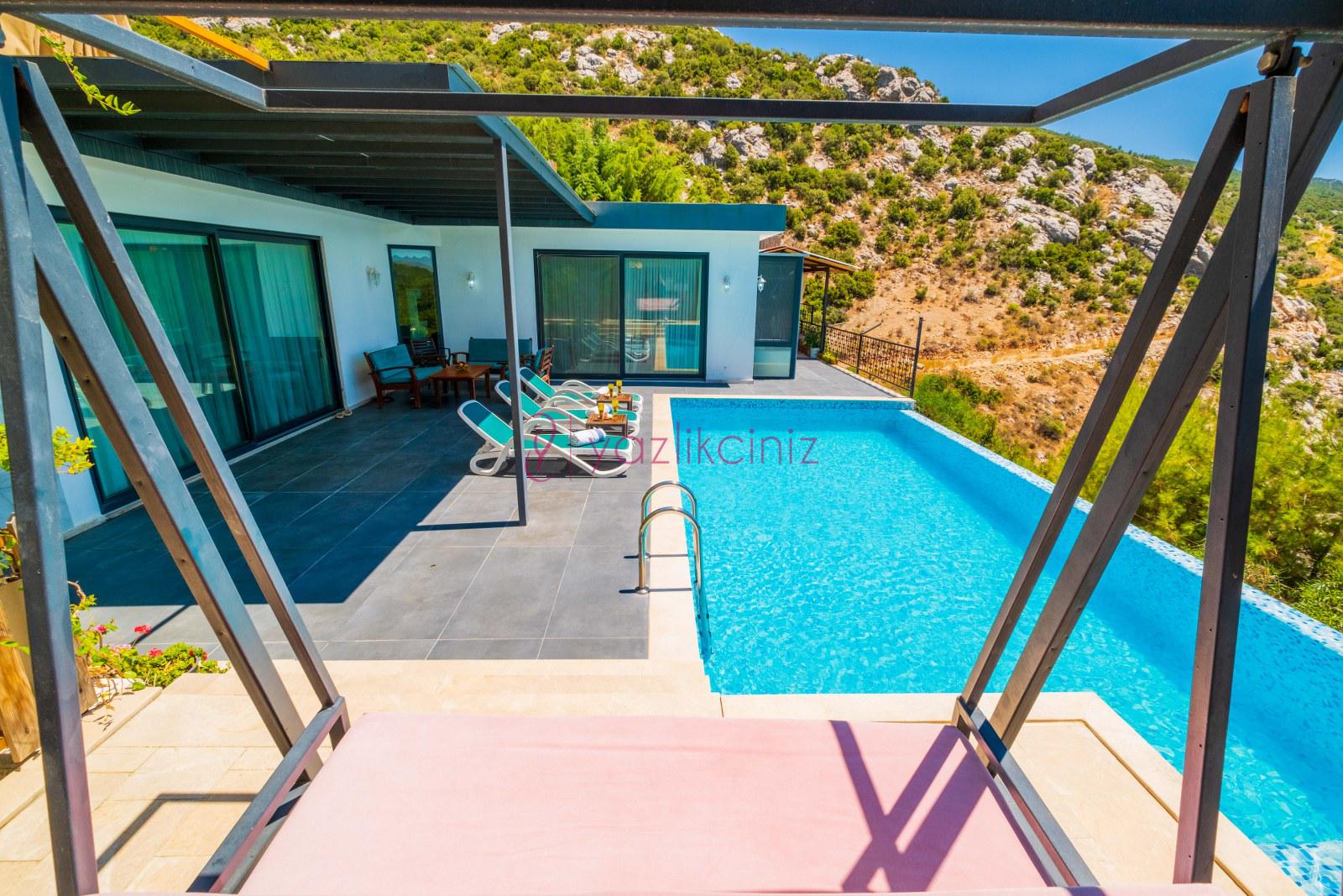 Villanin güneslenme terasi ve havuzunun dis taraftan görünmemesi için gerekli önlemler alinmistir fakat villanin diger bölümlerinin görünürlügü kesin olarak garanti edilememektedir.