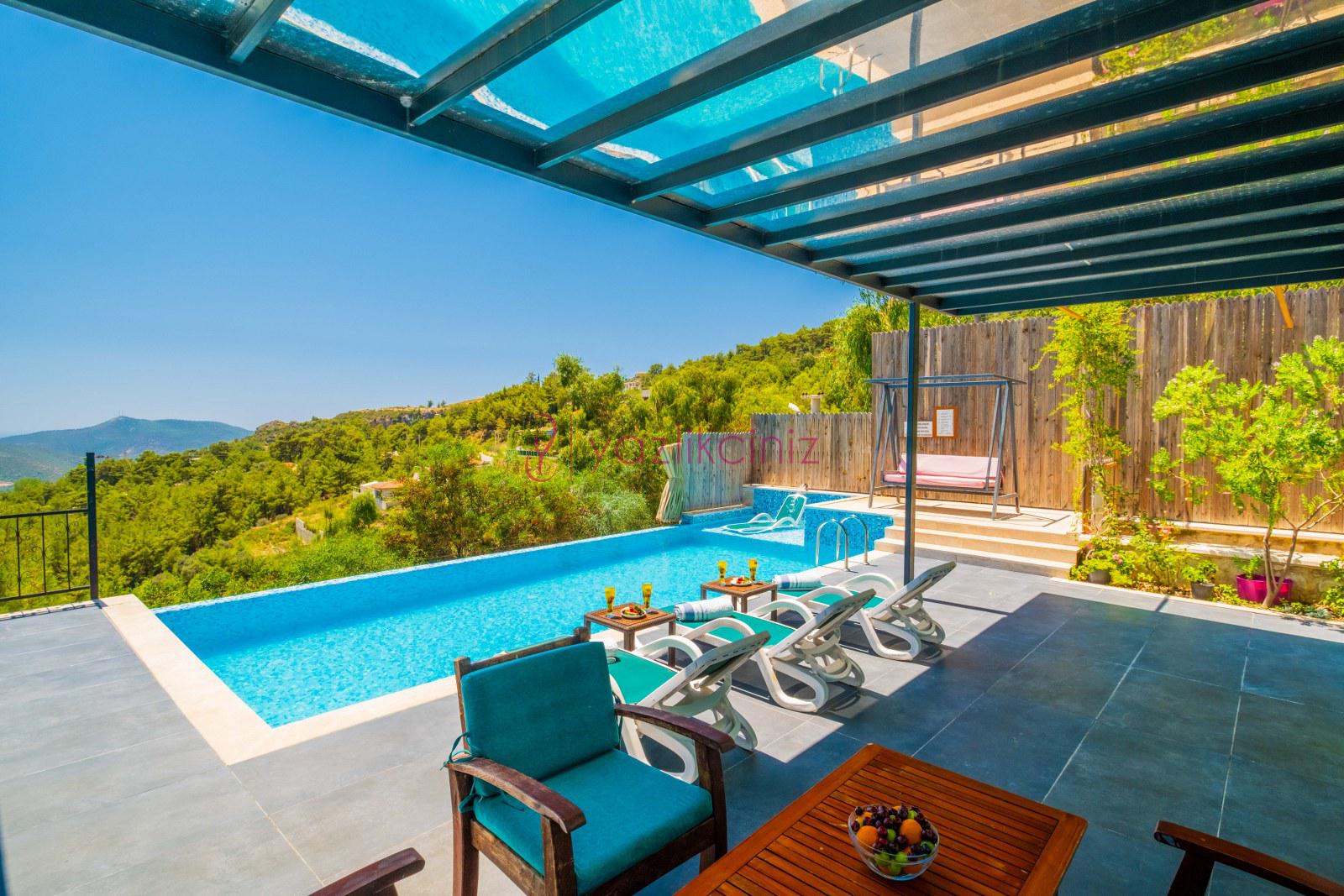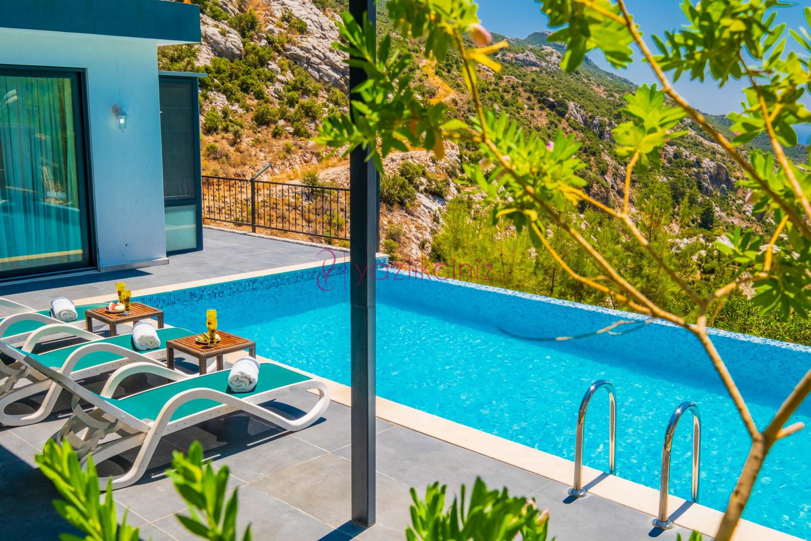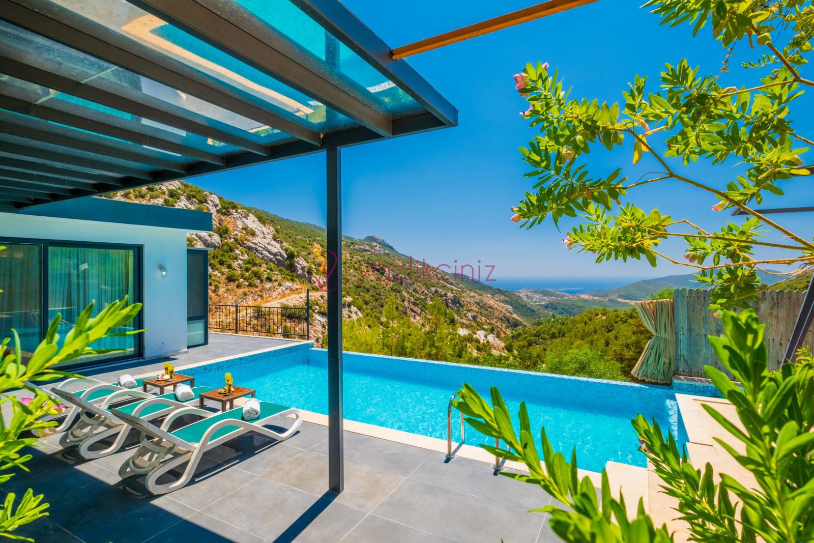 Villanin güneslenme terasi ve havuzunun dis taraftan görünmemesi için gerekli önlemler alinmistir fakat villanin diger bölümlerinin görünürlügü kesin olarak garanti edilememektedir.