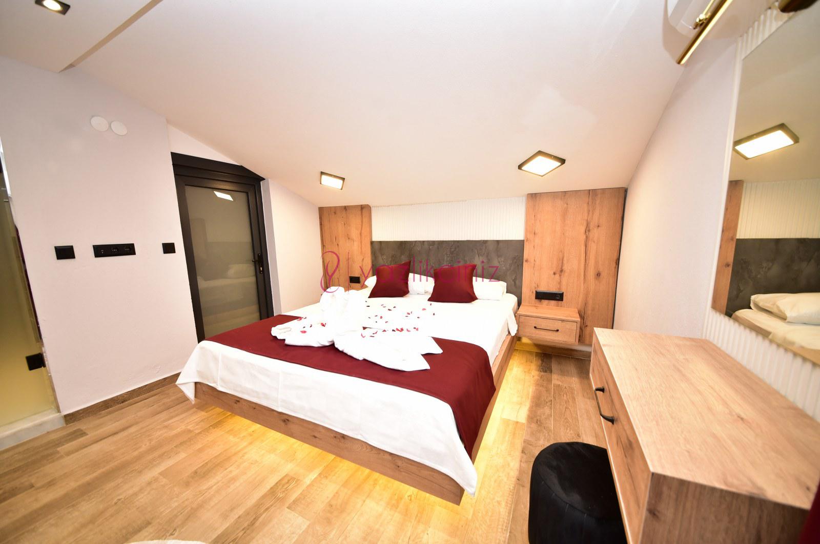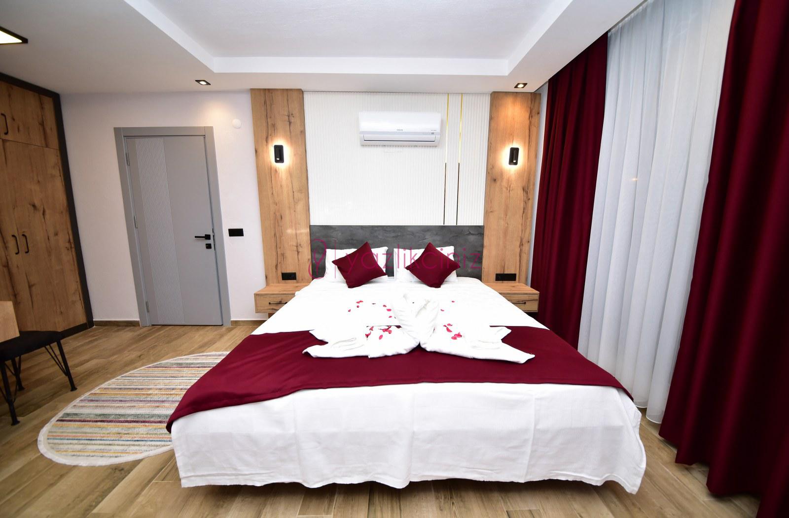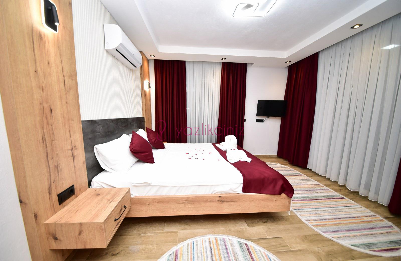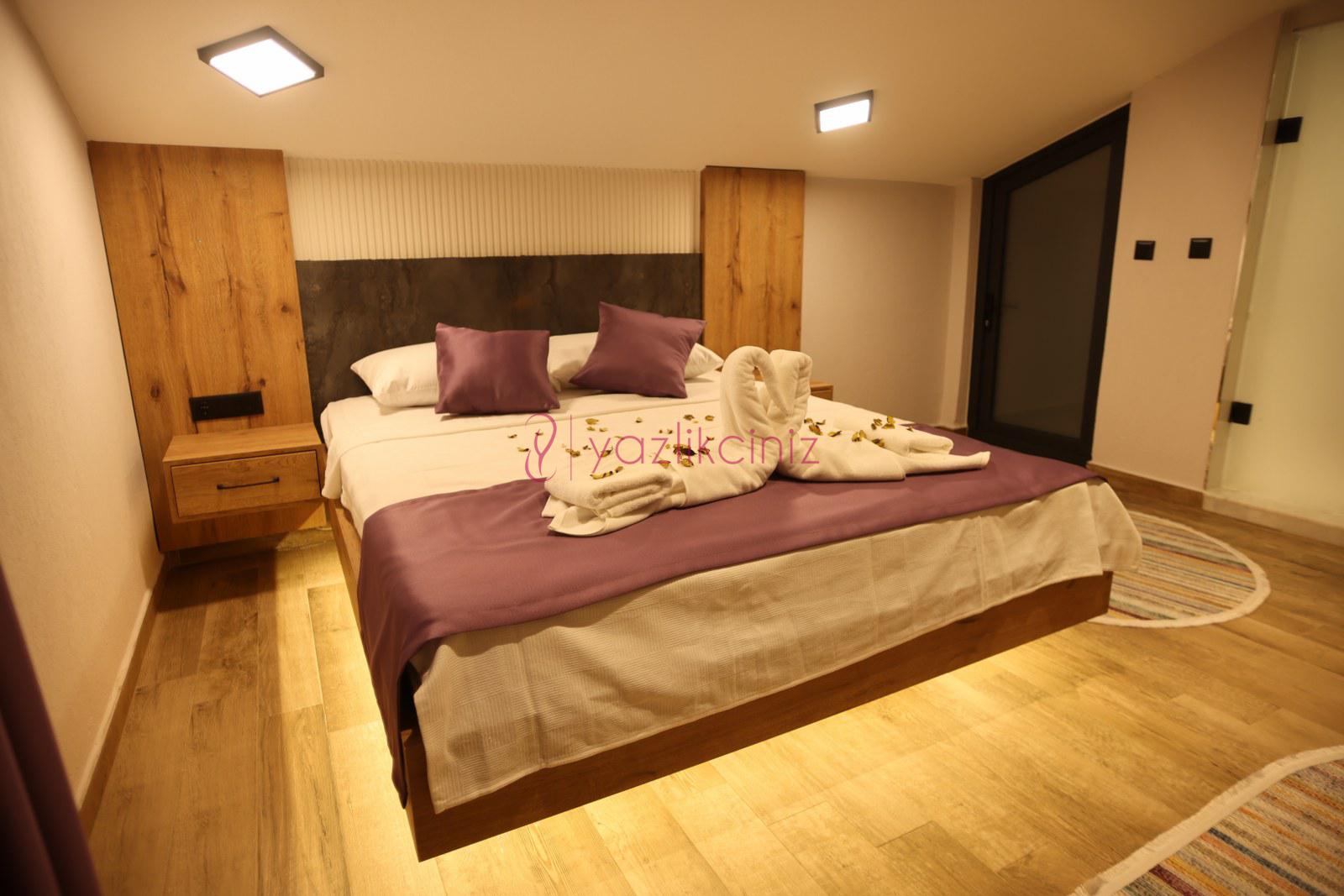 1. Yatak Odası: En suit,1 adet çift kişilik yatak, komodin, klima, jakuzi, makyaj masası, tuvalet ve banyo bulunmaktadır.