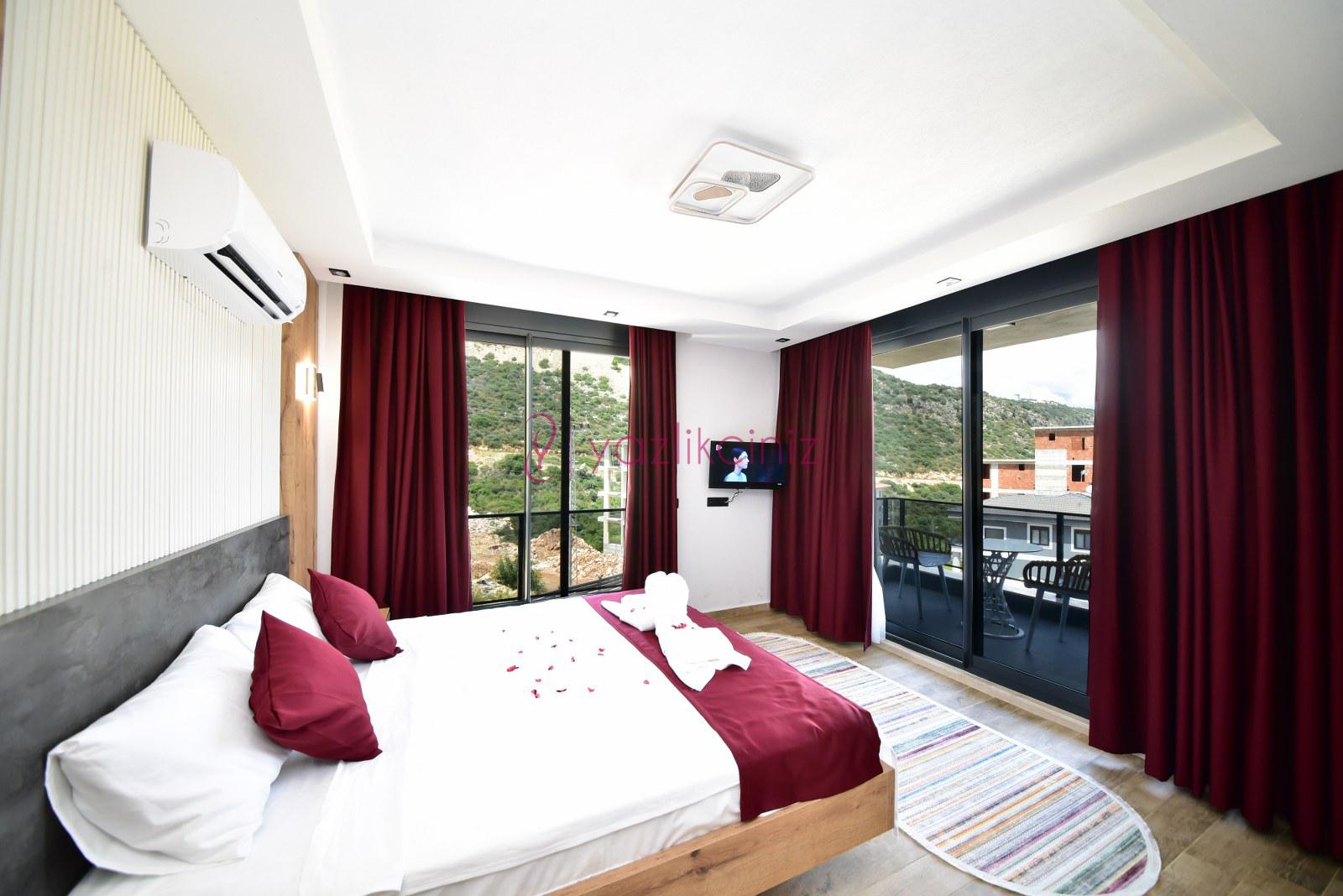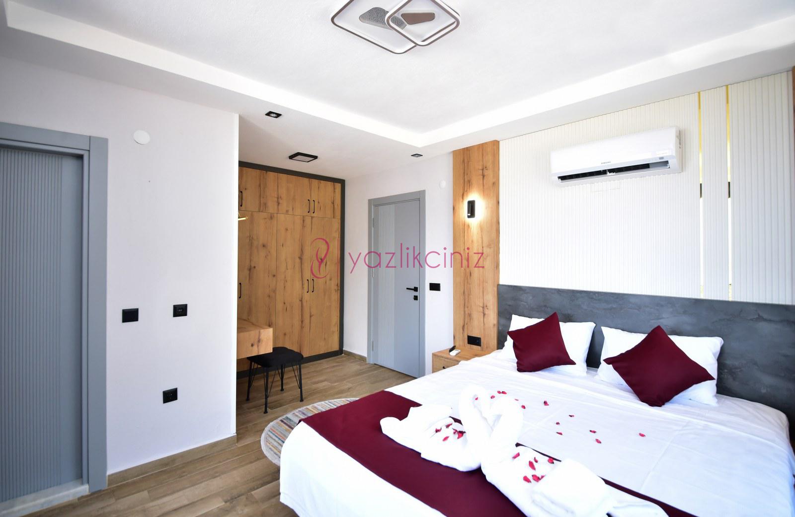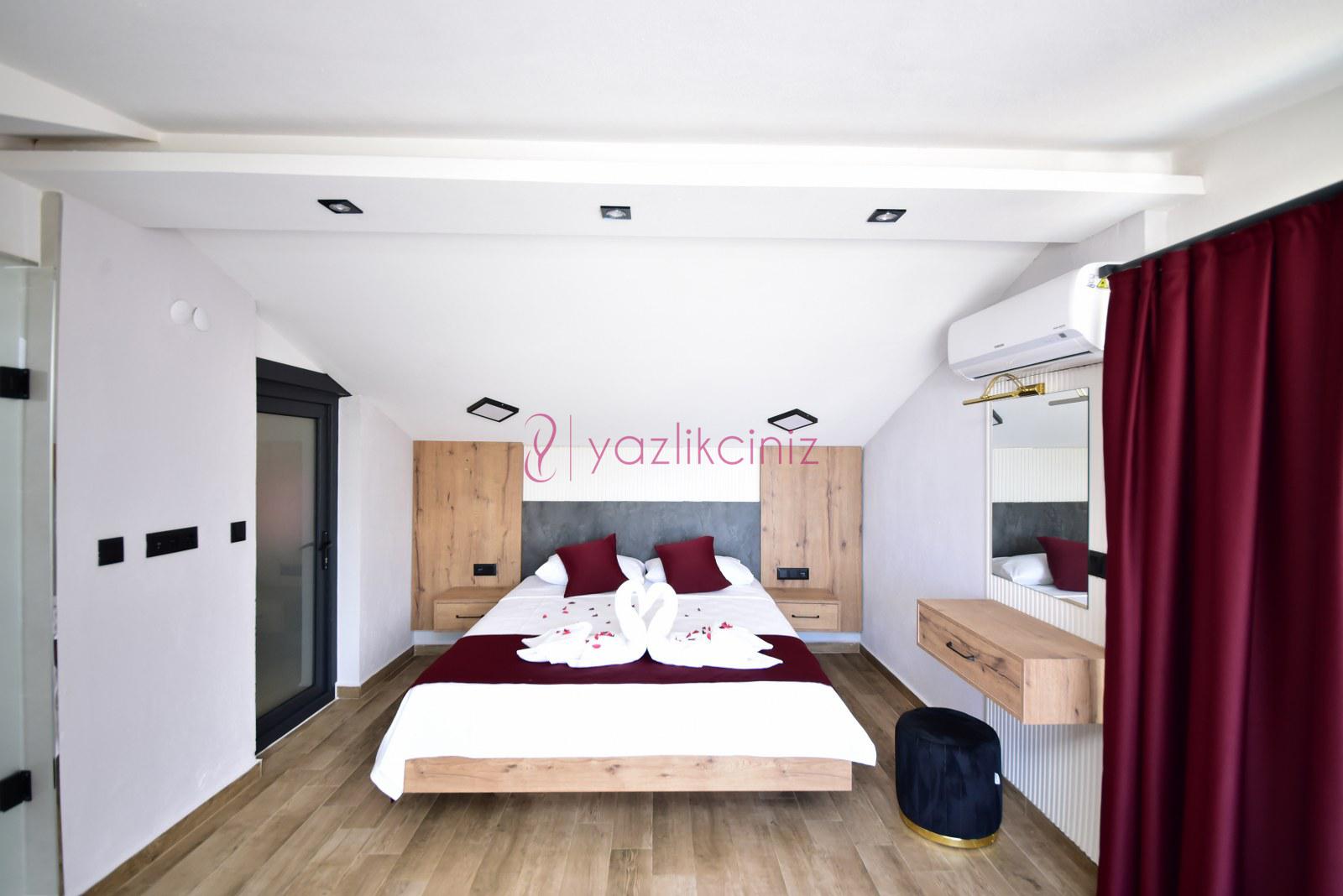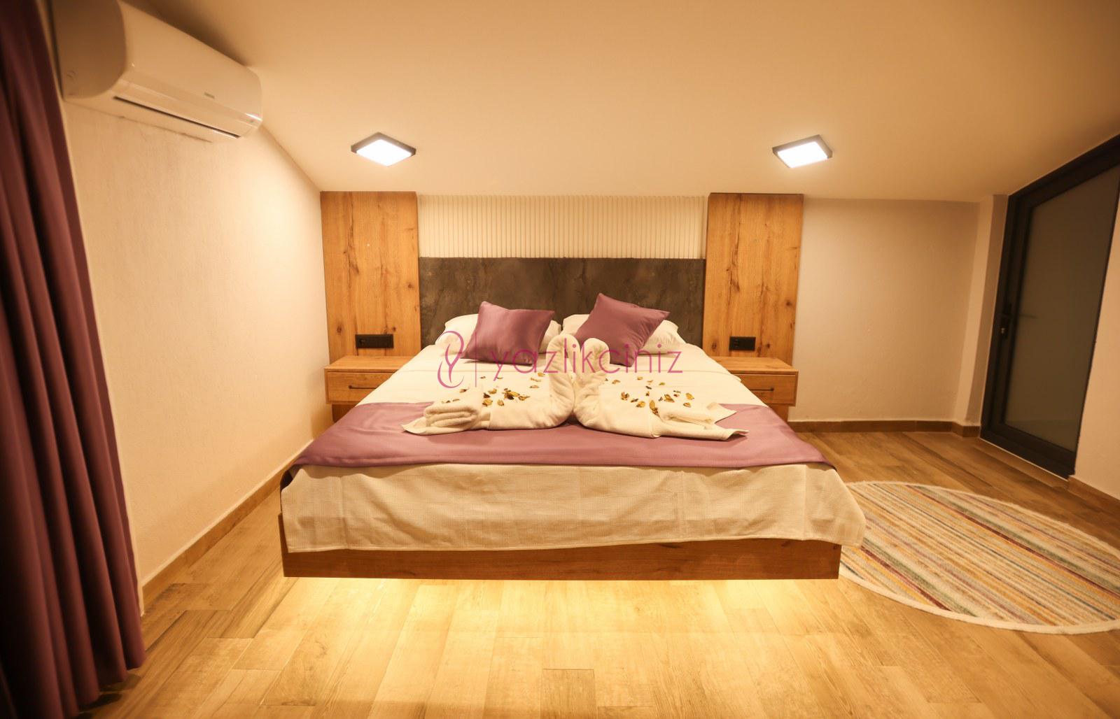 1. Yatak Odası: En suit,1 adet çift kişilik yatak, komodin, klima, jakuzi, makyaj masası, tuvalet ve banyo bulunmaktadır.