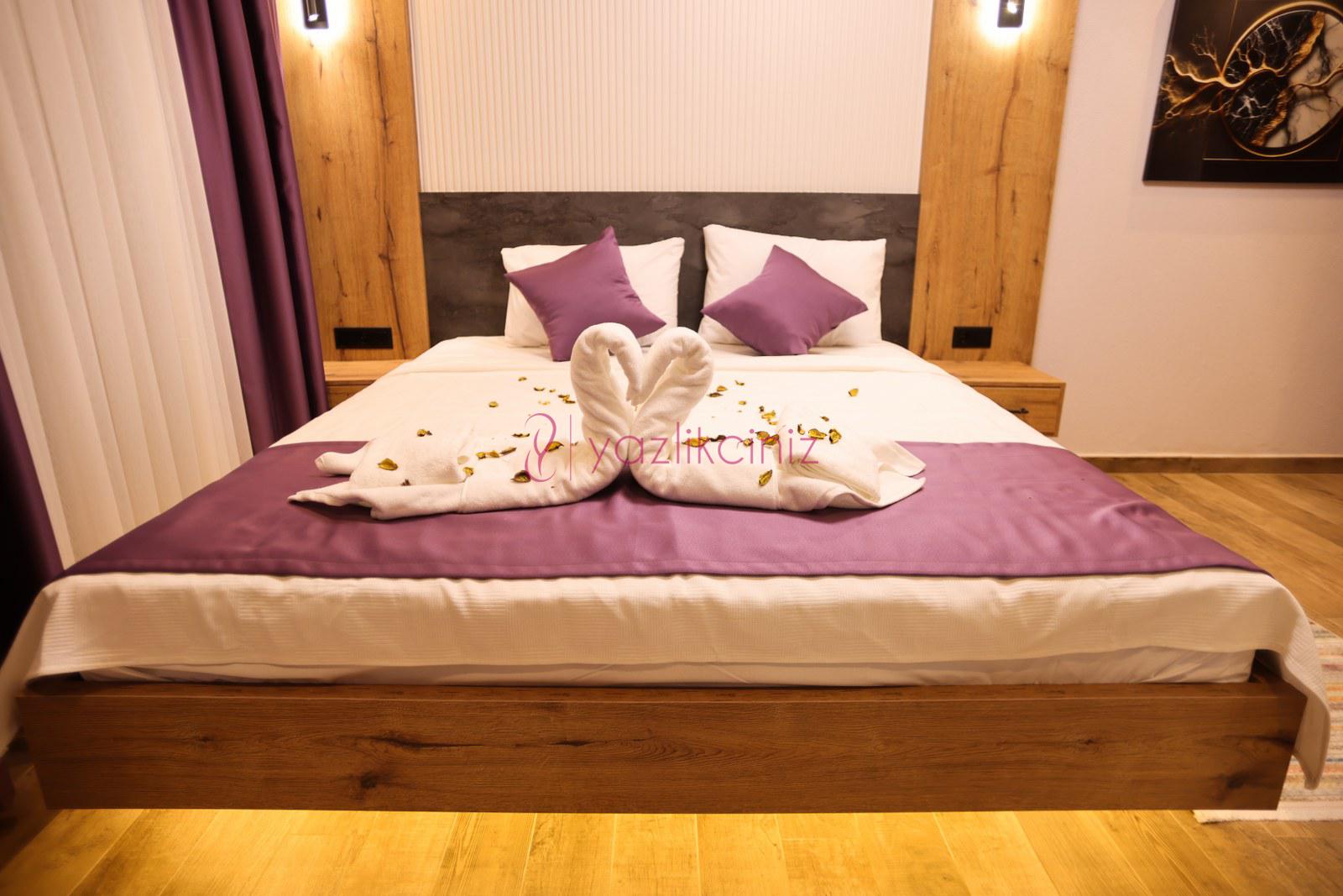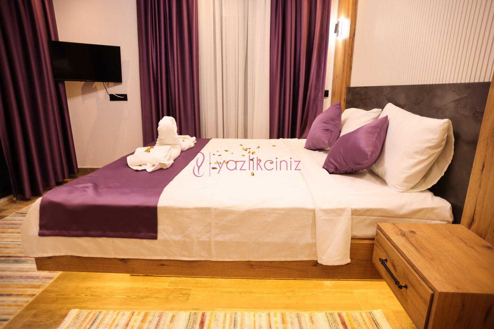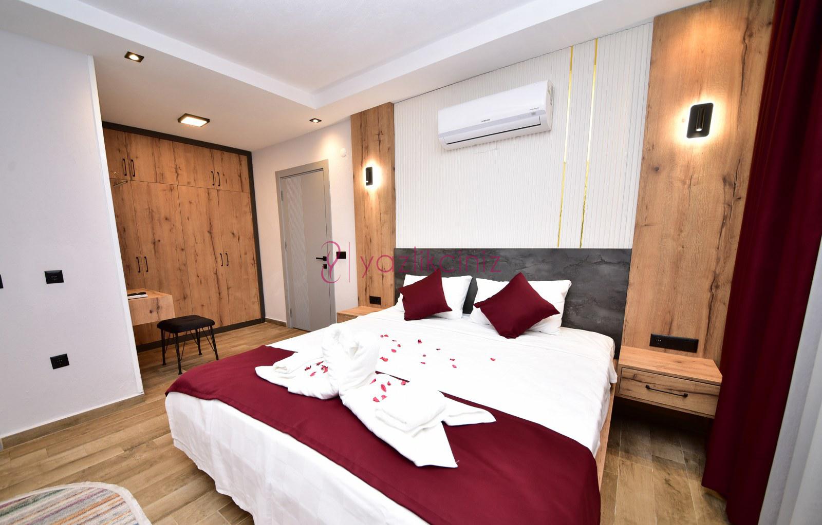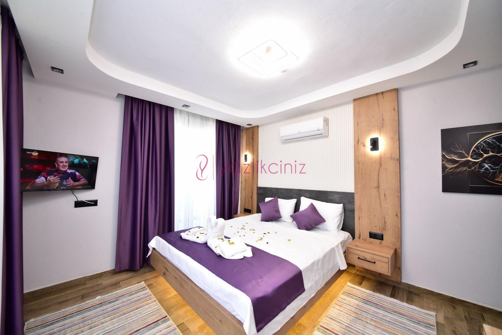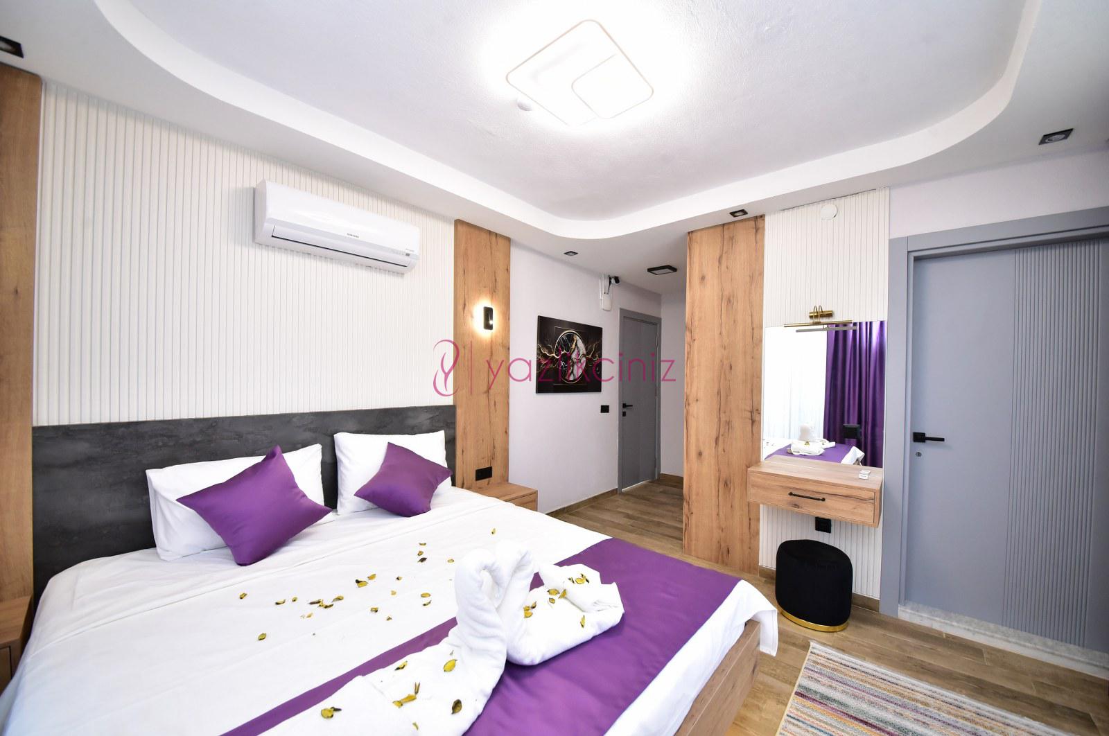 1. Yatak Odası: En suit,1 adet çift kişilik yatak, komodin, klima, jakuzi, makyaj masası, tuvalet ve banyo bulunmaktadır.
