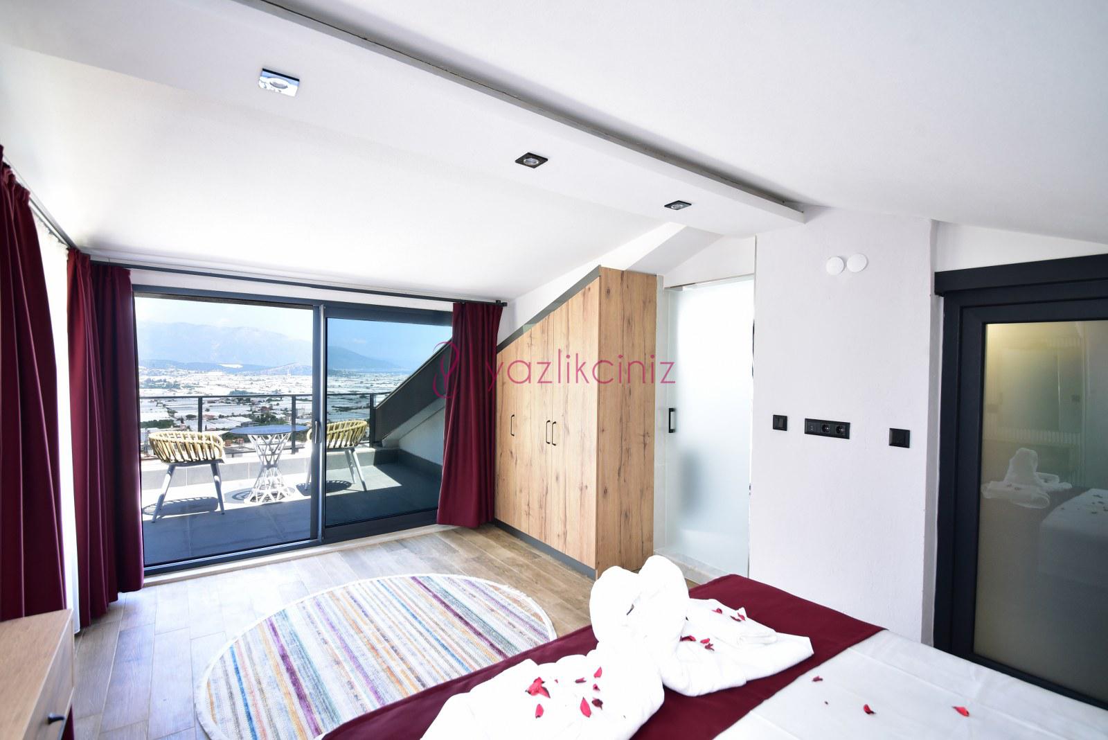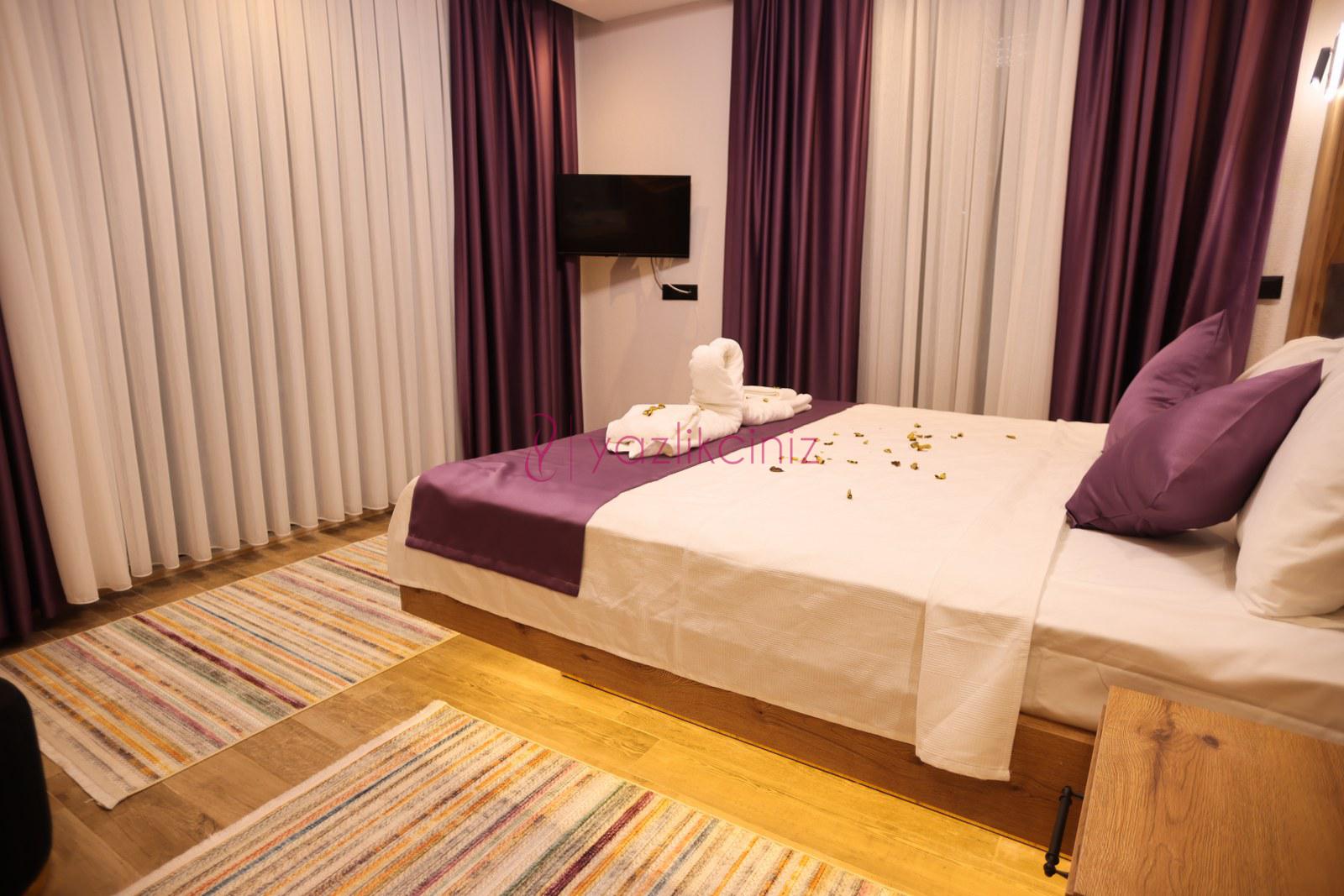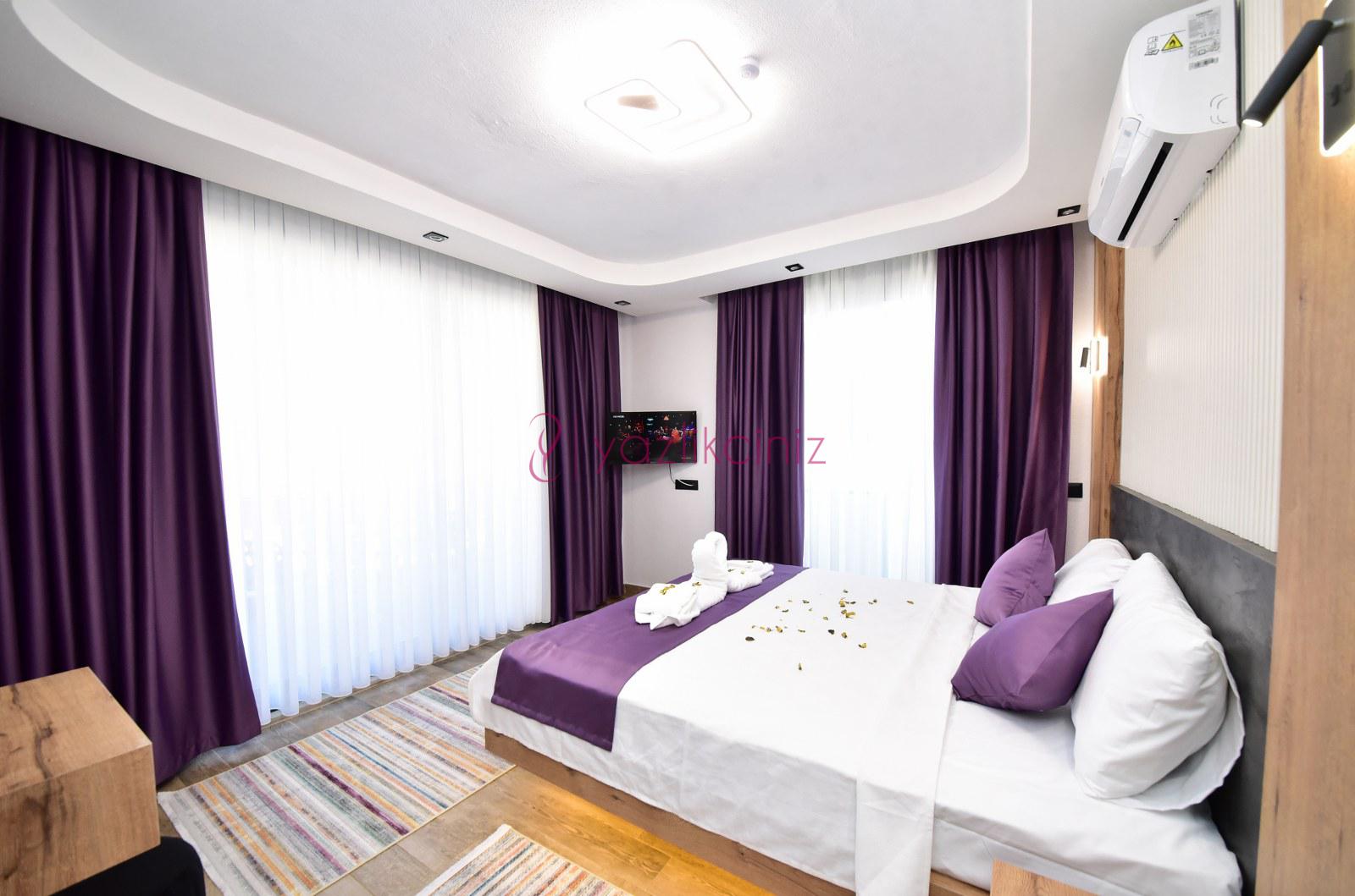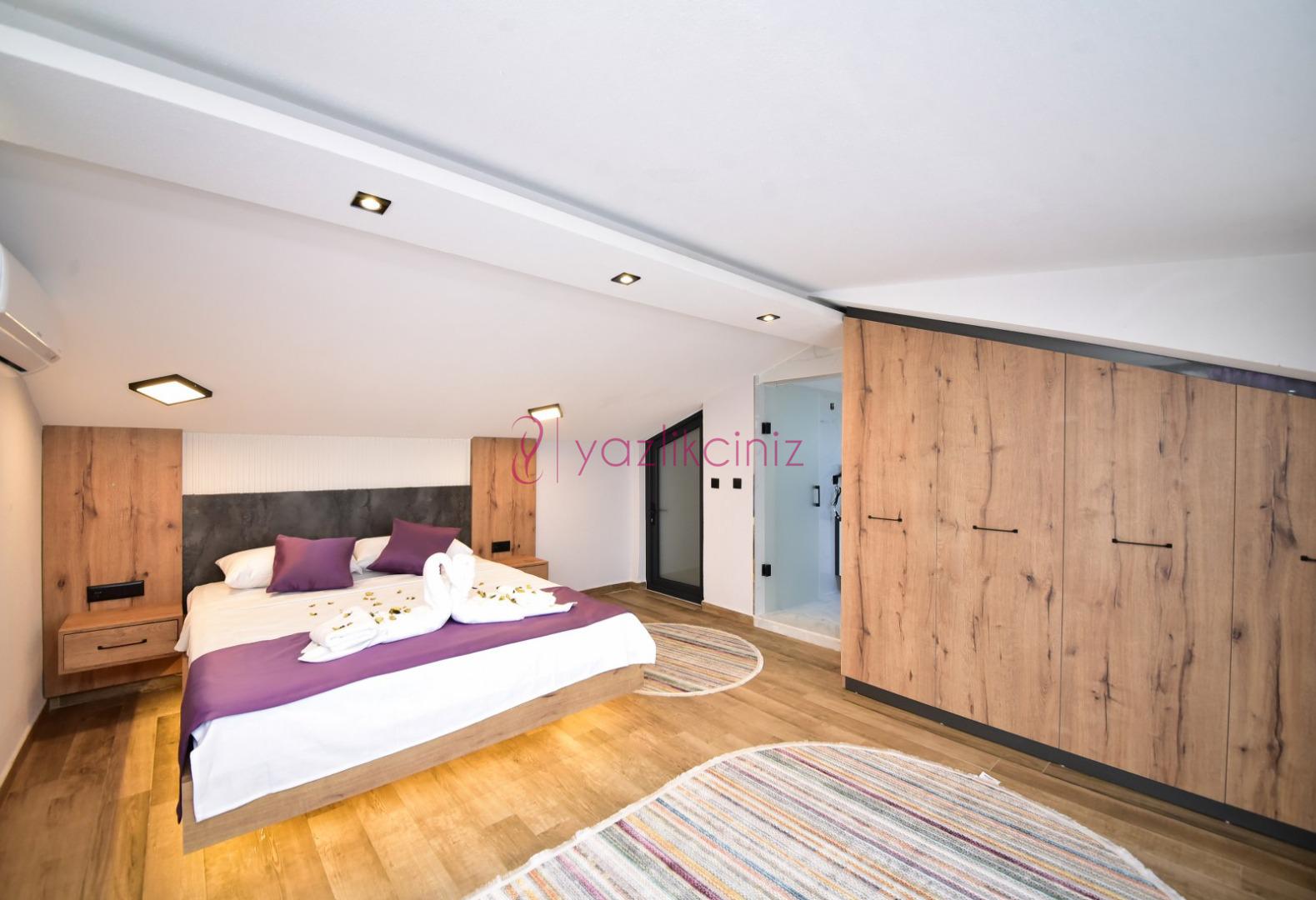 1. Yatak Odası: En suit,1 adet çift kişilik yatak, komodin, klima, jakuzi, makyaj masası, tuvalet ve banyo bulunmaktadır.