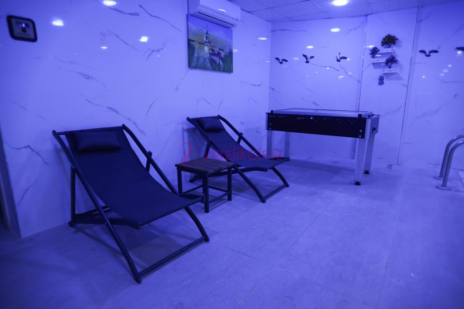 Oturma grubu, uydu alıcı, TV, klima, ütü ve ütü masası, elektrik süpürgesi, havuza çıkış bulunmaktadır. Kapalı ısıtmalı havuz bulunmaktadır.