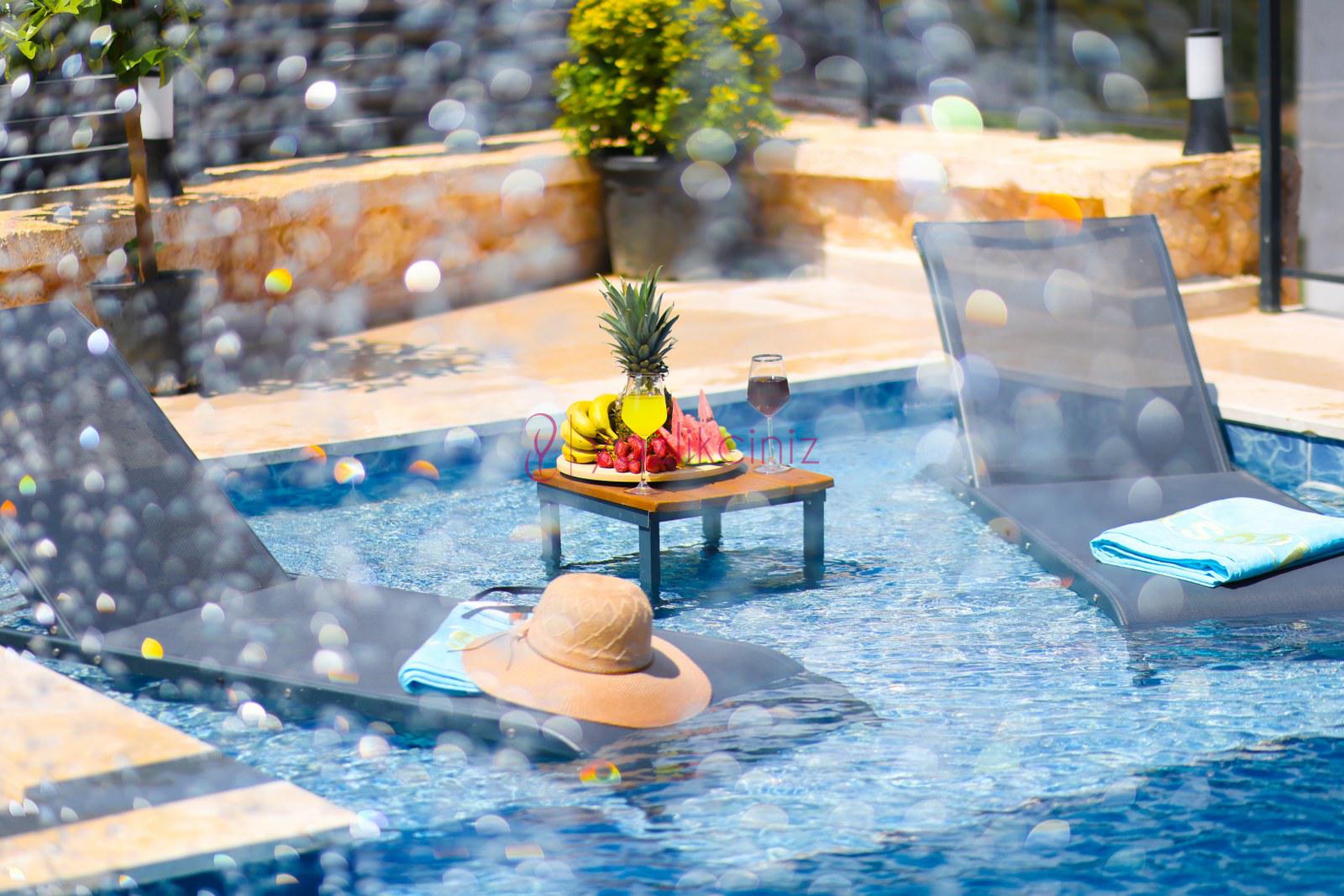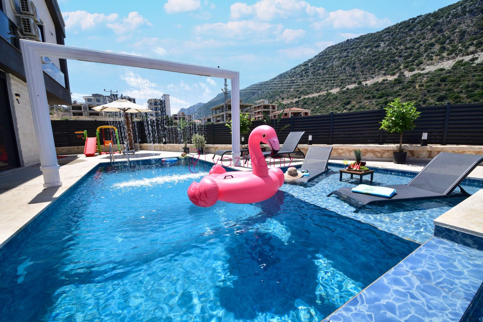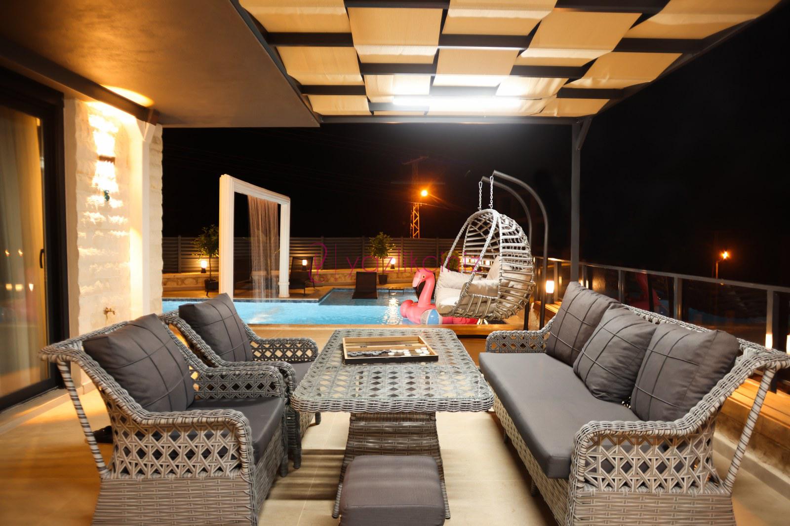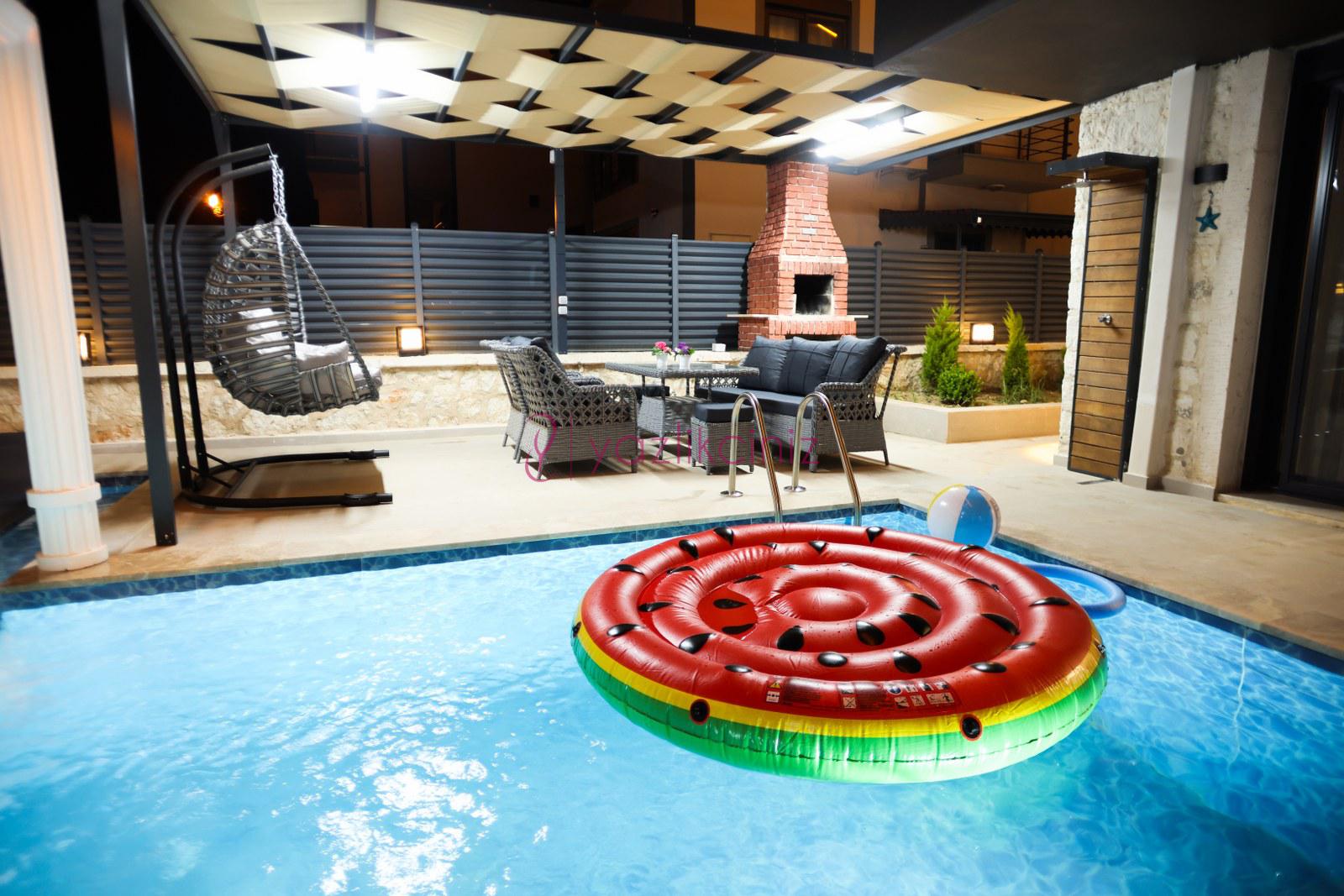 Villa Lotus Demre havuz terasında özel yüzme havuzu, şezlonglar, güneş şemsiyesi, masa ve sandalyeler, mangal bulunmaktadır.