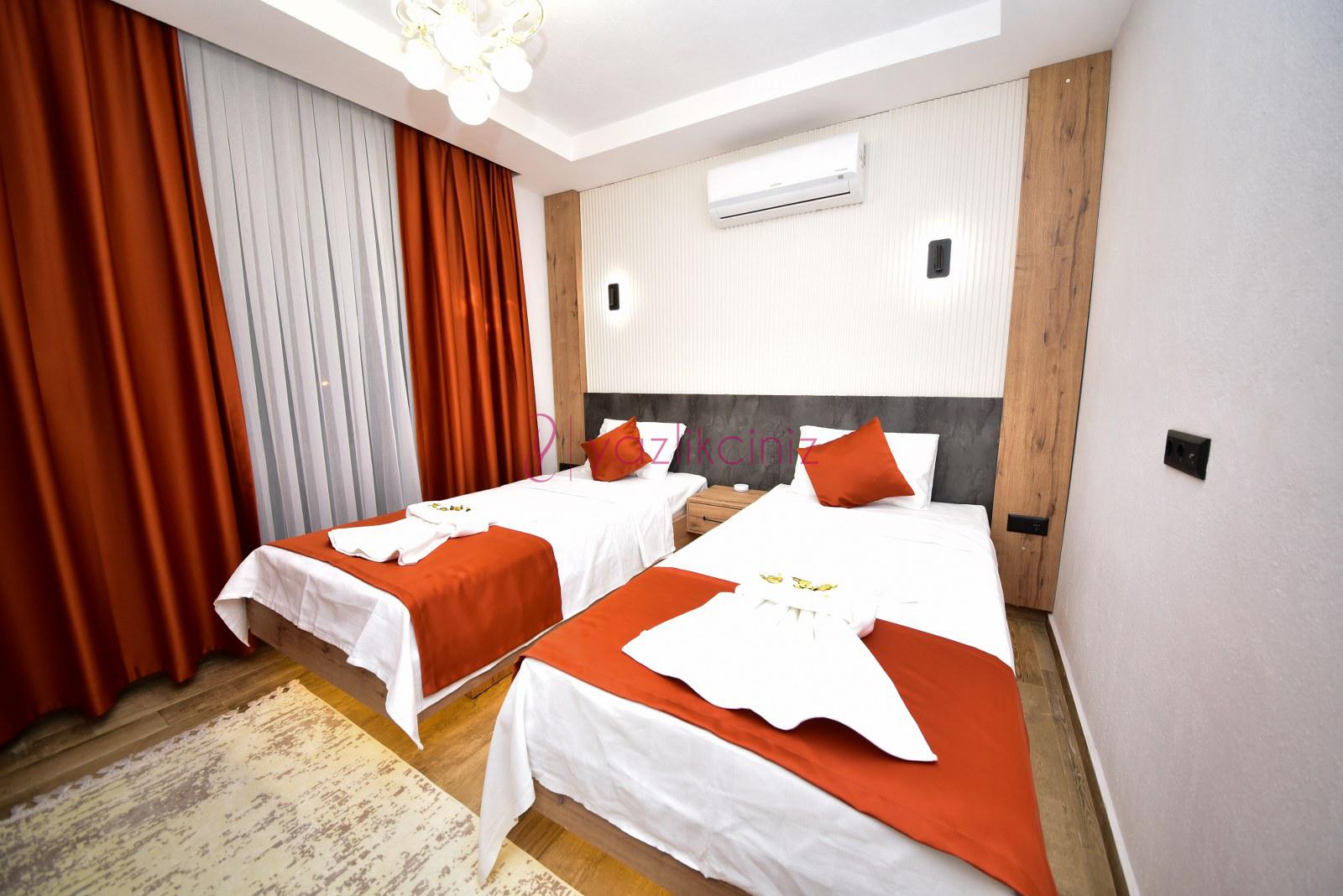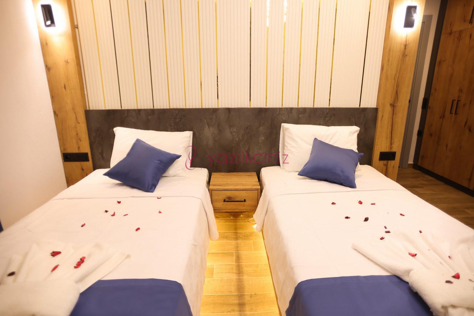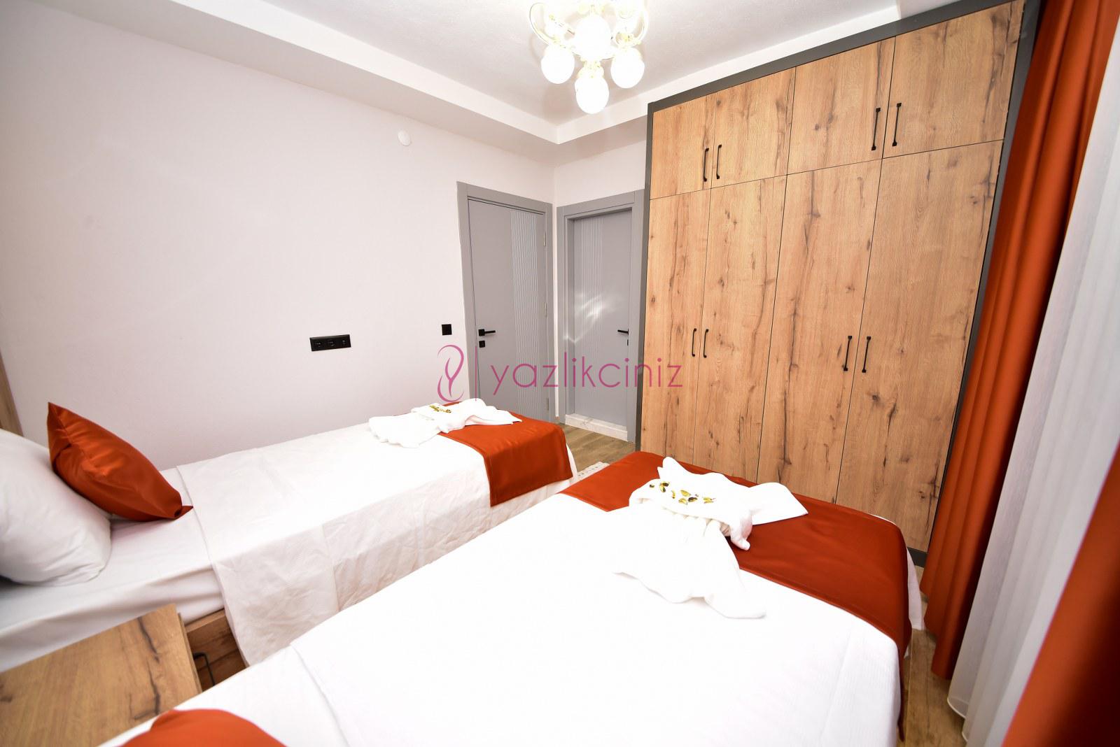 2. Yatak Odası: 2 adet tek kişilik yatak, komodin, makyaj masası, klima, tuvalet ve banyo bulunmaktadır.