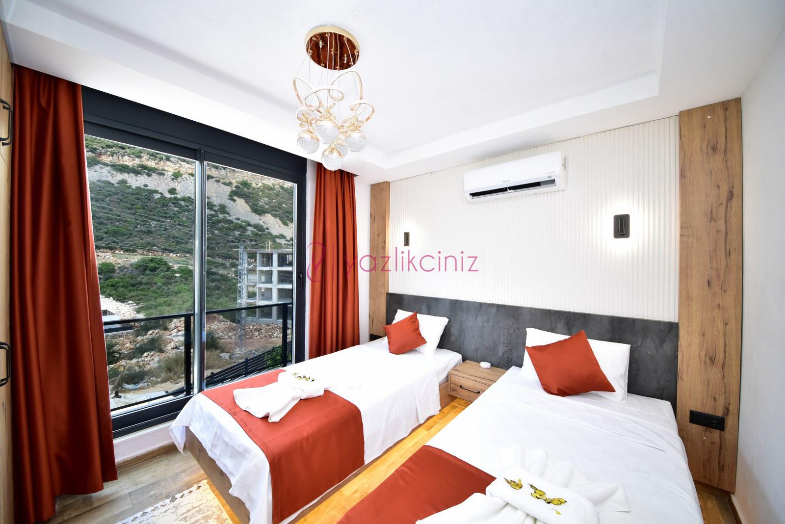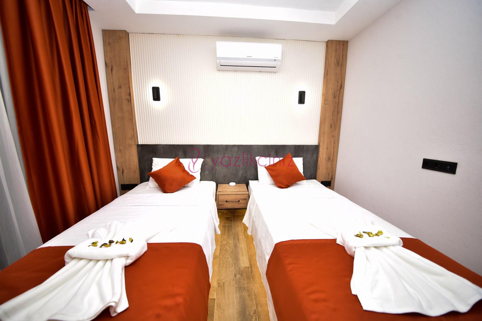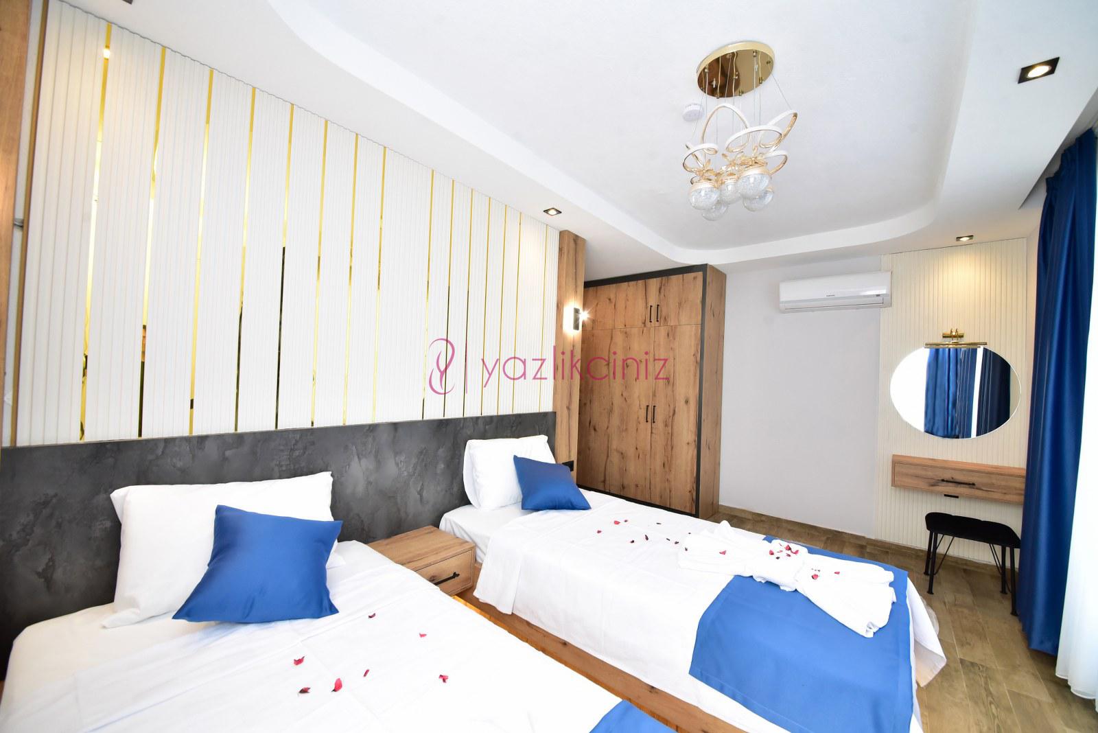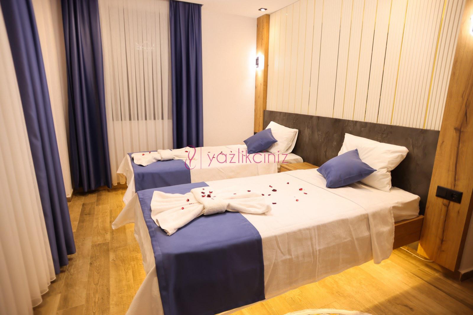 2. Yatak Odası: 2 adet tek kişilik yatak, komodin, makyaj masası, klima, tuvalet ve banyo bulunmaktadır.