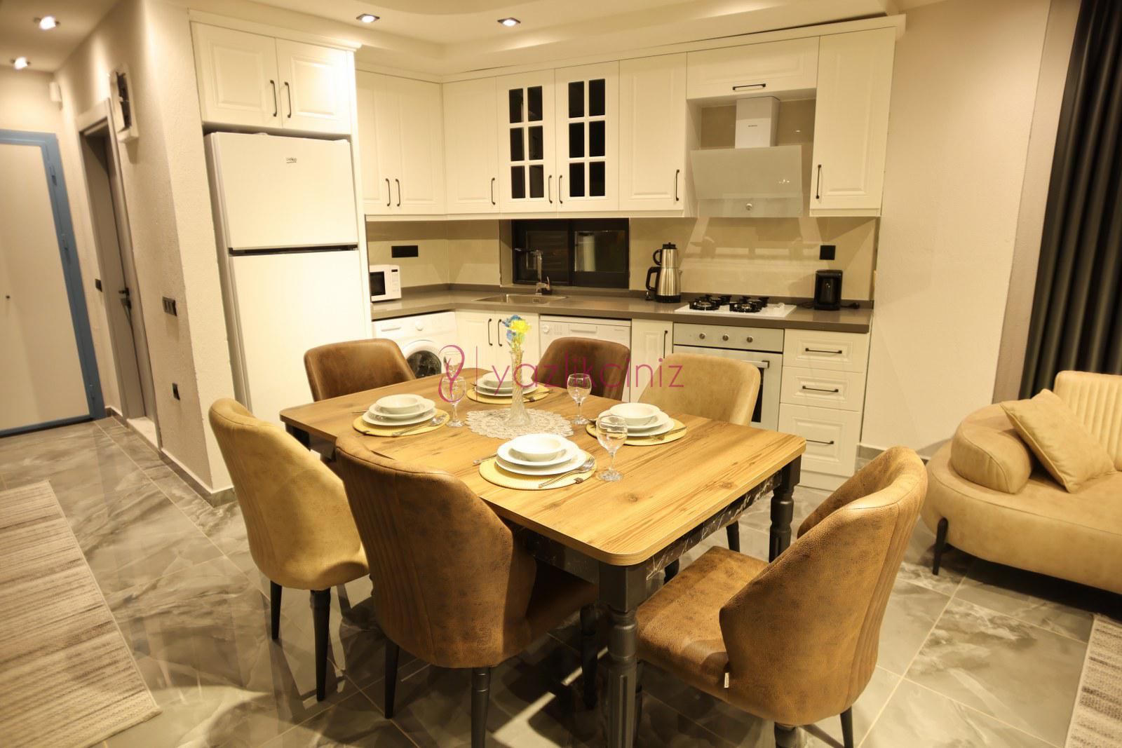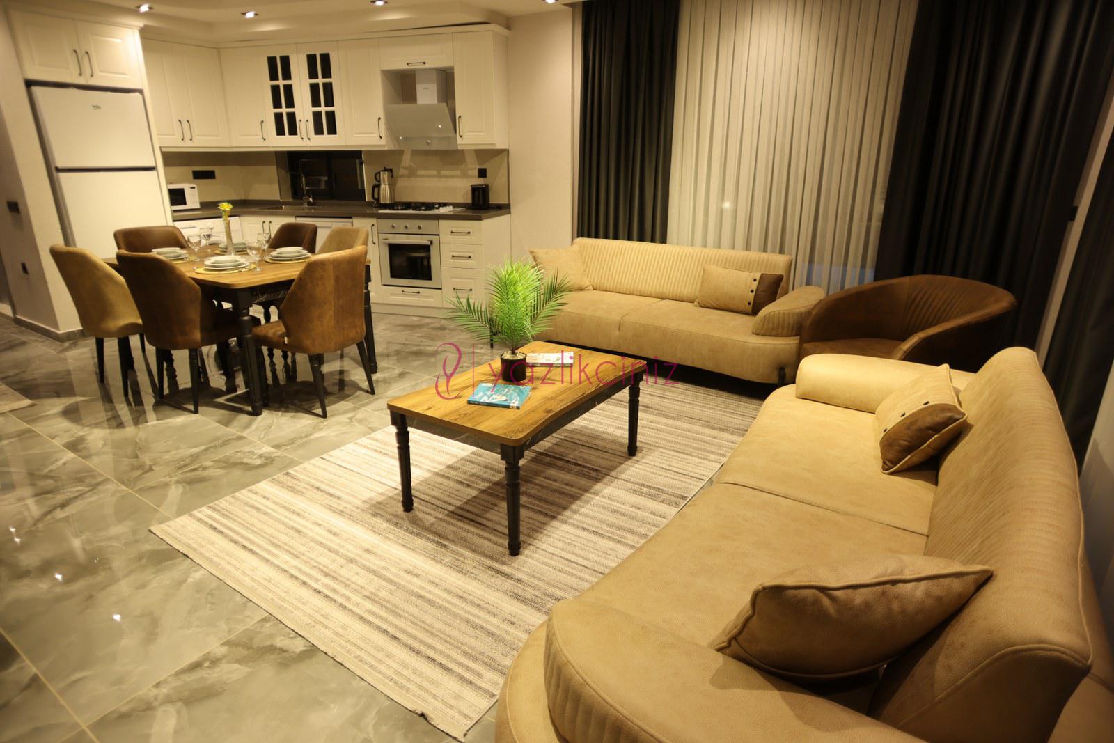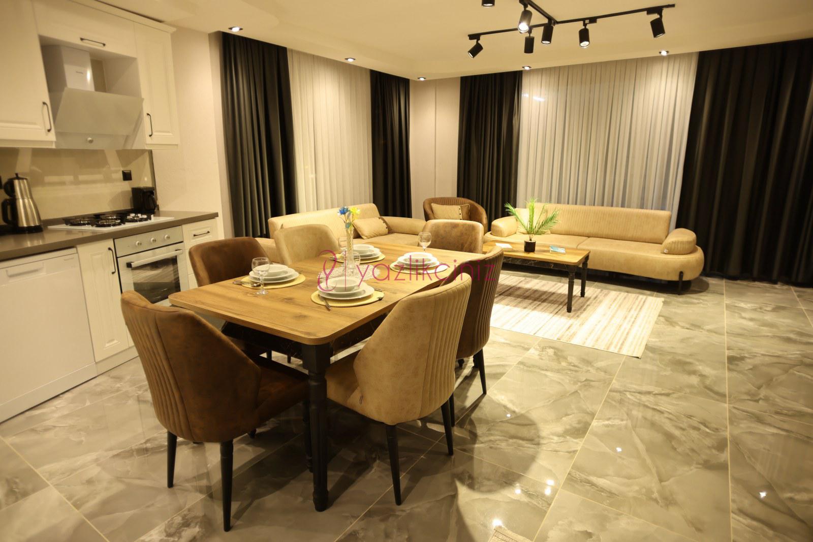 Modern Amerikan mutfak, buzdolabı, bulaşık makinesi, çamaşır makinesi, ankastre fırın, mikrodalga fırın, ankastre 4’lü ocak, elektrikli su ısıtıcı (ketle), 4 kişilik yemek takımı, çeşitli mutfak araç gereçleri.