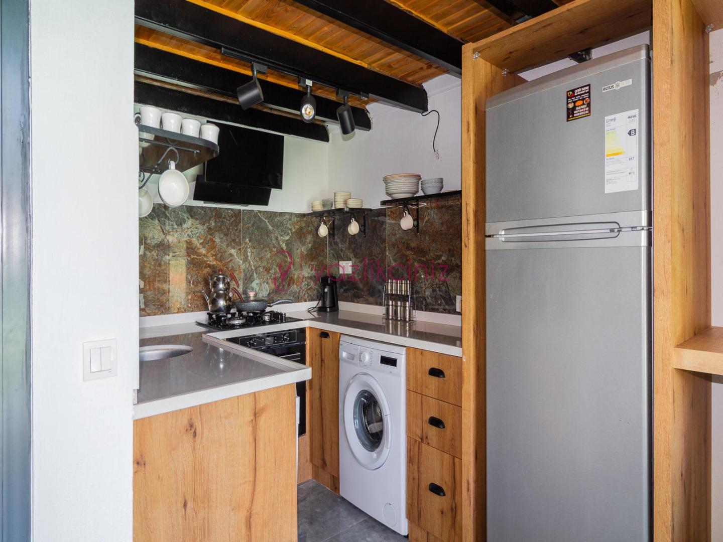 Modern açık mutfak içerisinde buzdolabı, bulaşık makinesi, fırın, ocak, mikrodalga fırın, yemek masası, yemek takımları, çatal ve bıçak takımları, tencere ve tava takımları, bardaklar bulunmaktadır.