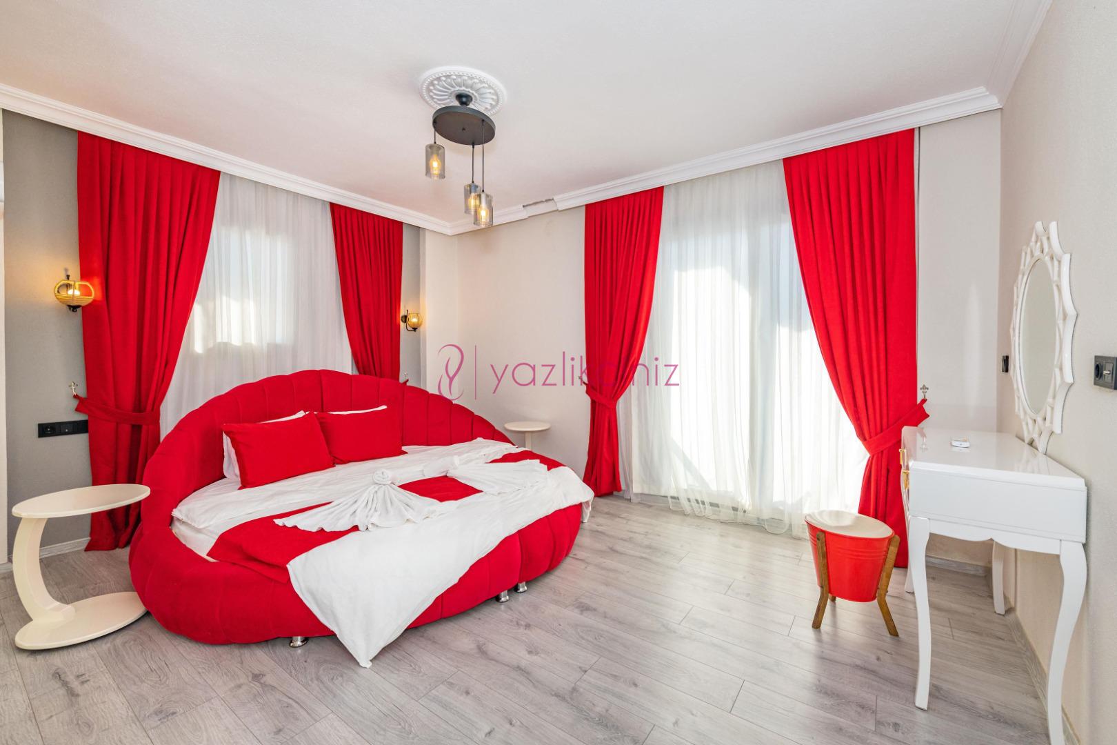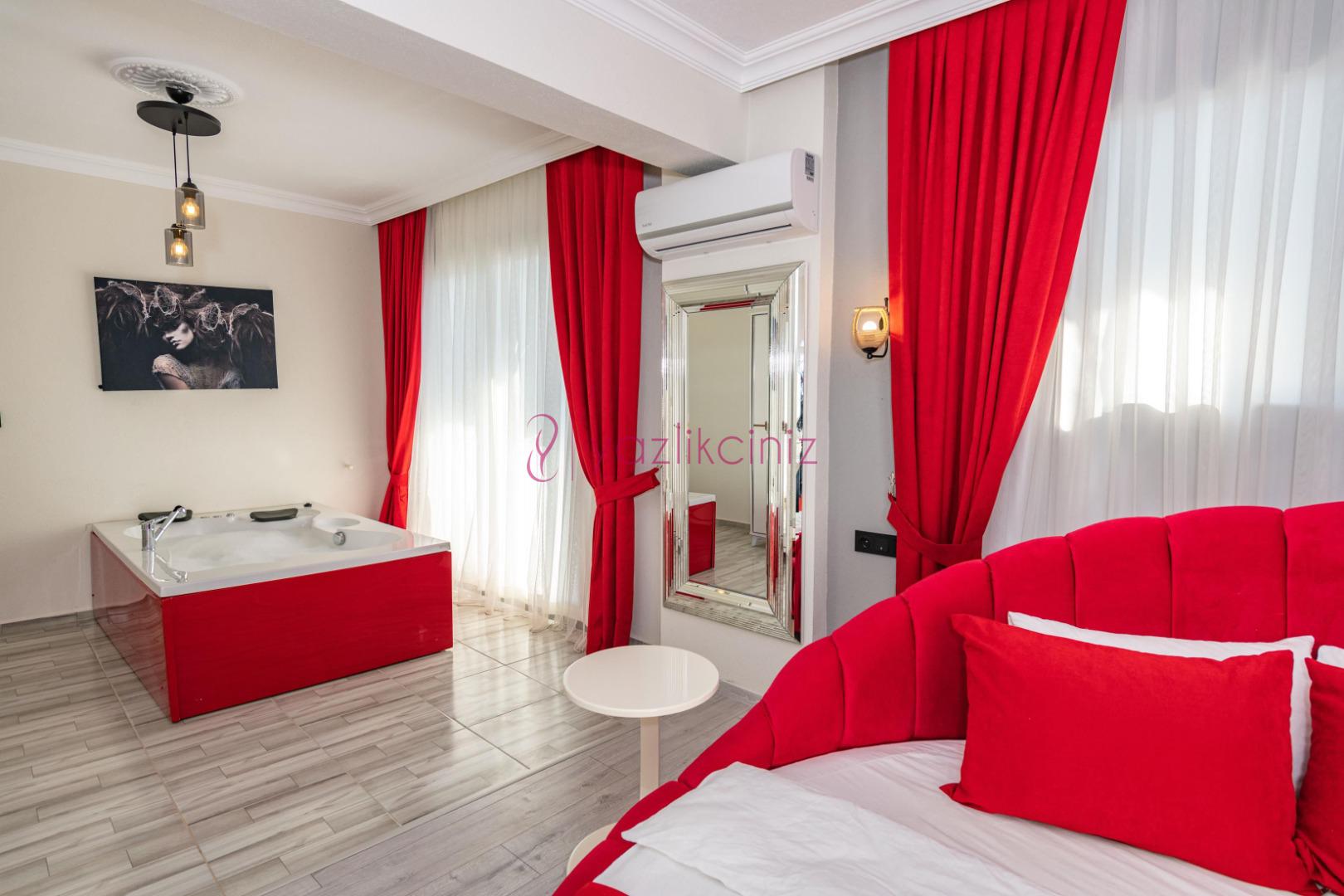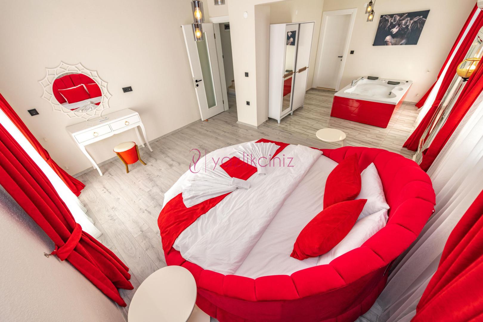 1.Yatak Odası: 1 adet çift kişilik yatak, elbise dolabı, makyaj masası, jakuzi, klima, banyo ve tuvalet bulunmaktadır.
