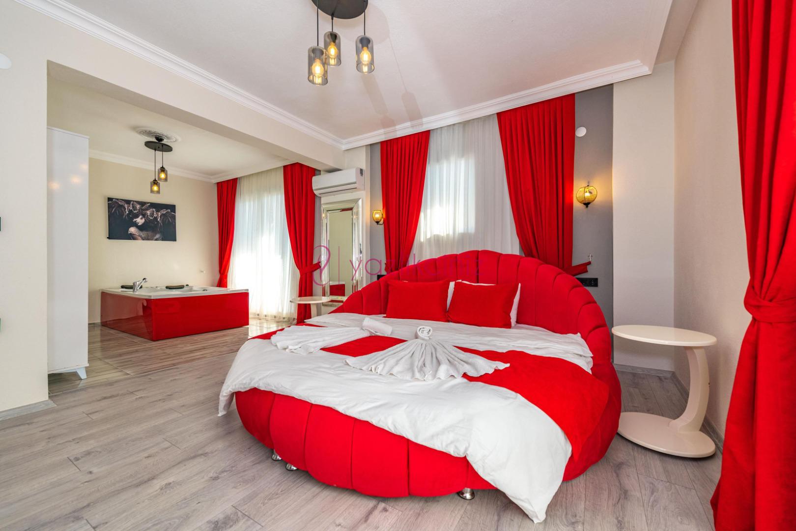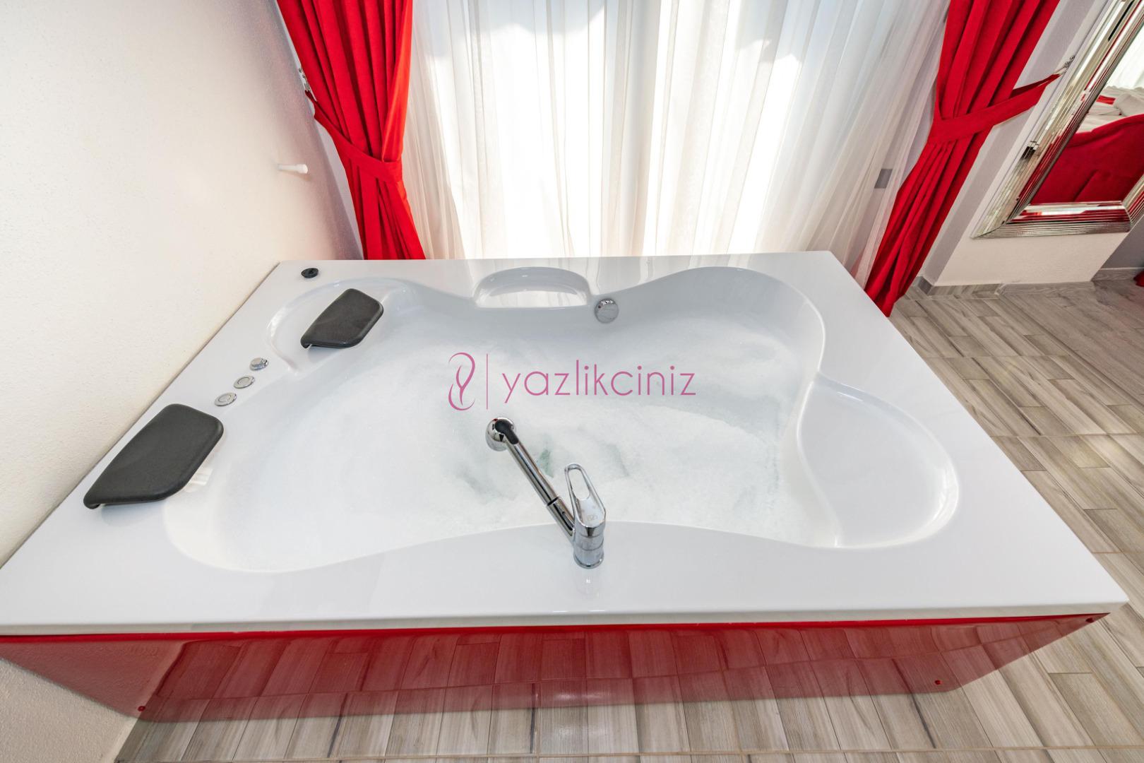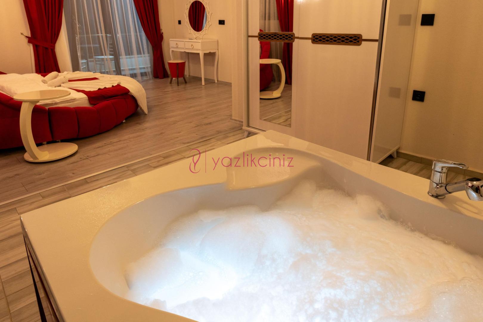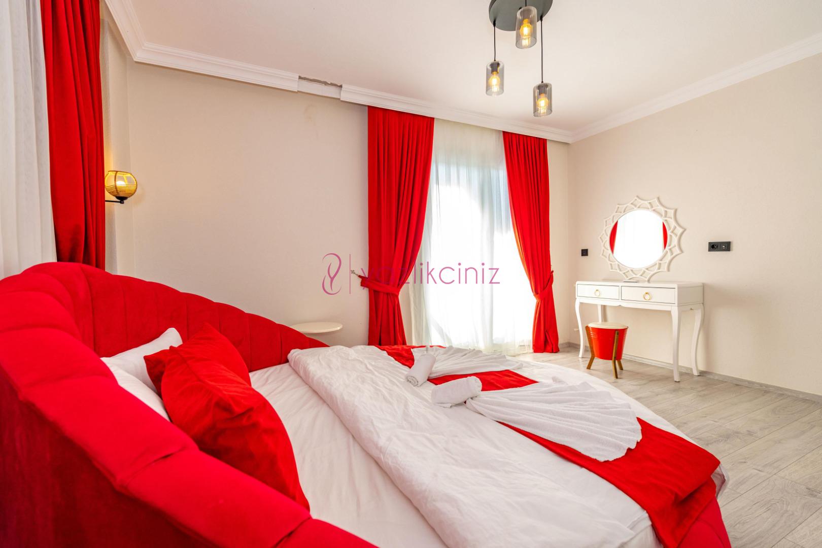 1.Yatak Odası: 1 adet çift kişilik yatak, elbise dolabı, makyaj masası, jakuzi, klima, banyo ve tuvalet bulunmaktadır.