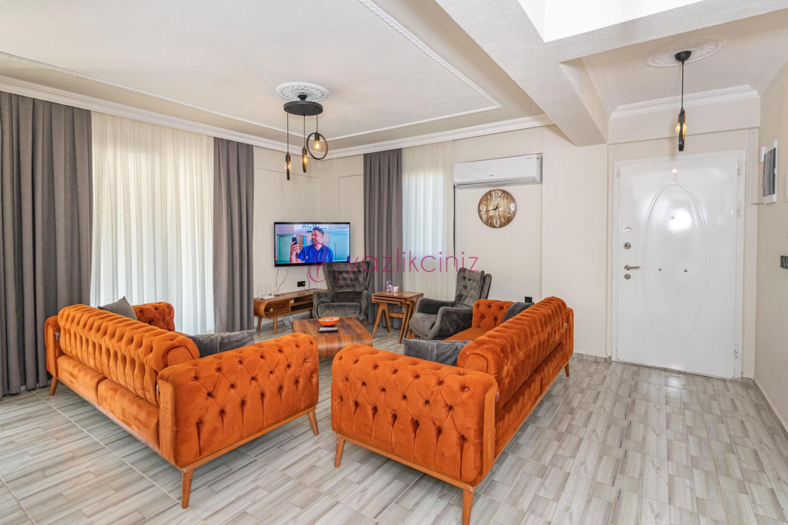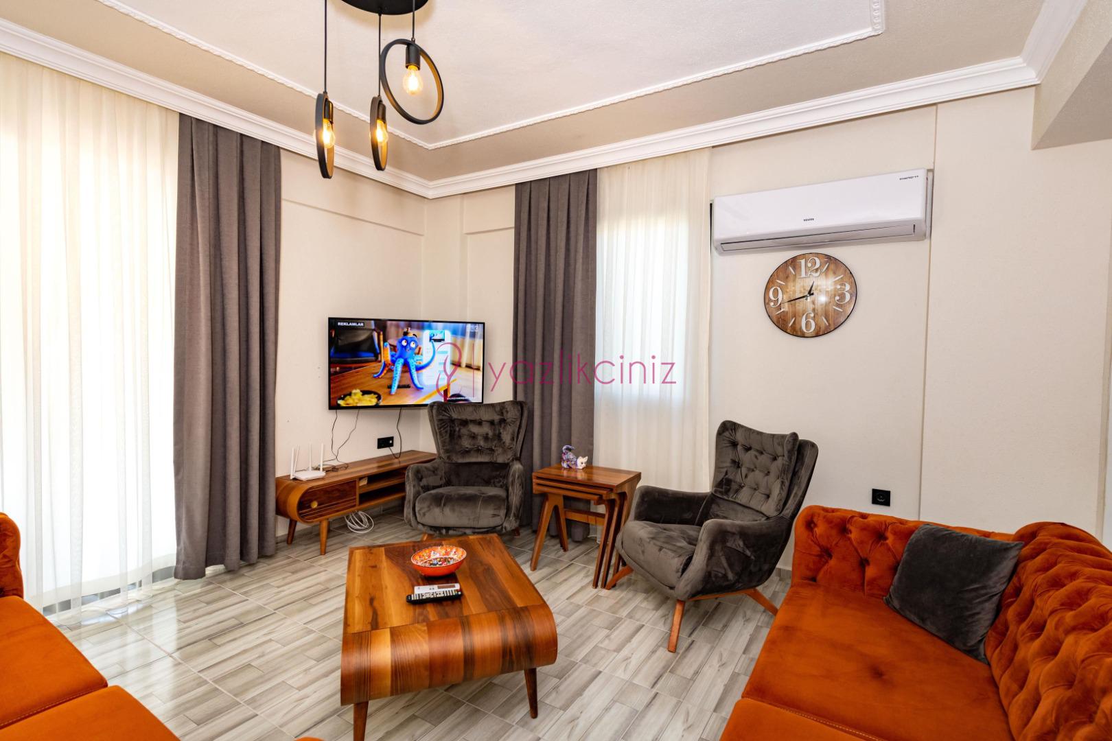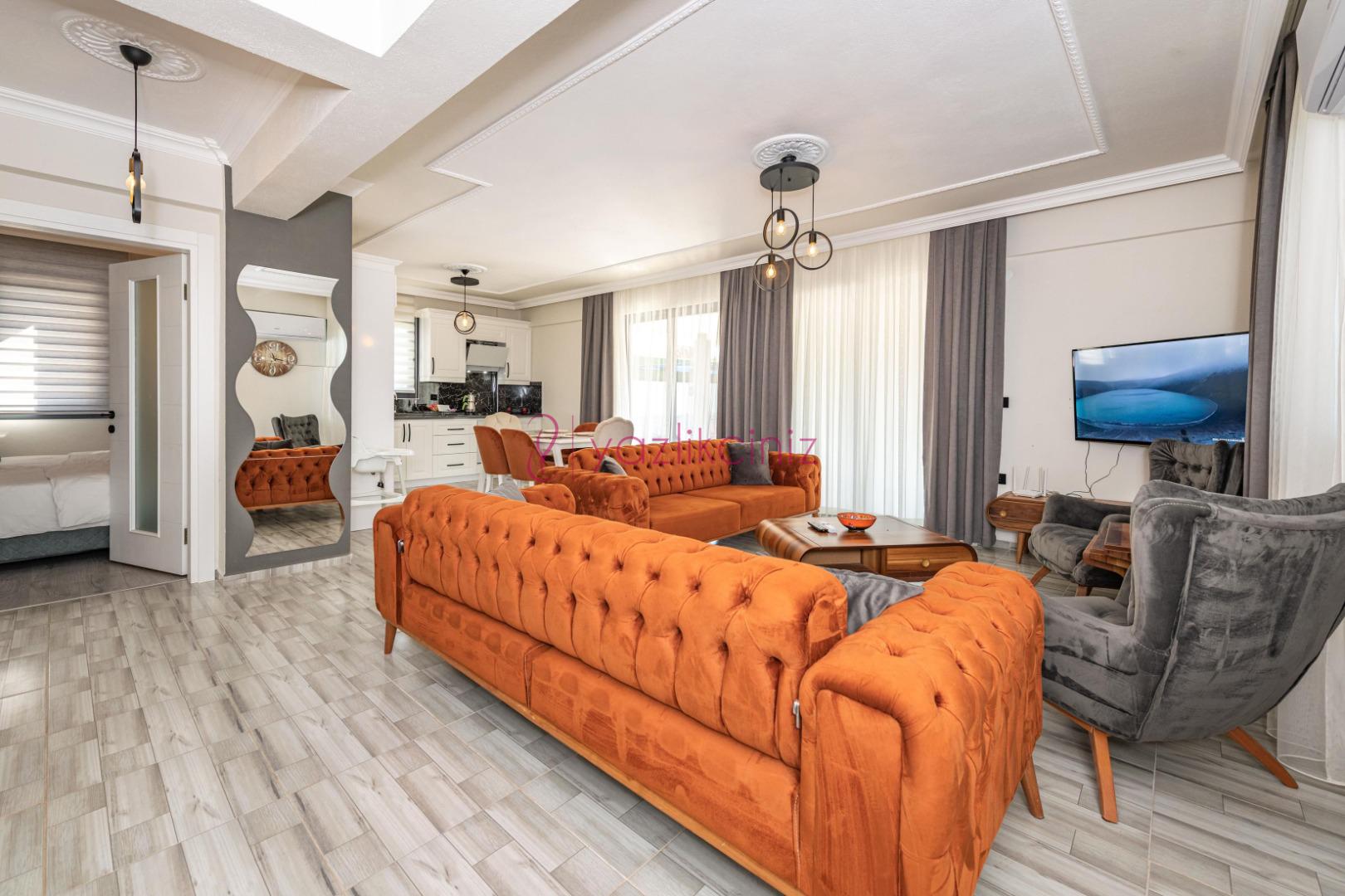 Salon içerisinde konforlu oturma grubu, sehpa, televizyon, uydu alıcı, klima ortak alan tuvalet banyo bulunmaktadır.