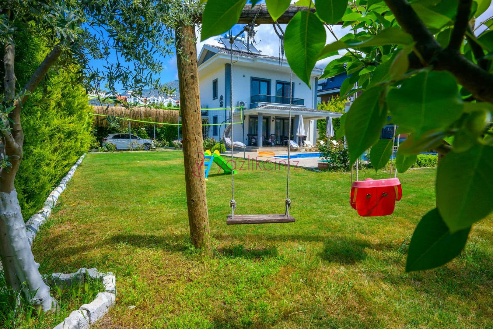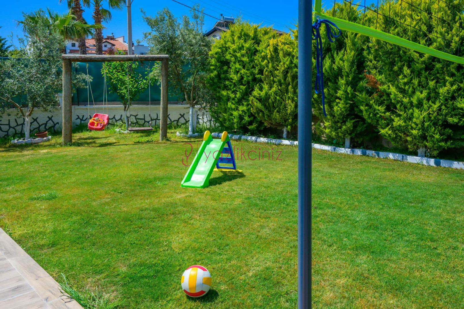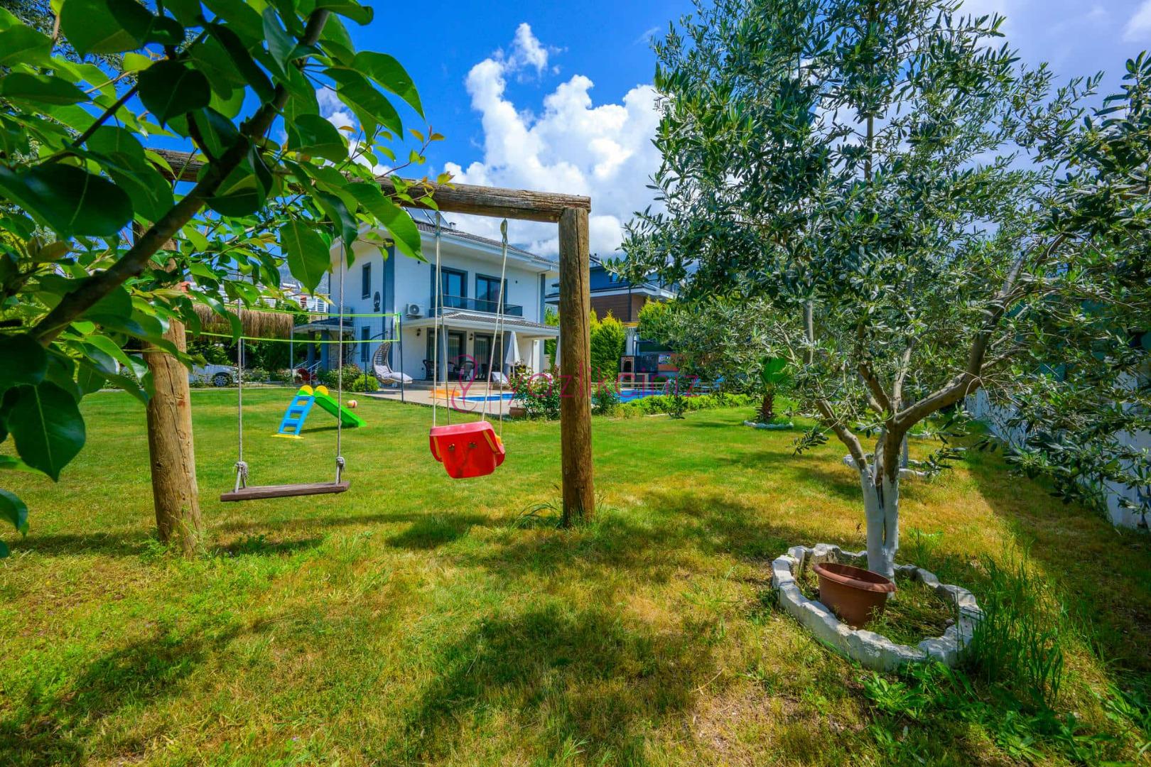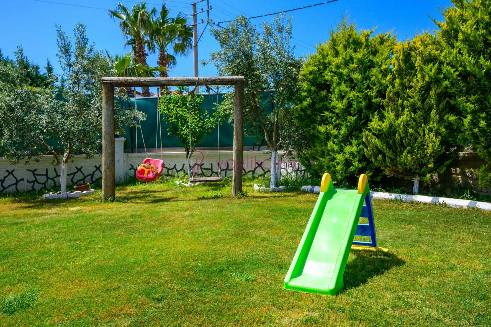 Şezlonglar, güneş şemsiyesi, mangal, çocuk oyun parkı, yemek masası ve sandalyeler bulunmaktadır.