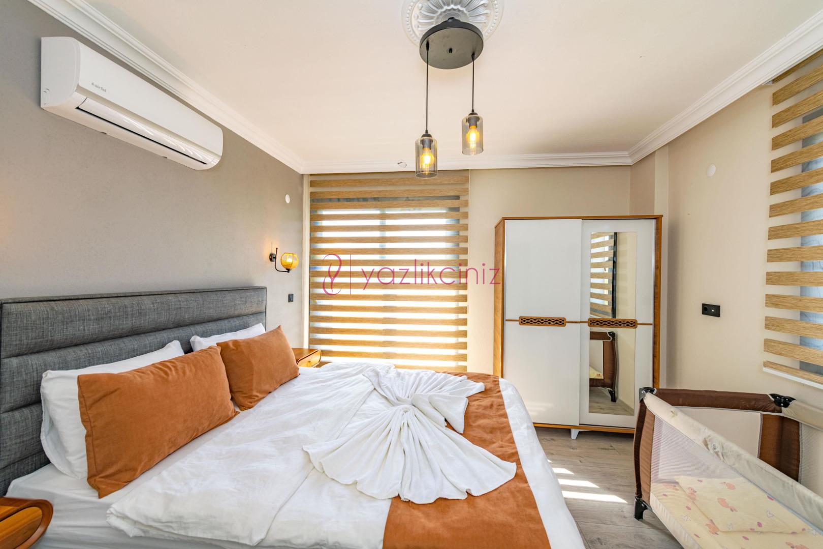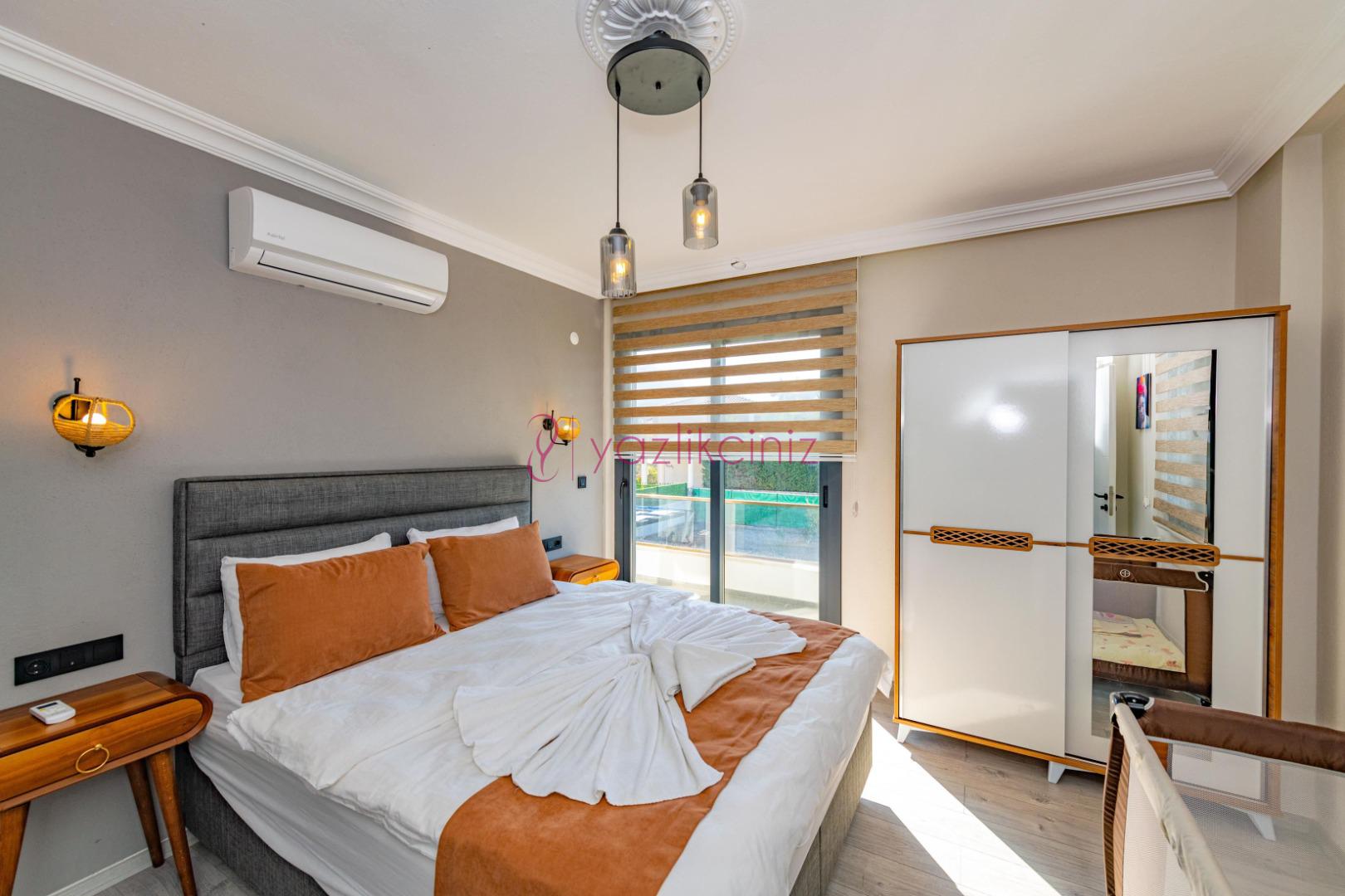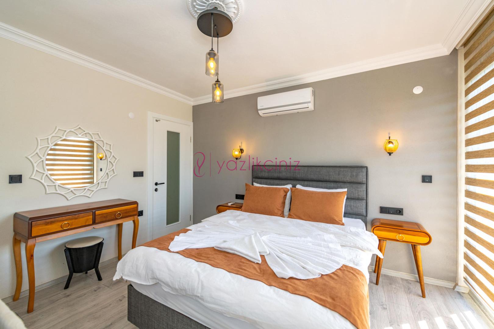 2.Yatak Odası: 1 adet çift kişilik yatak, elbise dolabı, makyaj masası, klima, banyo ve tuvalet bulunmaktadır.