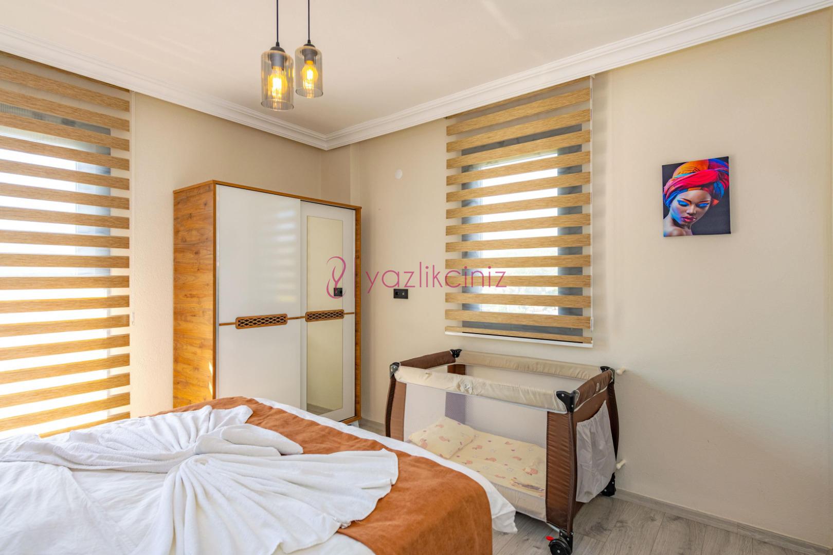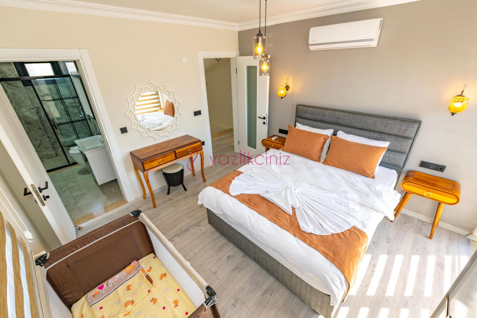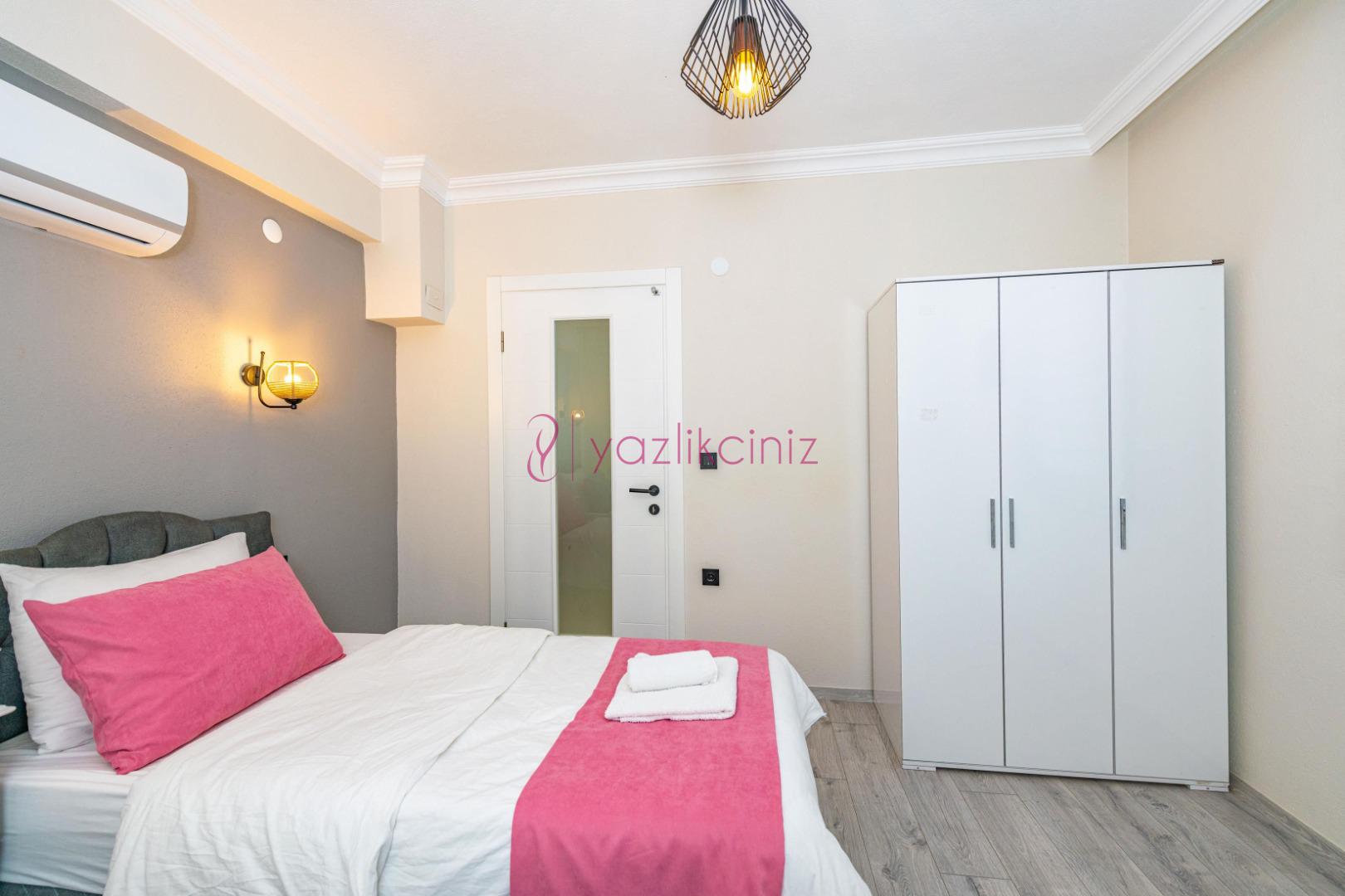 2.Yatak Odası: 1 adet çift kişilik yatak, elbise dolabı, makyaj masası, klima, banyo ve tuvalet bulunmaktadır.