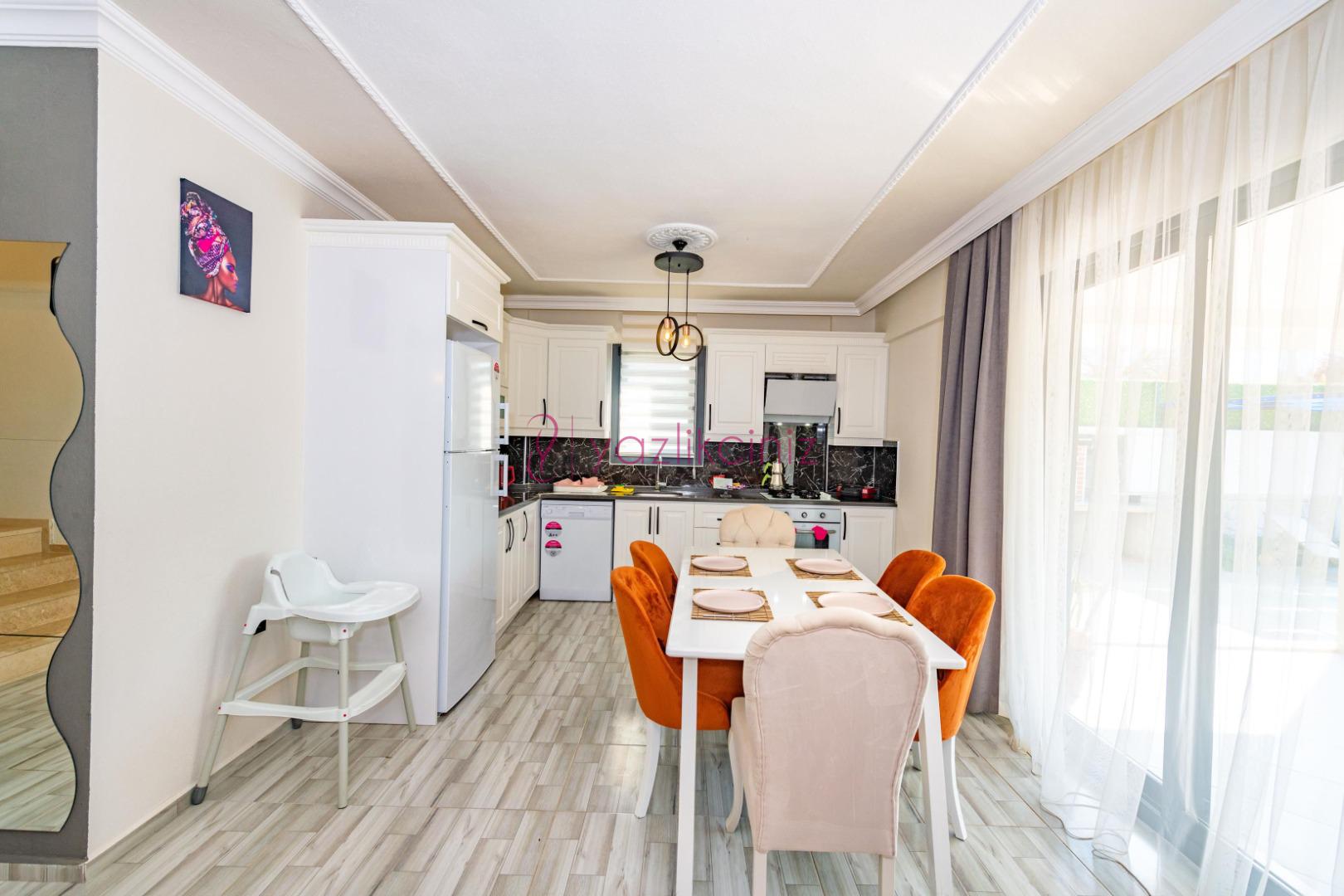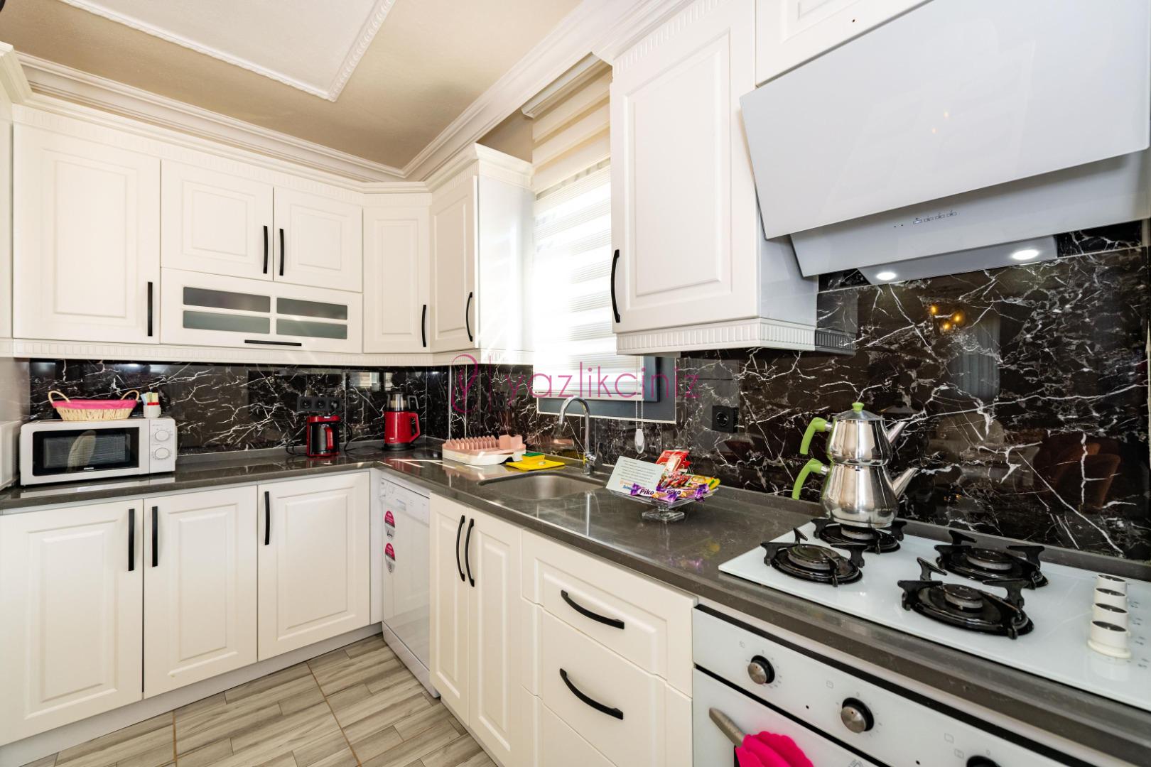 Buzdolabı, fırın, mikrodalga, çamaşır makinesi, bulaşık makinesi, 4’lü ocak, elektrikli su ısıtıcısı (kettle), elektrikli süpürge, 6 kişilik yemek takımı, tava, tencereler, çatal ve bıçak takımı ve diğer mutfak malzemesi mevcuttur.