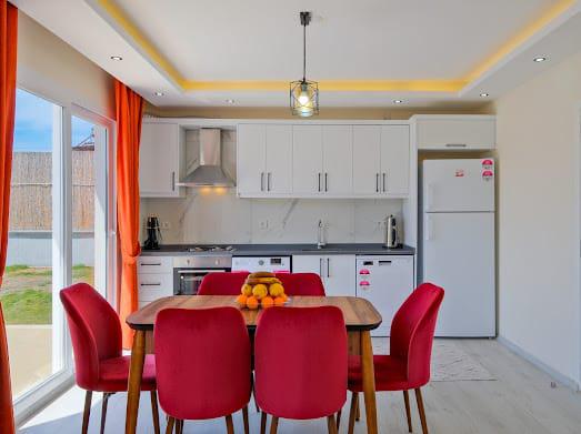 Buzdolabı, çamaşır makinesi, bulaşık makinesi fırın, 4 lü ocak, ketle, tost makinesi, yemek masası, tava & tencere vb. mutfak ekipmanları bulunmaktadır.