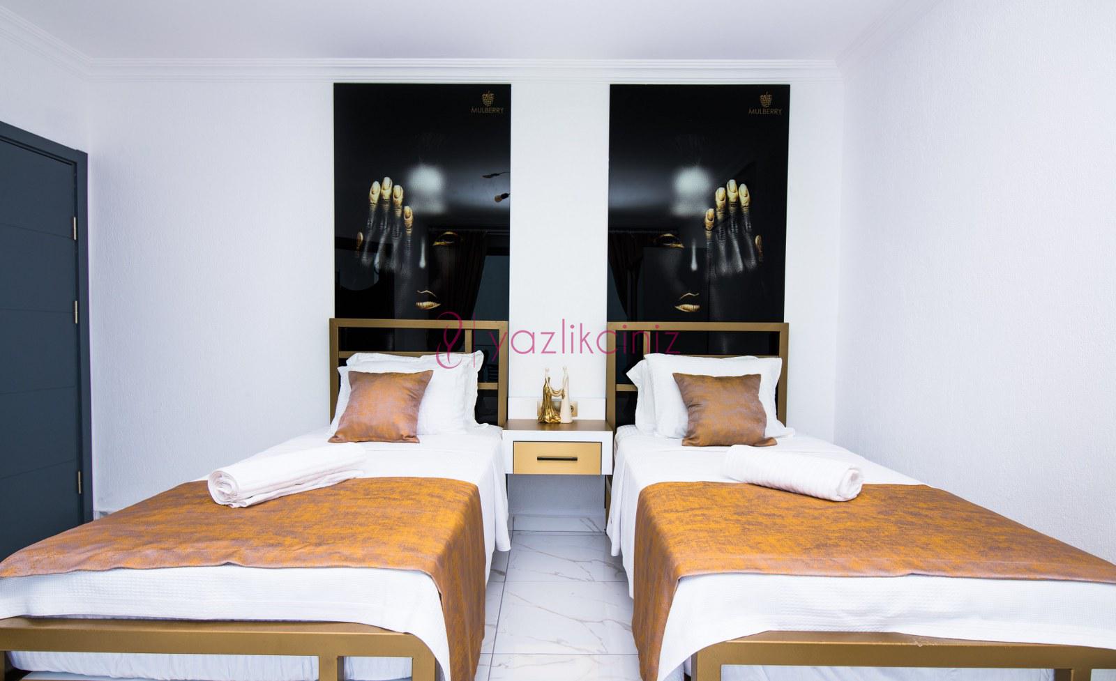 3. Yatak odası: 2 adet tek kişilik yatak, klima, komodin, makyaj masası, elbise dolabı, banyo ve tuvalet bulunmaktadır.