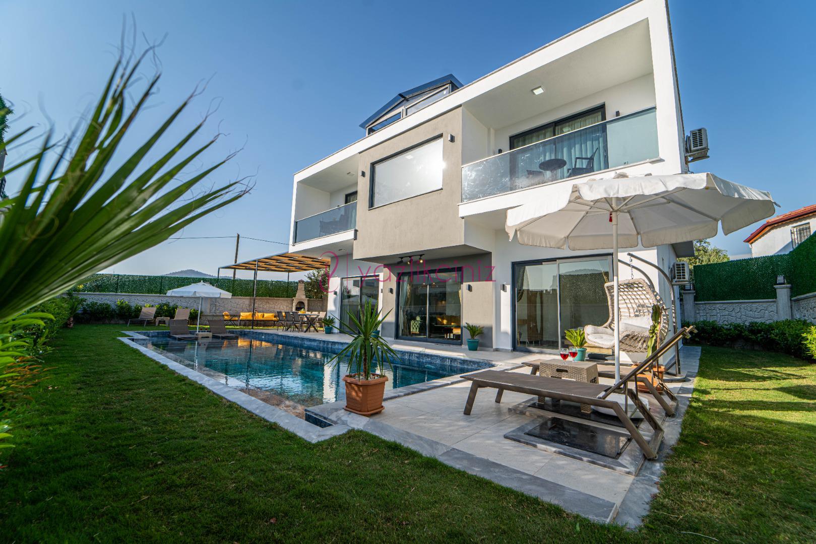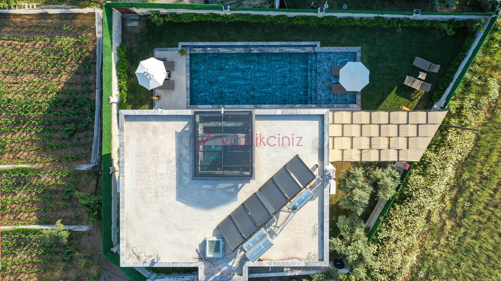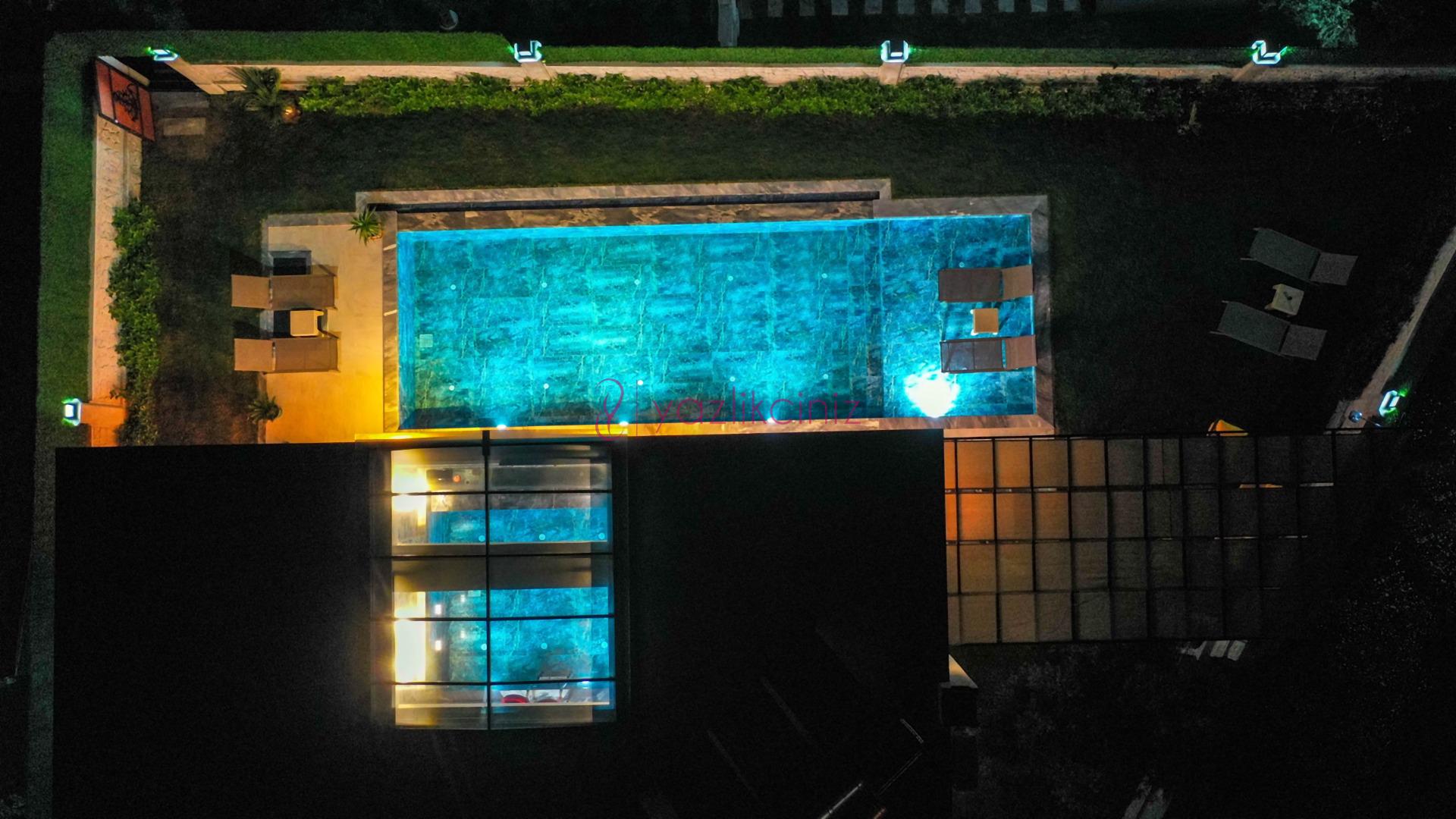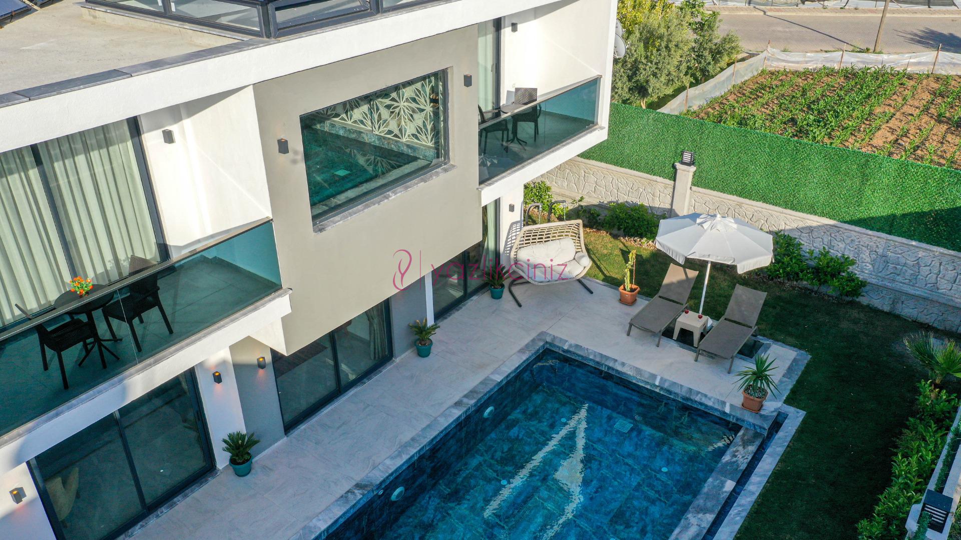Havuz terasında özel yüzme havuzu, şezlonglar, güneş şemsiyesi, bahçe oturma grubu, salıncak bulunmaktadır.