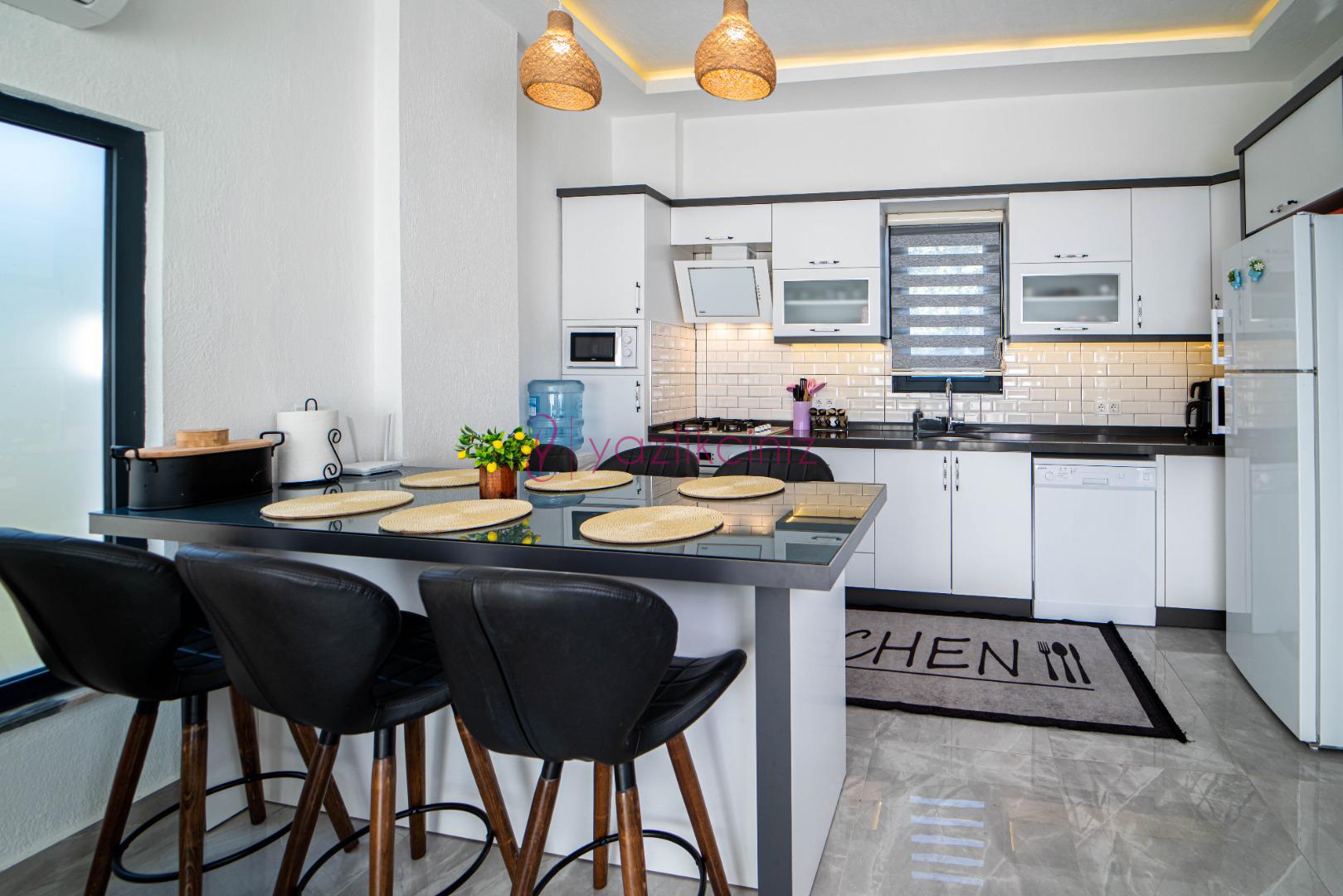 Amerikan mutfakta buzdolabı, bulaşık makinesi, çamaşır makinesi, fırın, 4'lü ocak, elektrikli su ısıtıcısı (kettle), tost makinesi, yemek masası, yemek takımları, çatal ve bıçak takımları, tencere ve tava takımları, bardaklar bulunmaktadır.