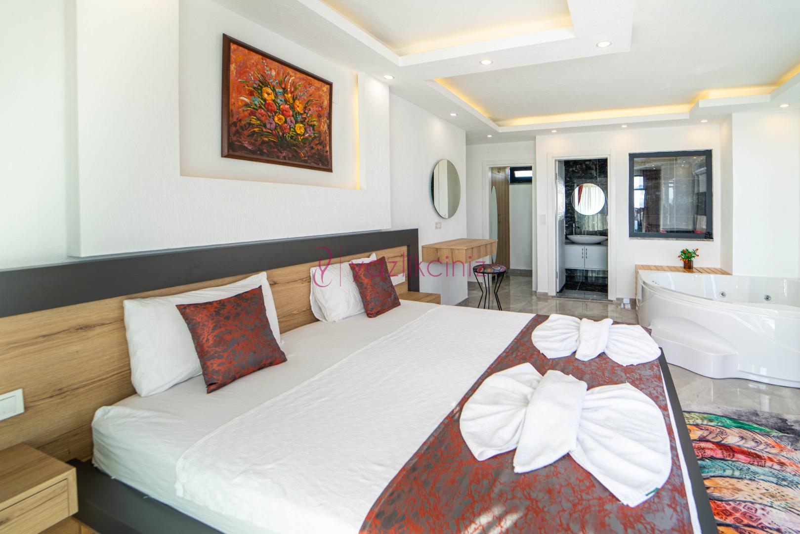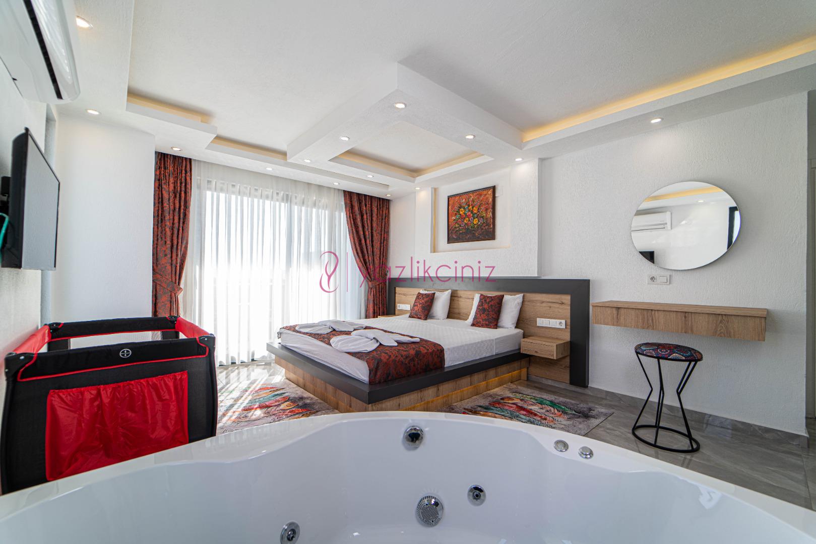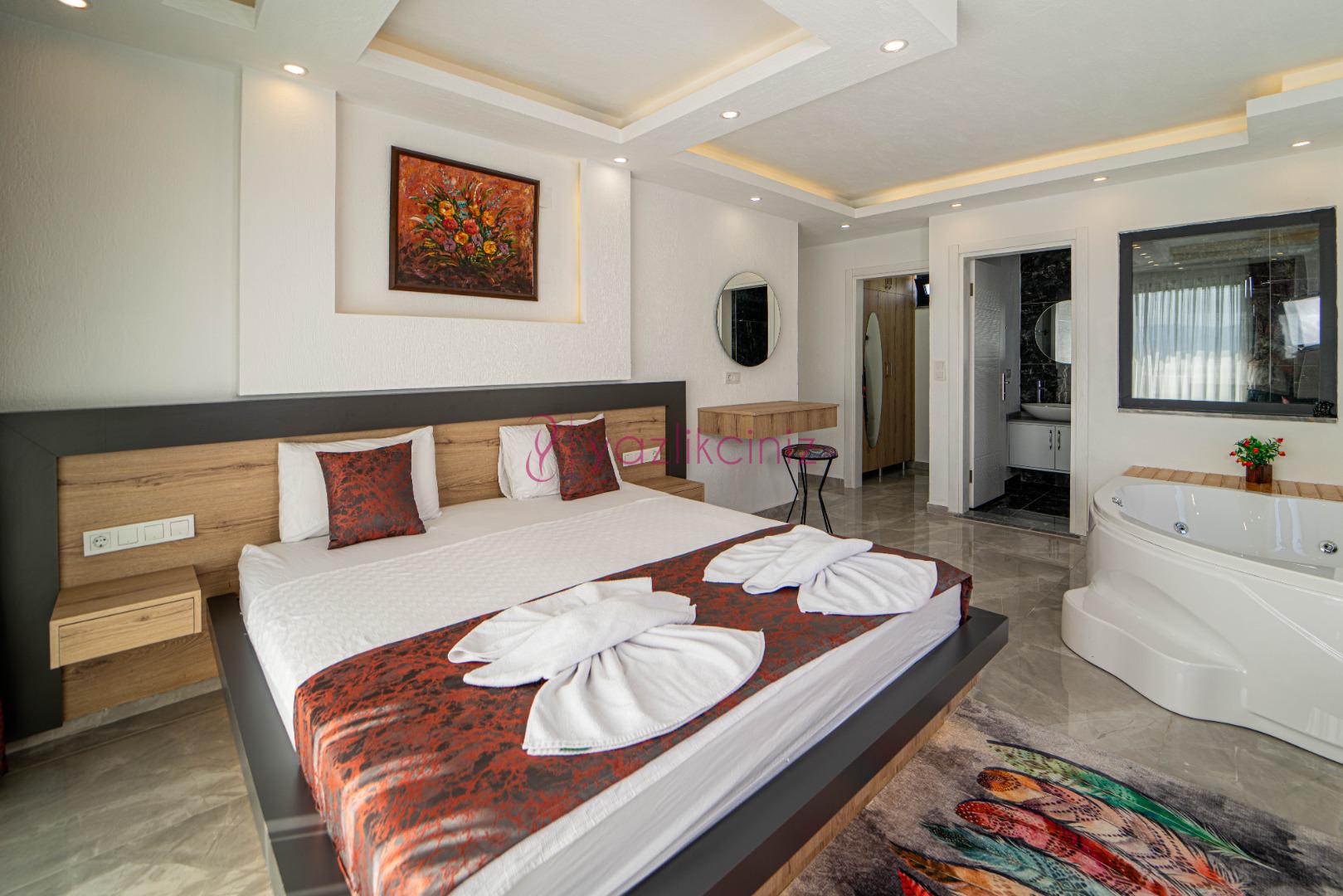 1.Yatak Odası: 1 adet çift kişilik yatak, klima, komodin, makyaj masası, jakuzi, elbise dolabı, banyo ve tuvalet bulunmaktadır.