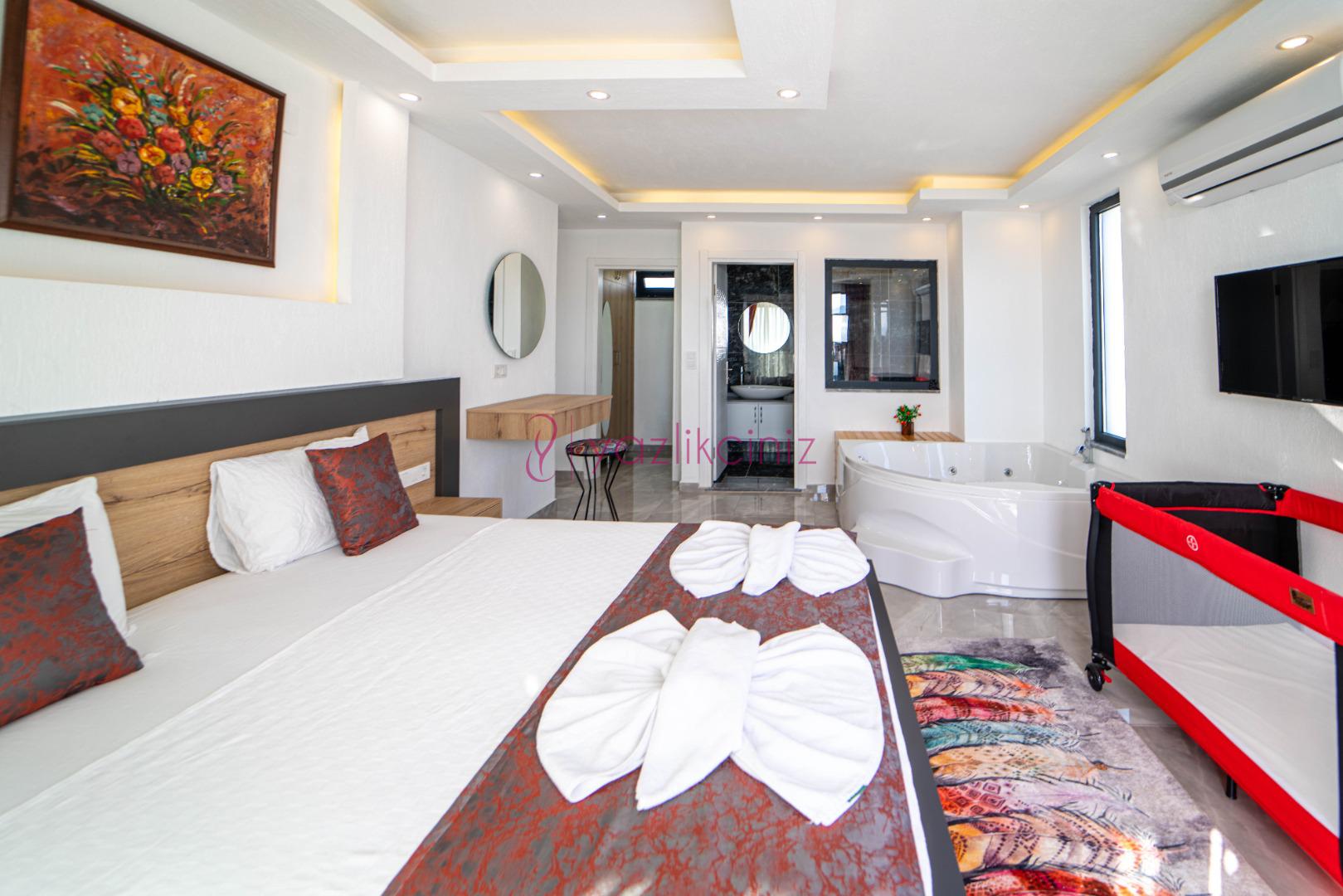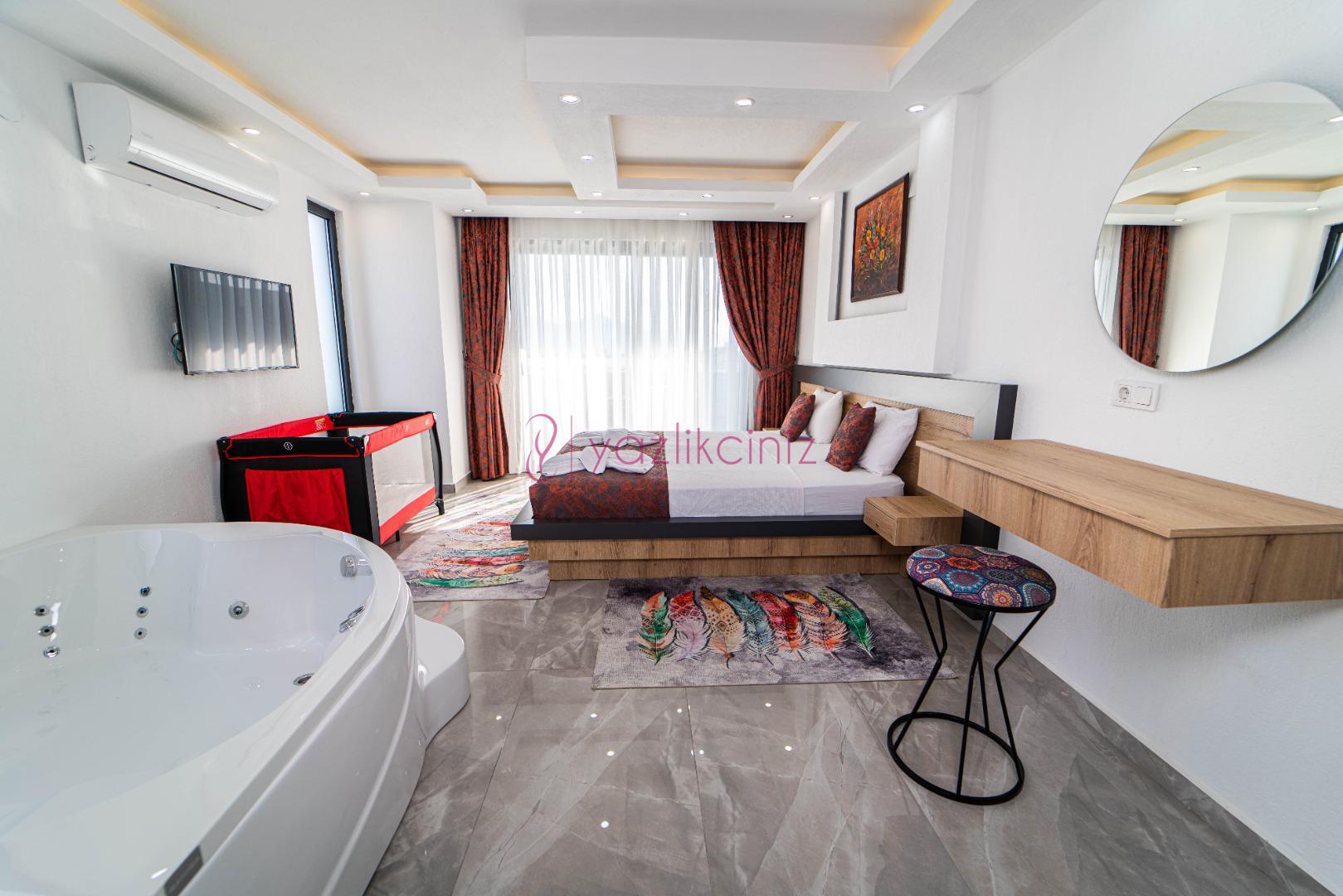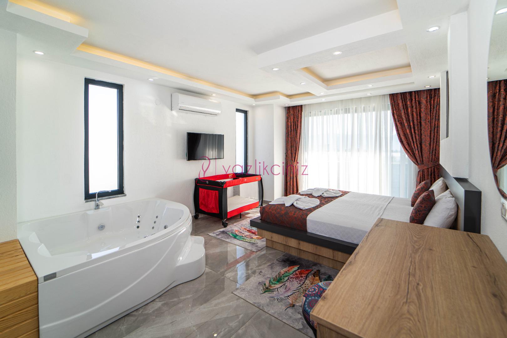 1.Yatak Odası: 1 adet çift kişilik yatak, klima, komodin, makyaj masası, jakuzi, elbise dolabı, banyo ve tuvalet bulunmaktadır.