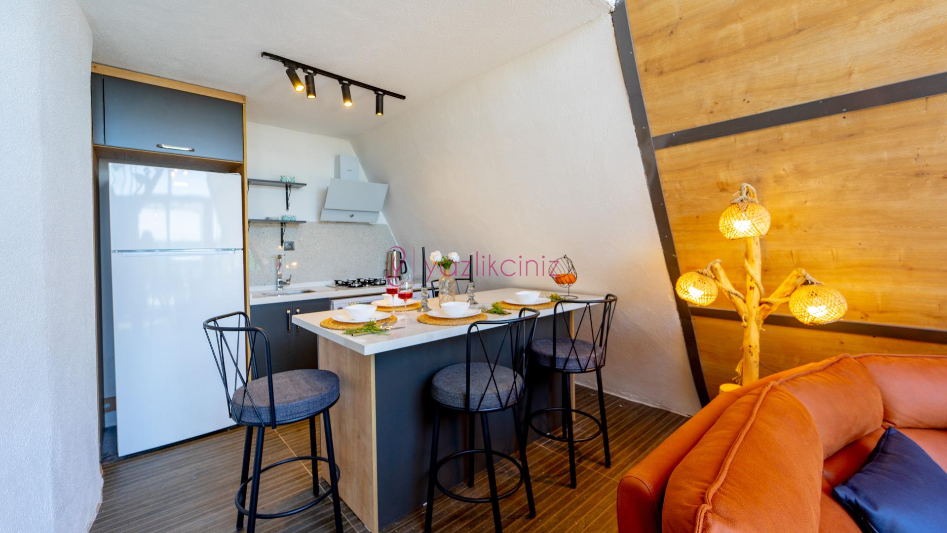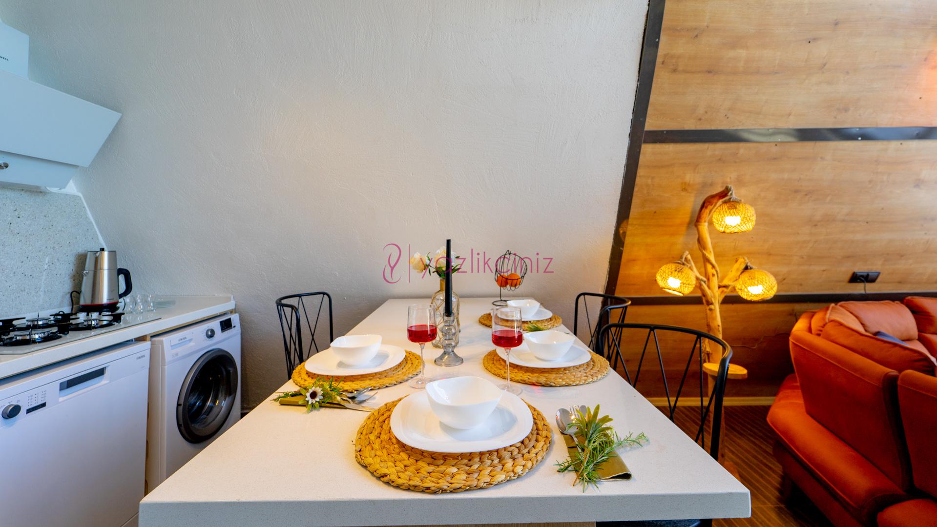 Buzdolabı, fırın, çamaşır makinesi, bulaşık makinesi, 4’lü ocak, elektrikli su ısıtıcısı (kettle), elektrikli süpürge, 4 kişilik yemek takımı, tava, tencereler, çatal ve bıçak takımı ve diğer mutfak malzemesi mevcuttur. Havuz terasına çıkış bulunmaktadır.