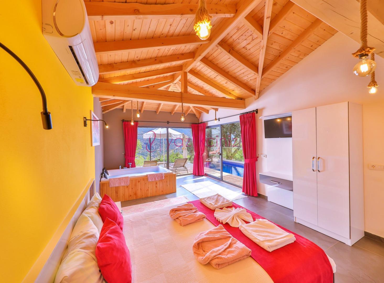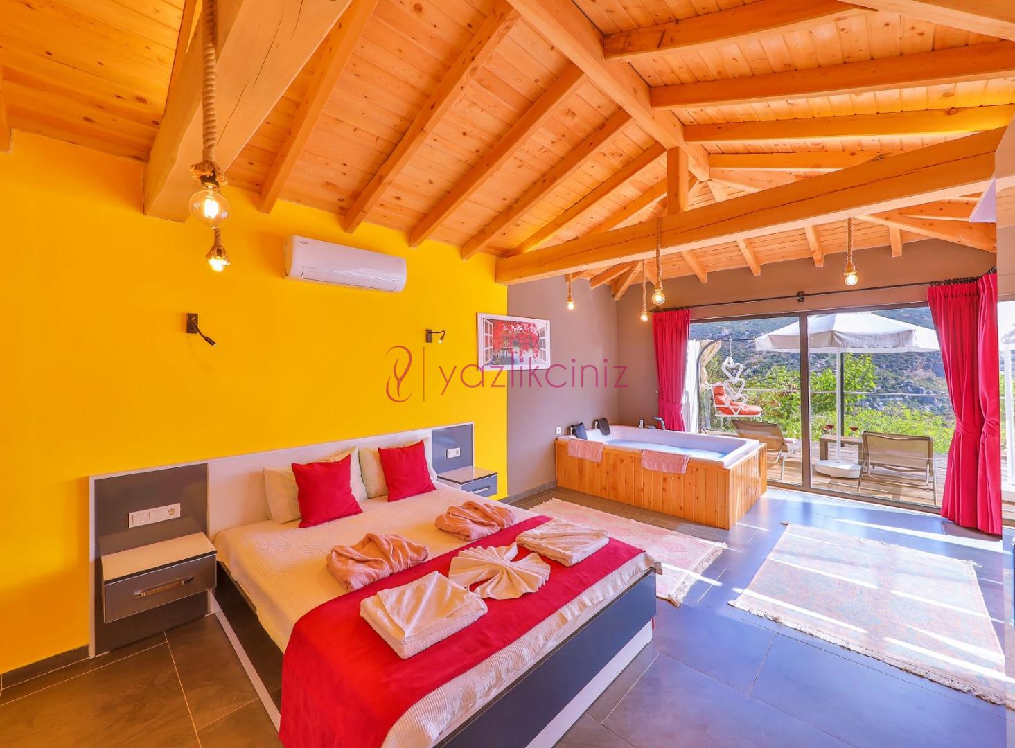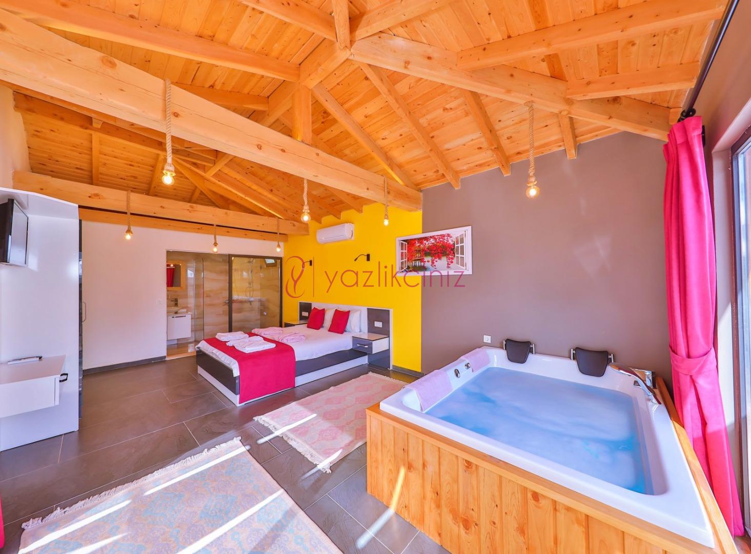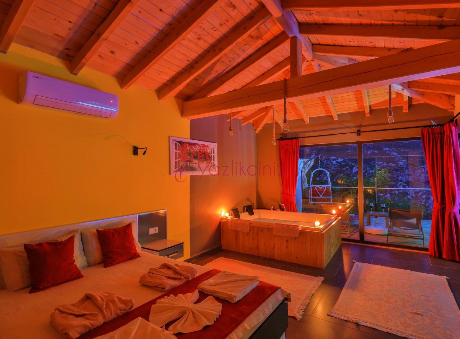 Yatak Odası: 1 adet çift kişilik yatak, komodin, makyaj masası, klima, banyo ve jakuzi, tuvalet ve banyo bulunmaktadır.