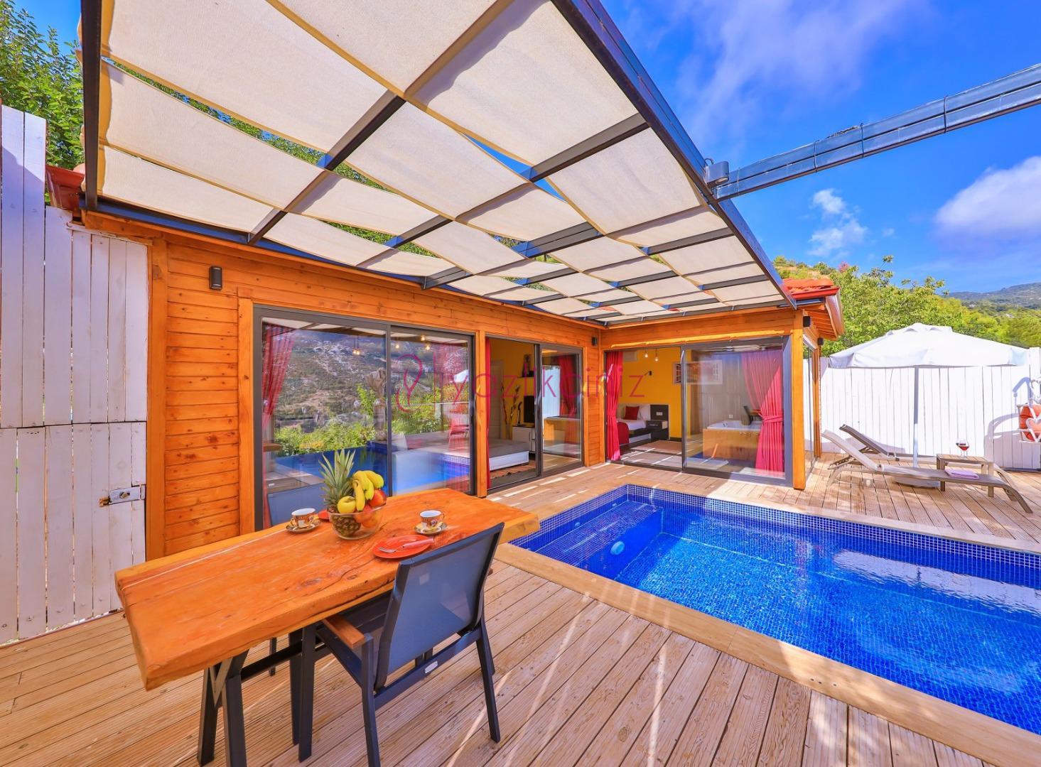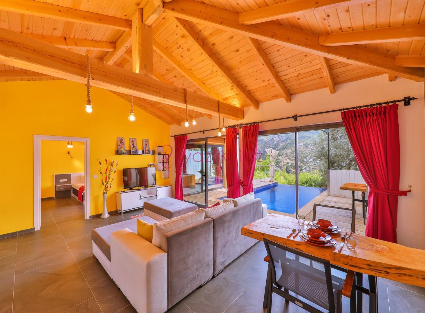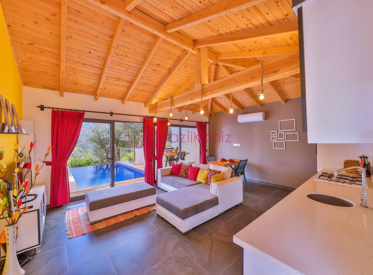 Oturma grubu, uydu alıcı, televizyon, klima, sehpa, havuza çıkış bulunmaktadır.