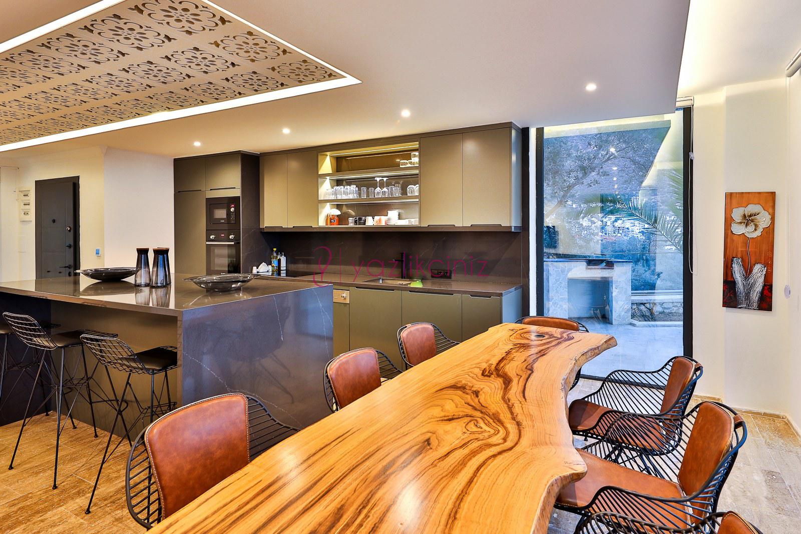 Amerikan mutfak içerisinde; buzdolabi, bulasik makinesi, çamasir makinesi, ankastre firin, mikrodalga firin, ankastre 4’lü ocak, su isitici, su sebili, tencere ve tava takimi, yemek takimi, kasik-çatal takimi, yemek masasi, sandalyeler ve bardaklar bulunmaktadir.