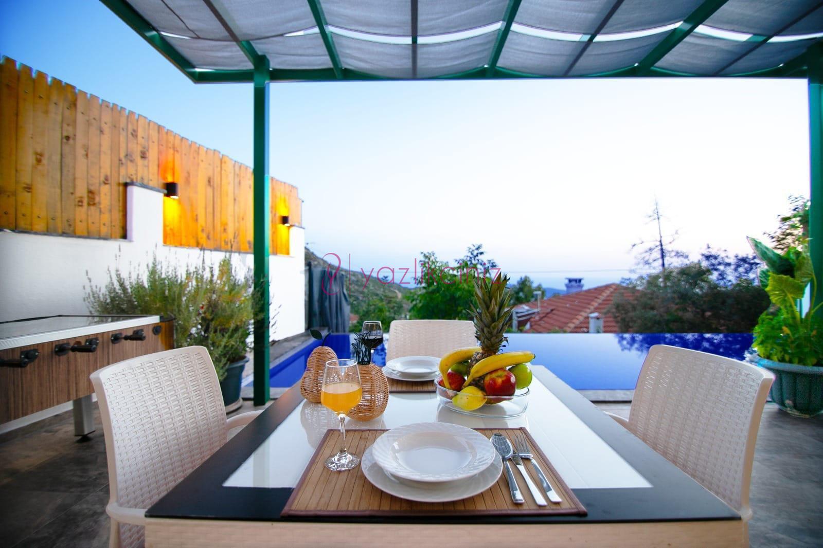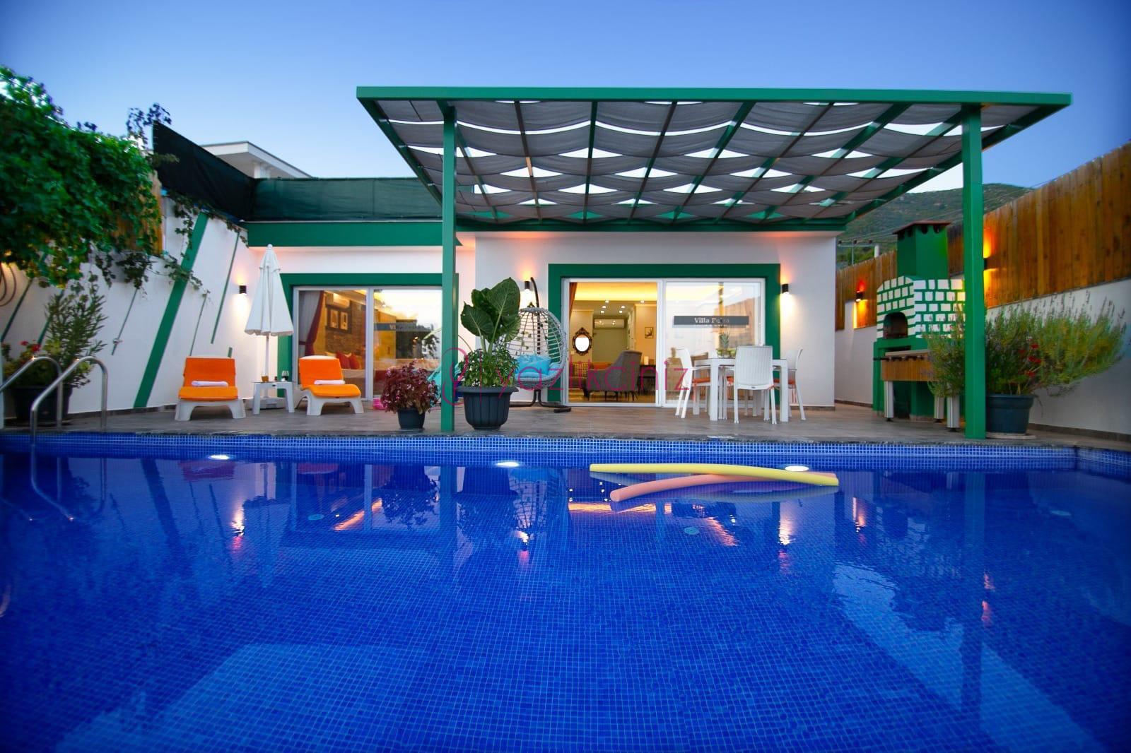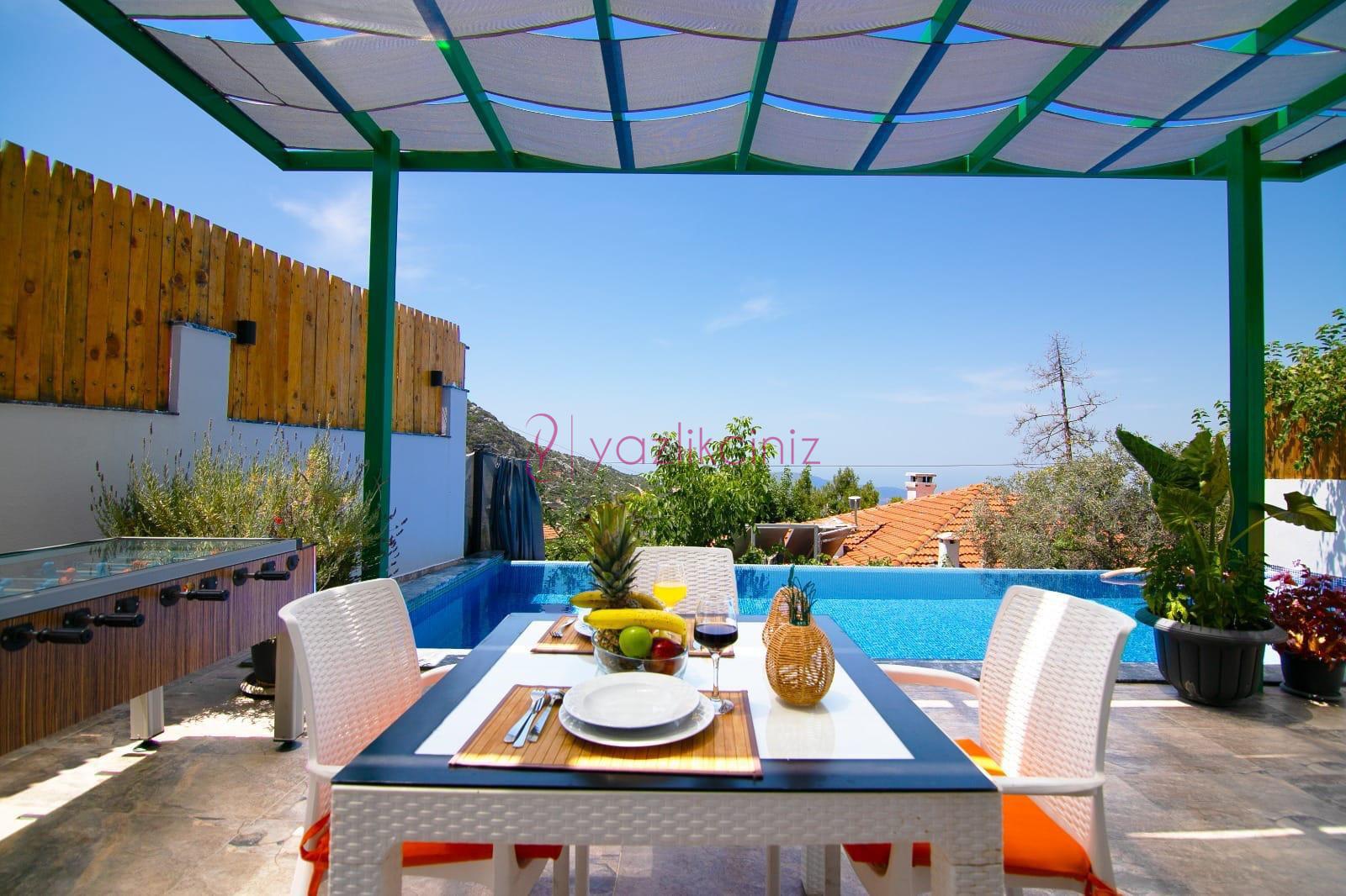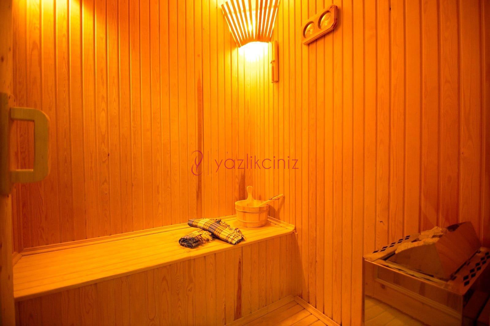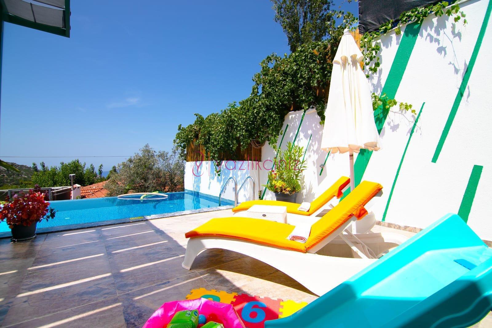 Özel yüzme Havuzu korunaklı olup dışarıdan gözükmemektedir. Bahçe içerisinde şezlonglar, güneş şemsiyeleri, masa ve sandalyeler, barbekü, salıncak, çardak ve oturama alanı bulunmaktadır.
