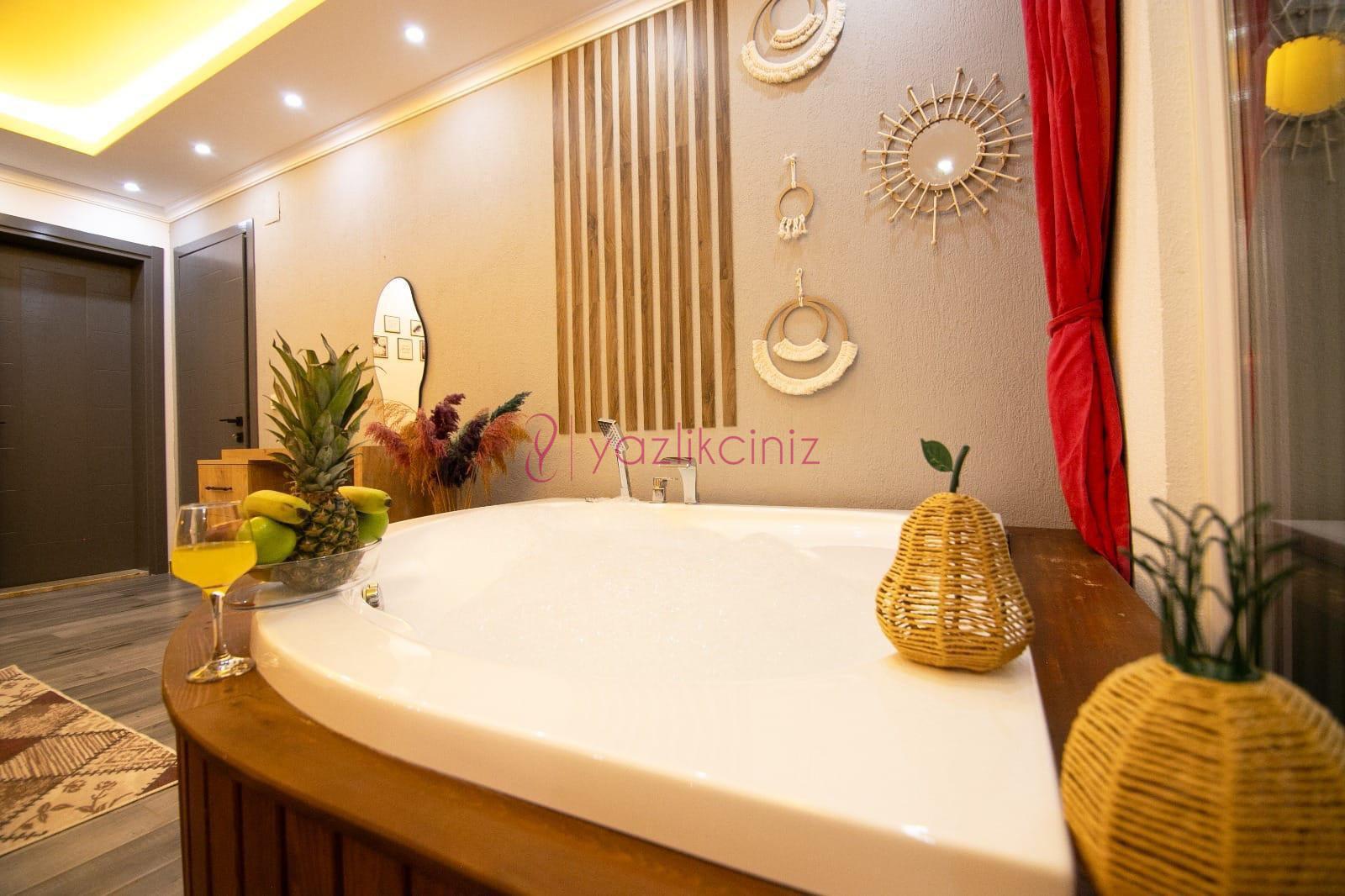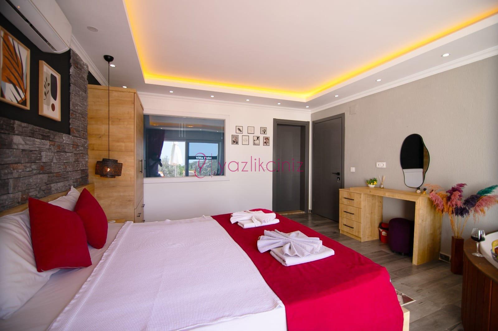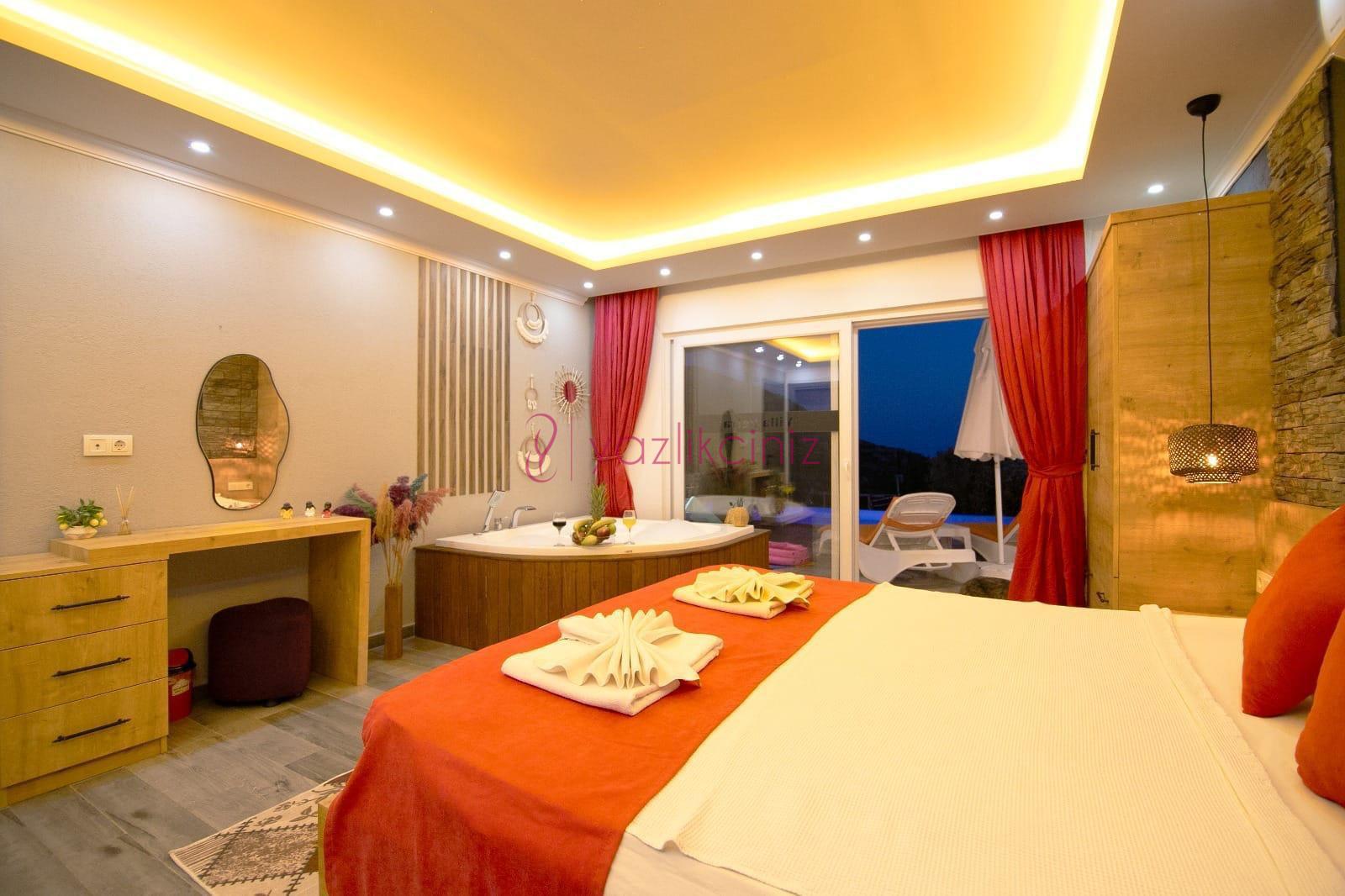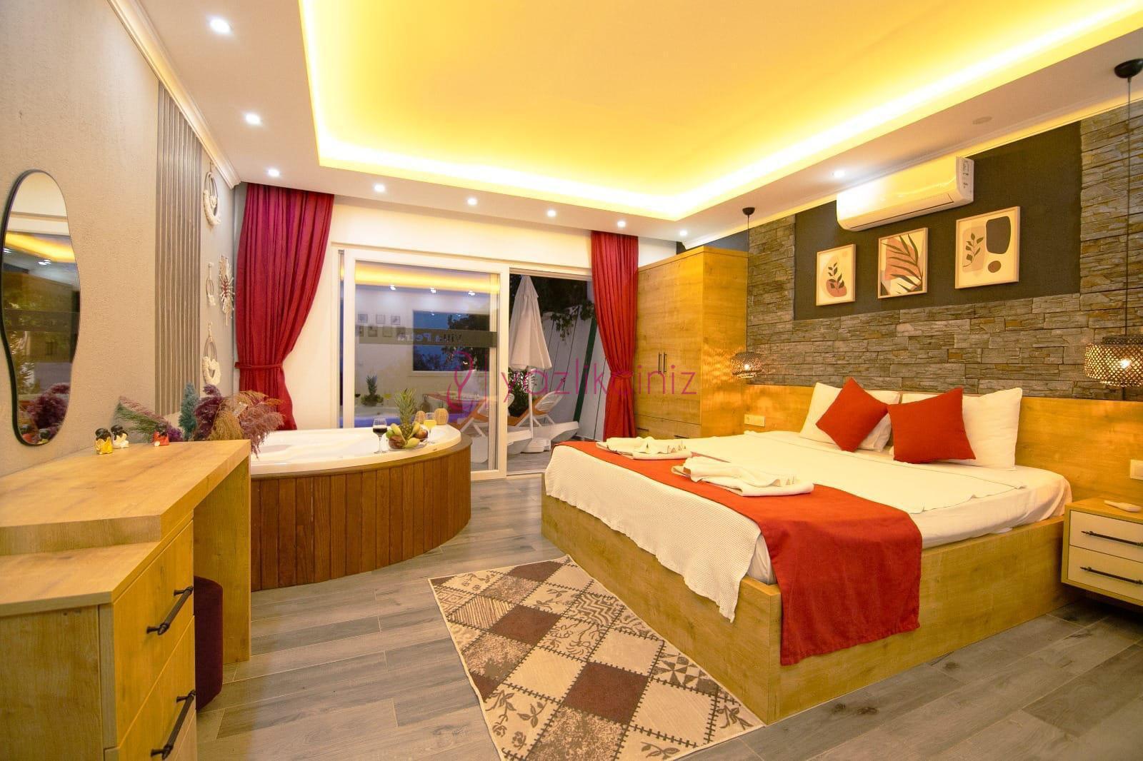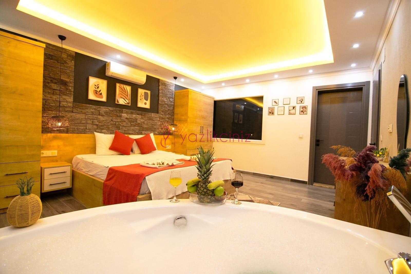 Yatak Odası: Çift kişilik yatak, klima, komodin, elbise dolabı, makyaj masası, jakuzi, banyo ve tuvalet bulunmaktadır.