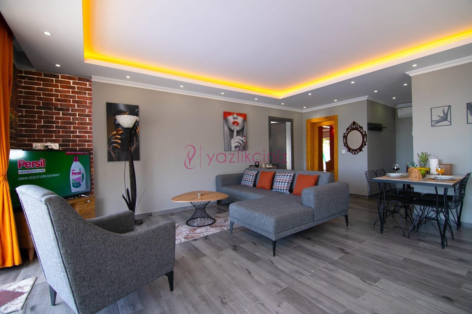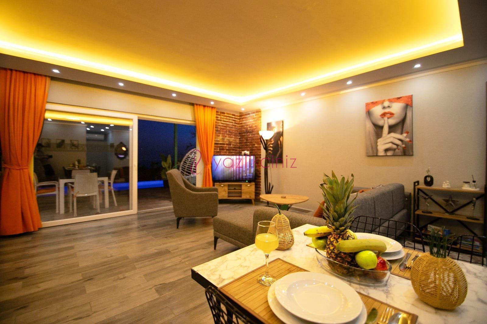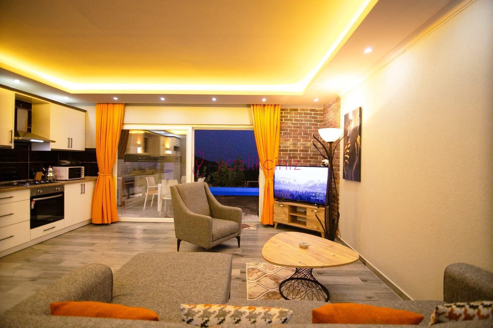Salonumuzda oturma grubu, klima, televizyon, sehpa, uydu alıcı, internet, bulunmaktadır. Salon doğa manzaralıdır. Havuz terasına çıkış yapılabilmektedir.