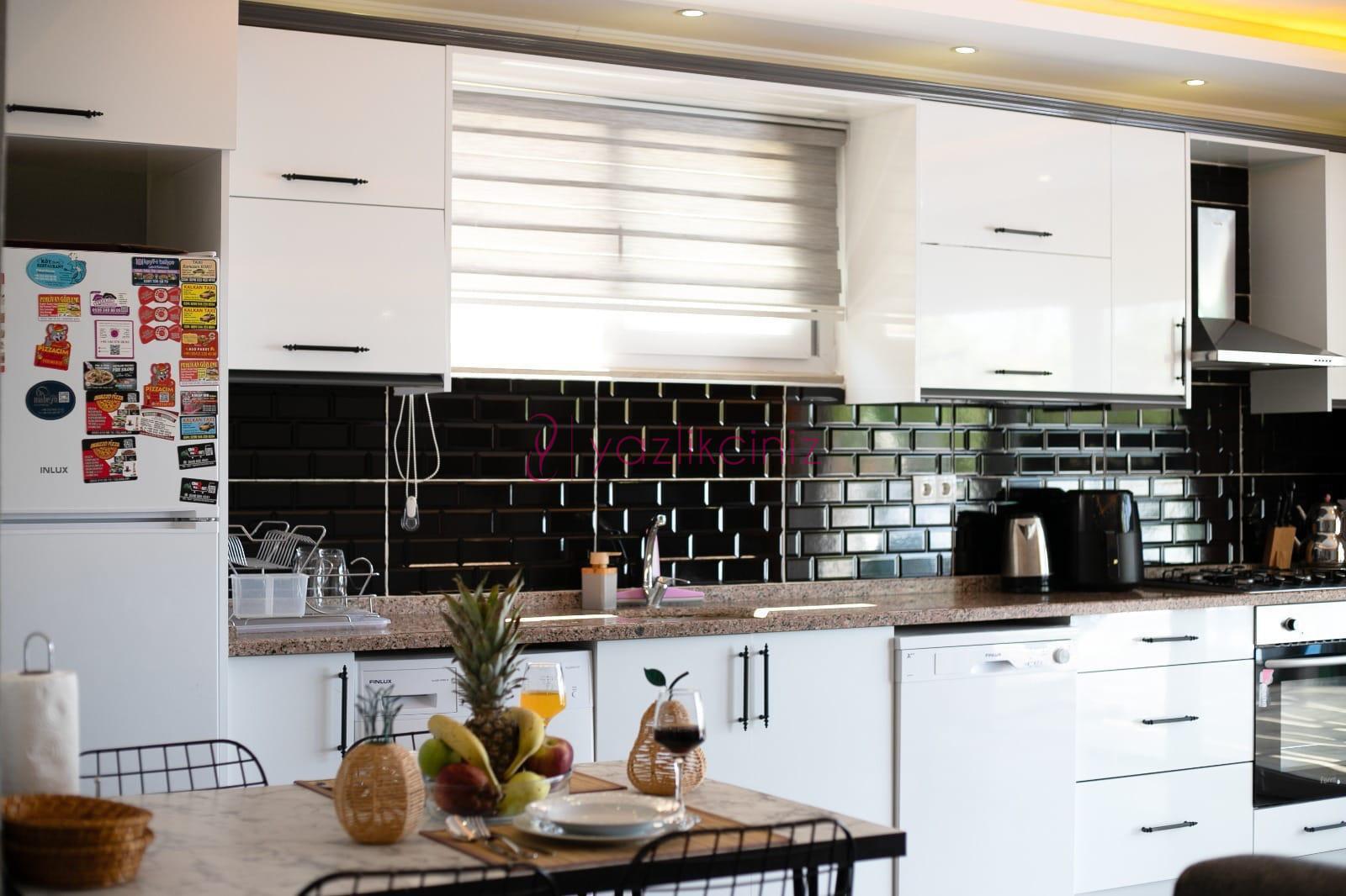 Modern Amerikan mutfakta buzdolabı, bulaşık makinesi, fırın, 4'lü ocak, mikrodalga fırın, elektrikli su ısıtıcısı (kettle), tost makinesi, 2 kişilik yemek masası, yemek takımları, çatal ve bıçak takımları, tencere ve tava takımları, bardaklar bulunmaktadır.