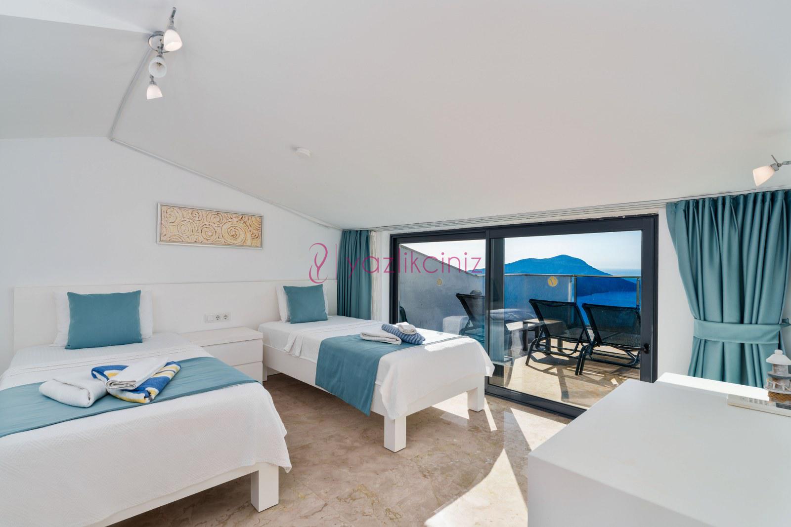 5.Yatak Odası: Süit Yatak Odası, Deniz manzaralı (Teras Katta) 2 Adet tek kişilik yatak, Komodin, Makyaj masası, Klima, Elbise dolabı, Banyo(ortak), Terasa çıkış bulunmaktadır.