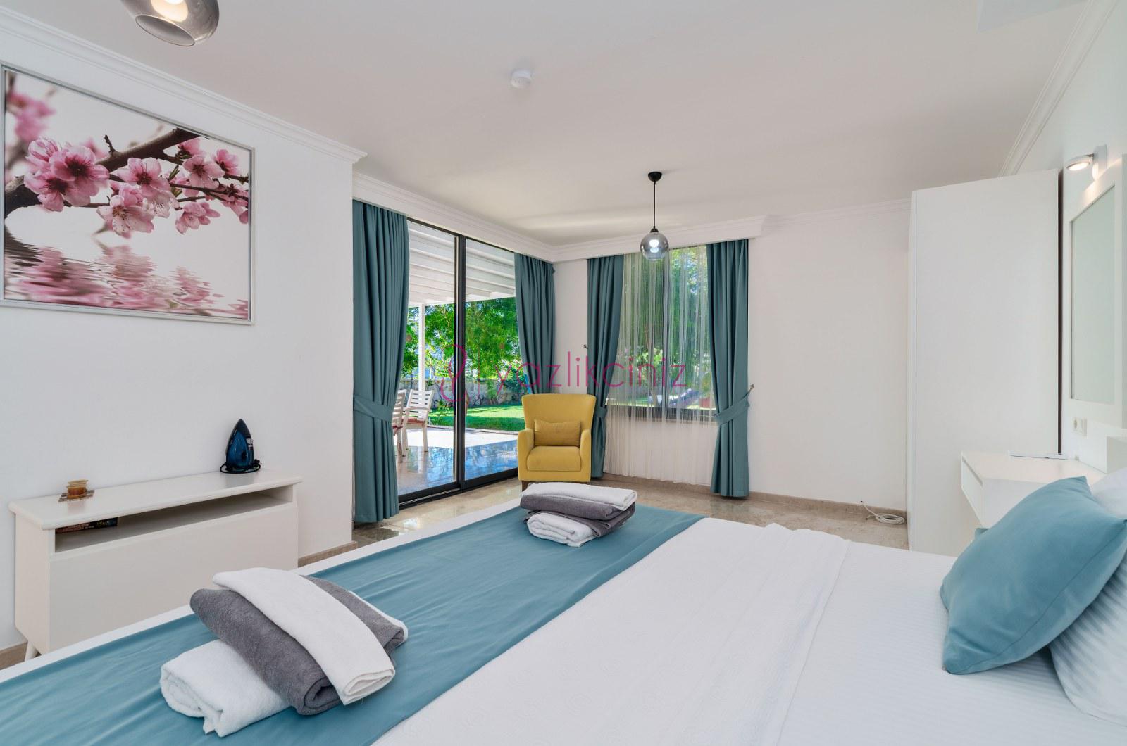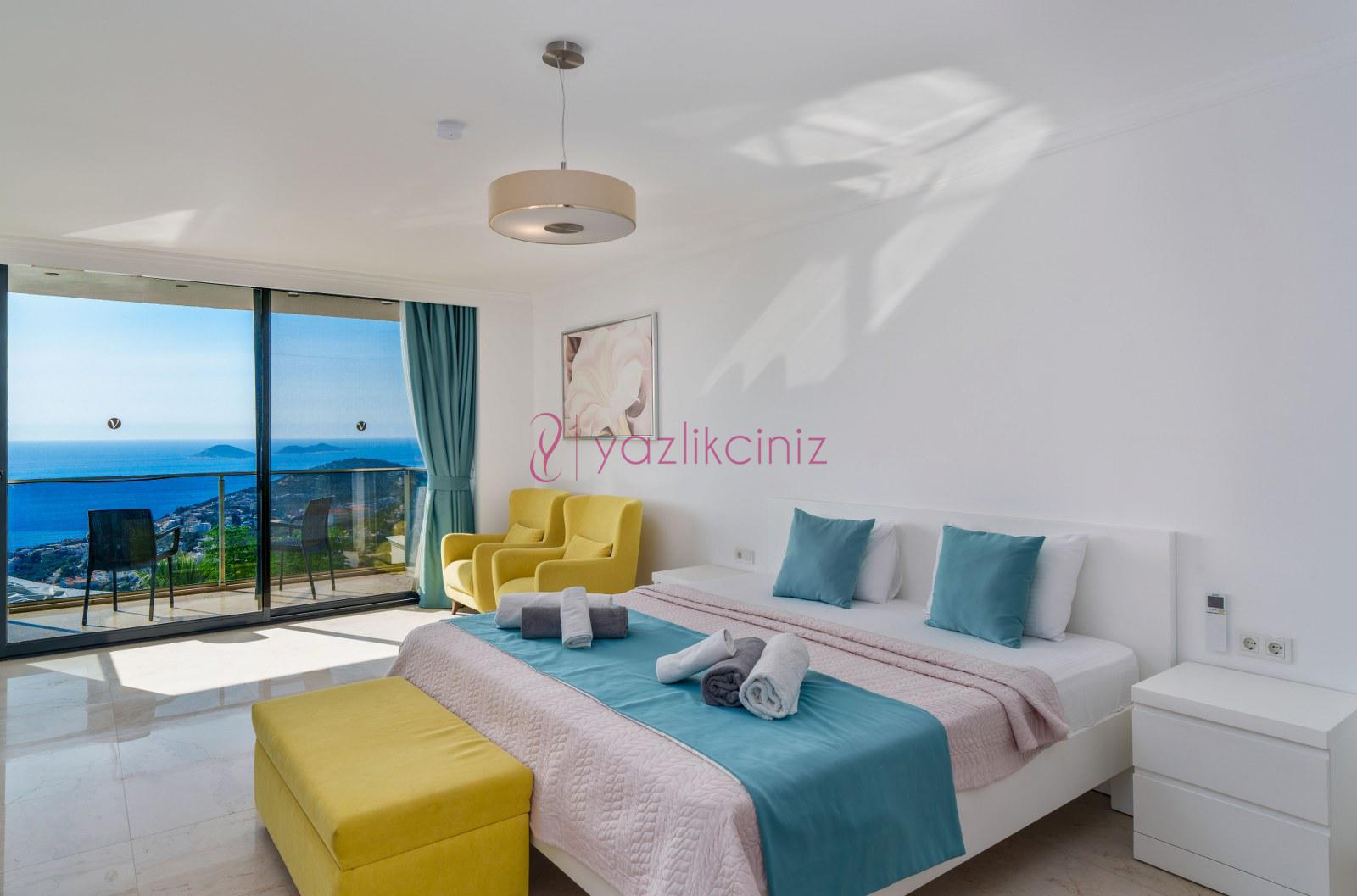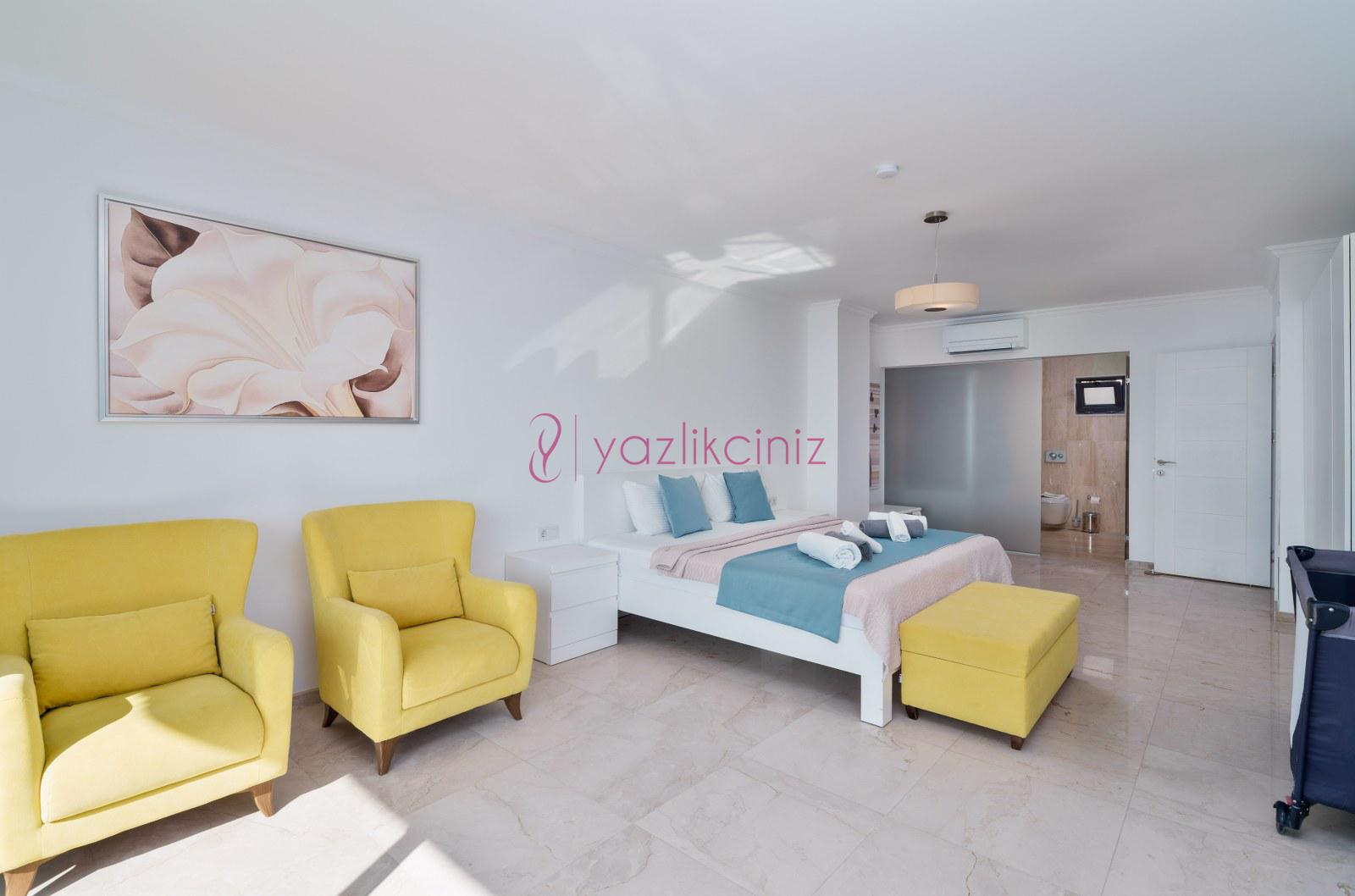 1.Yatak Odası (Aile): Süit Yatak Odası, Deniz manzaralı (Zemin Katta) Çift kişilik yatak, Komodin, Makyaj masası, Klima, Elbise dolabı, Banyo, Havuz terasına çıkış bulunmaktadır.